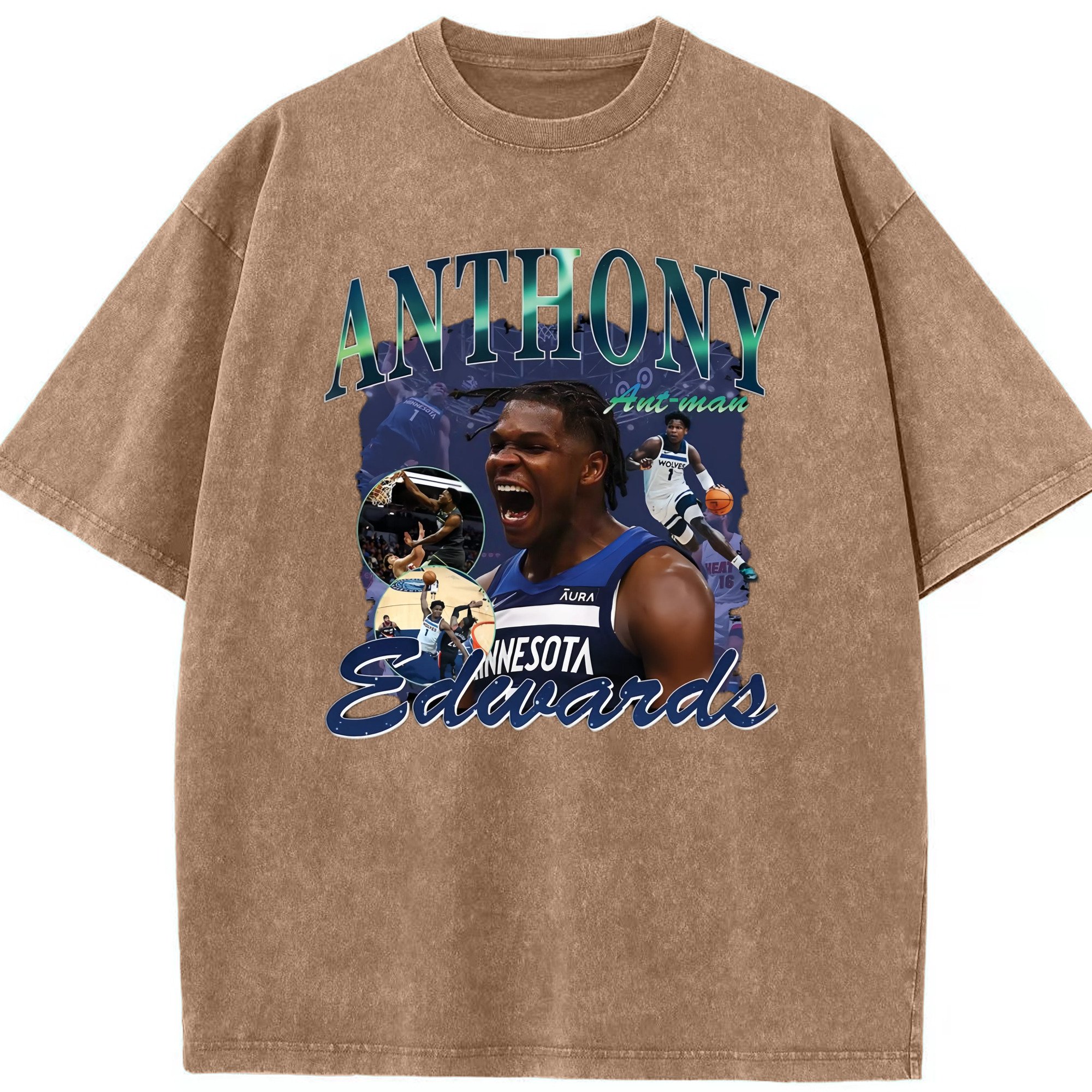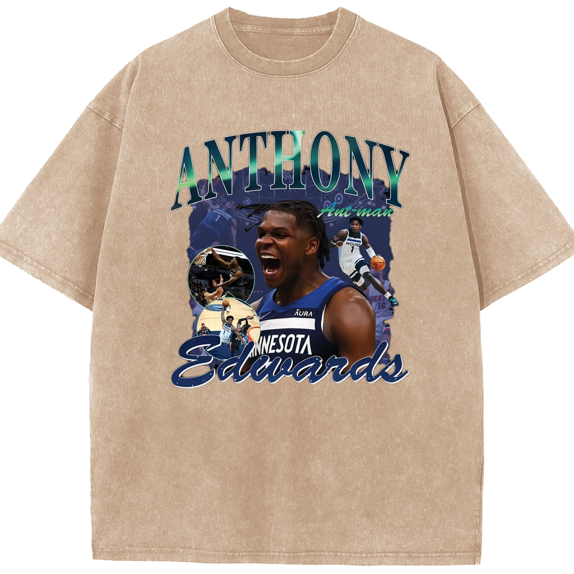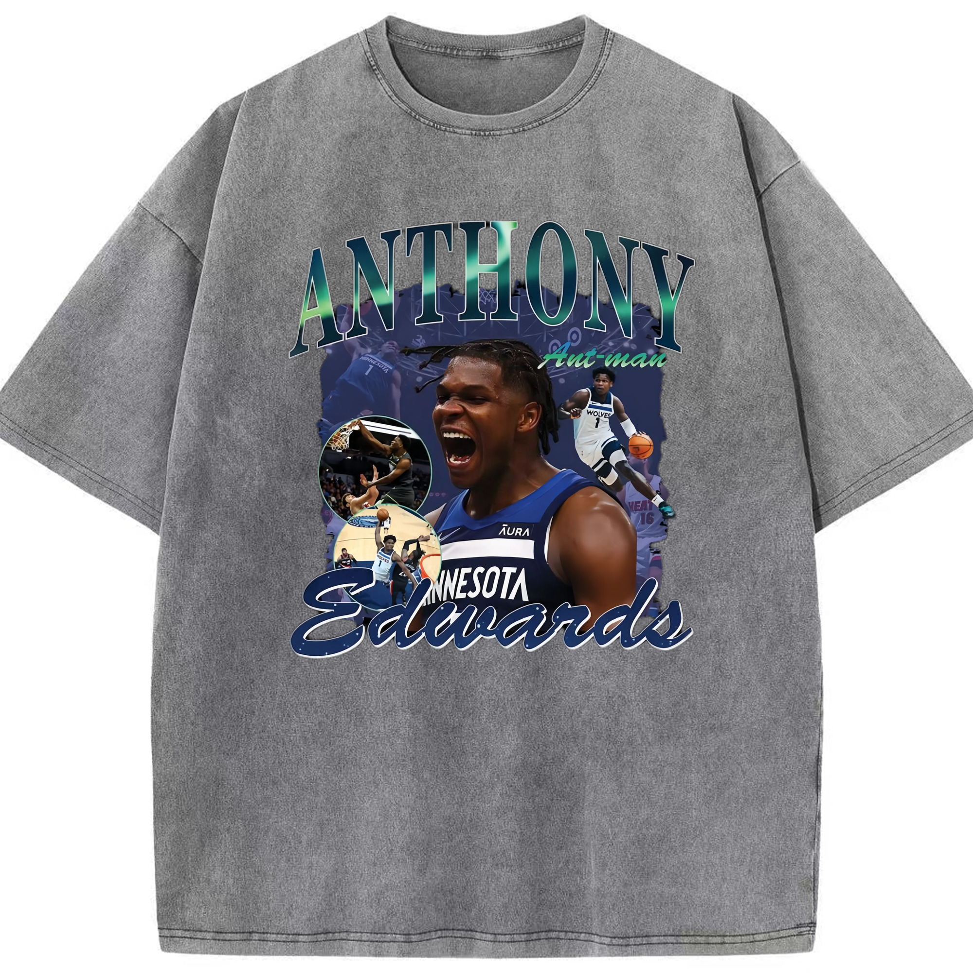 Anthony Edwards Timberwolves collage graphic Tee - Washed Vintage Look 230g Cotton Oversized T-Shirt With Front Heat Transfer Print – Soft, Lightweight, Stylish Fit – Comfortable Casual Wear For Sports & Everyday Use