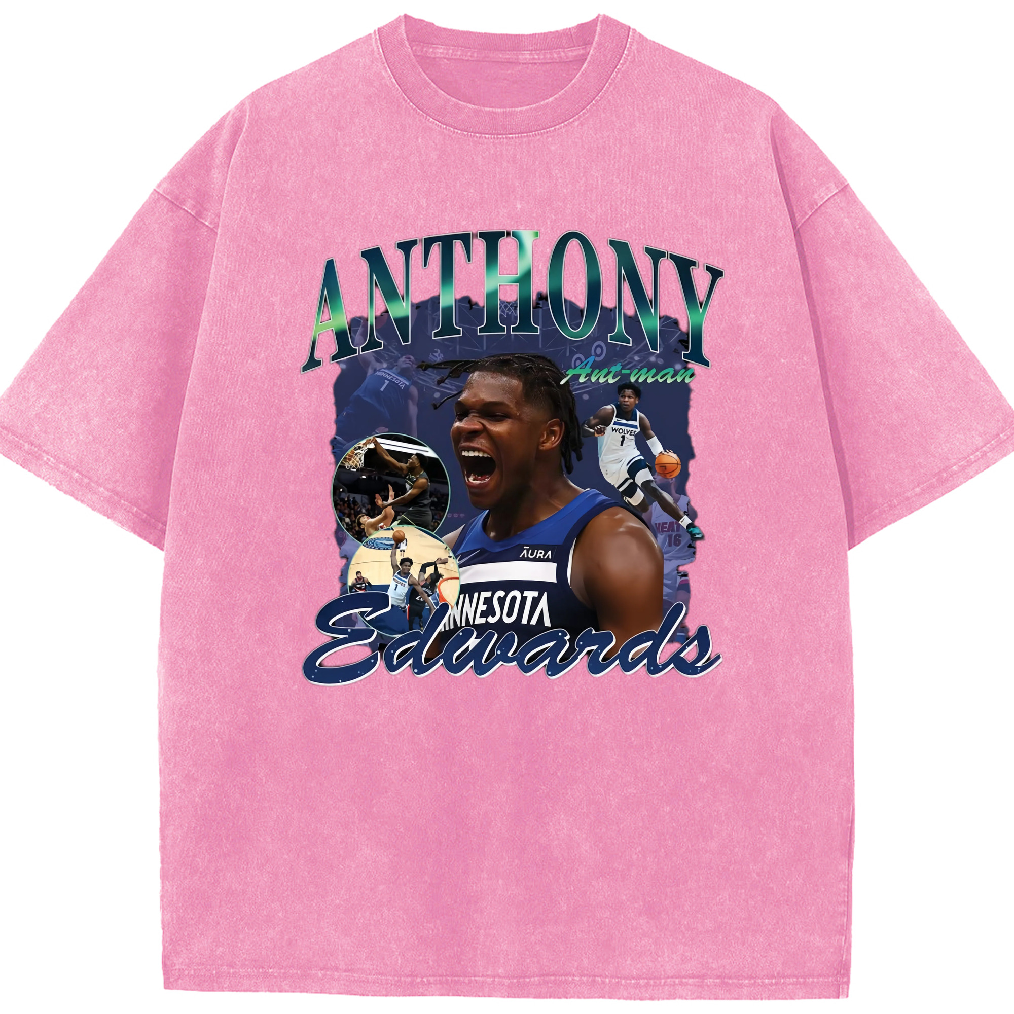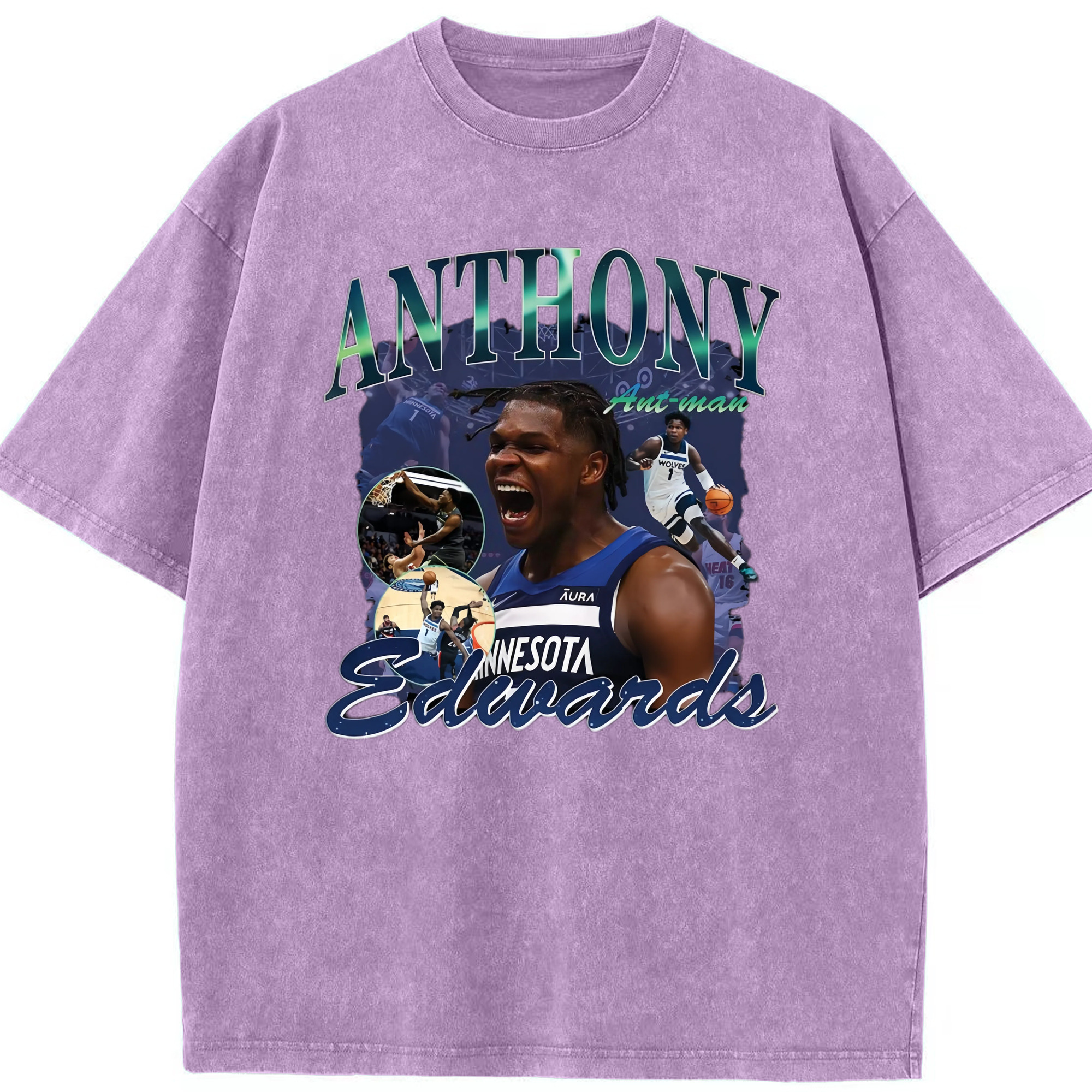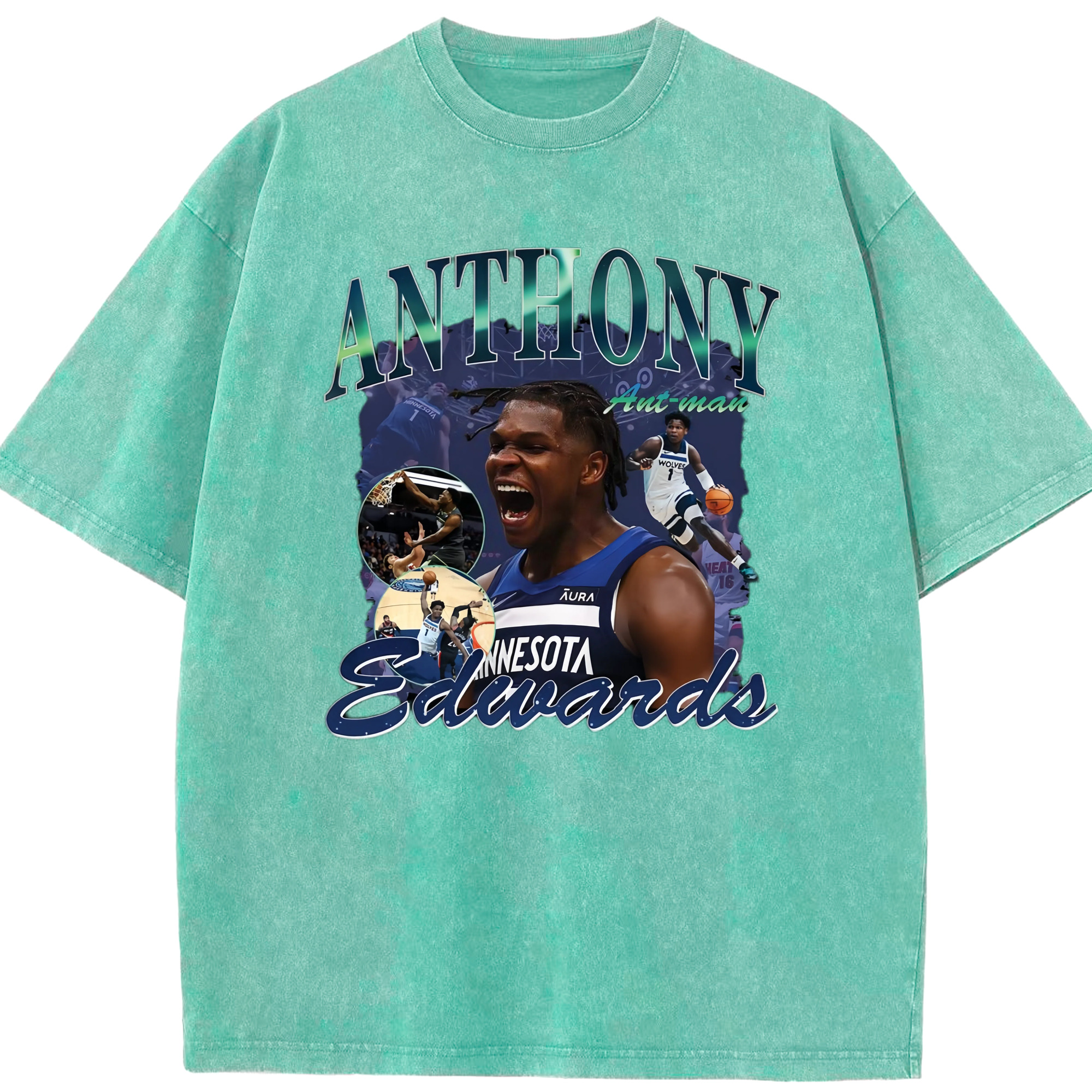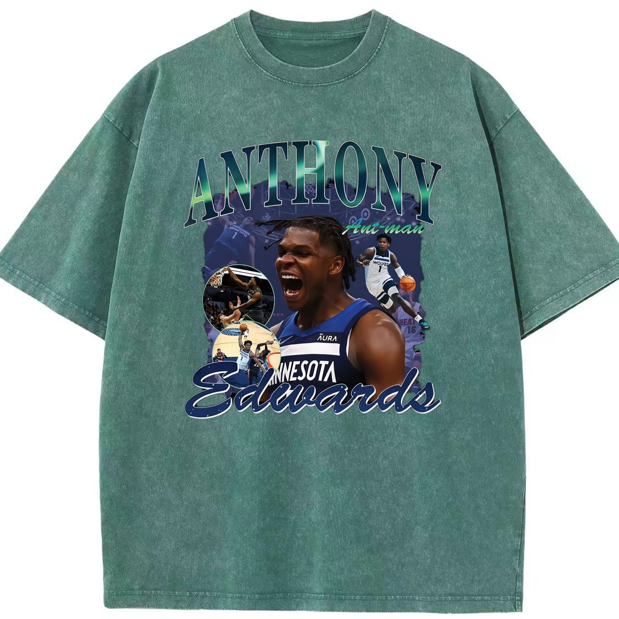 Anthony Edwards Timberwolves collage graphic Tee - Washed Vintage Look 230g Cotton Oversized T-Shirt With Front Heat Transfer Print – Soft, Lightweight, Stylish Fit – Comfortable Casual Wear For Sports & Everyday Use