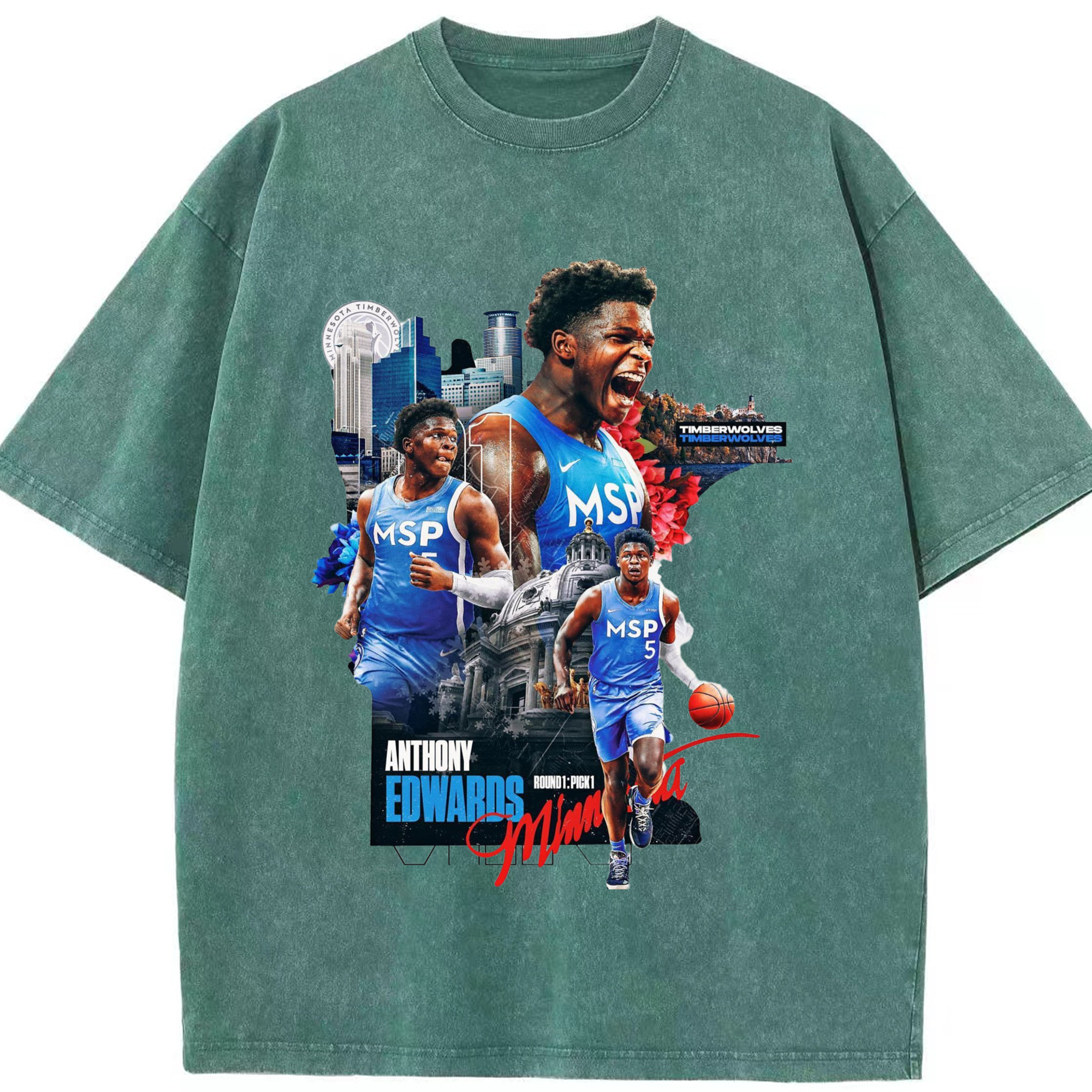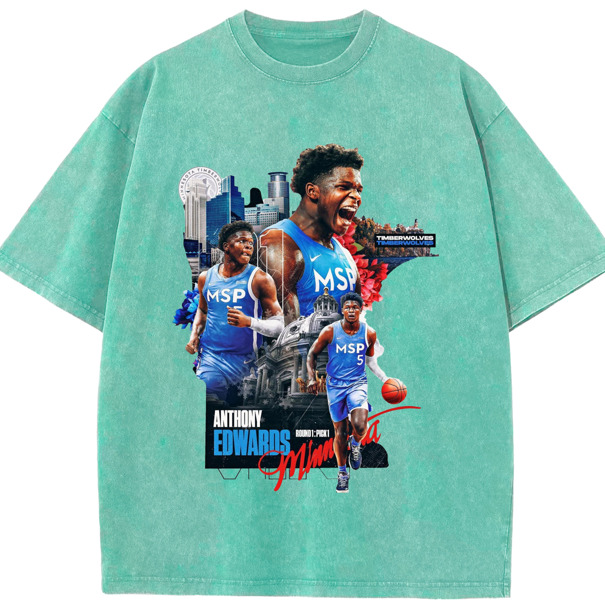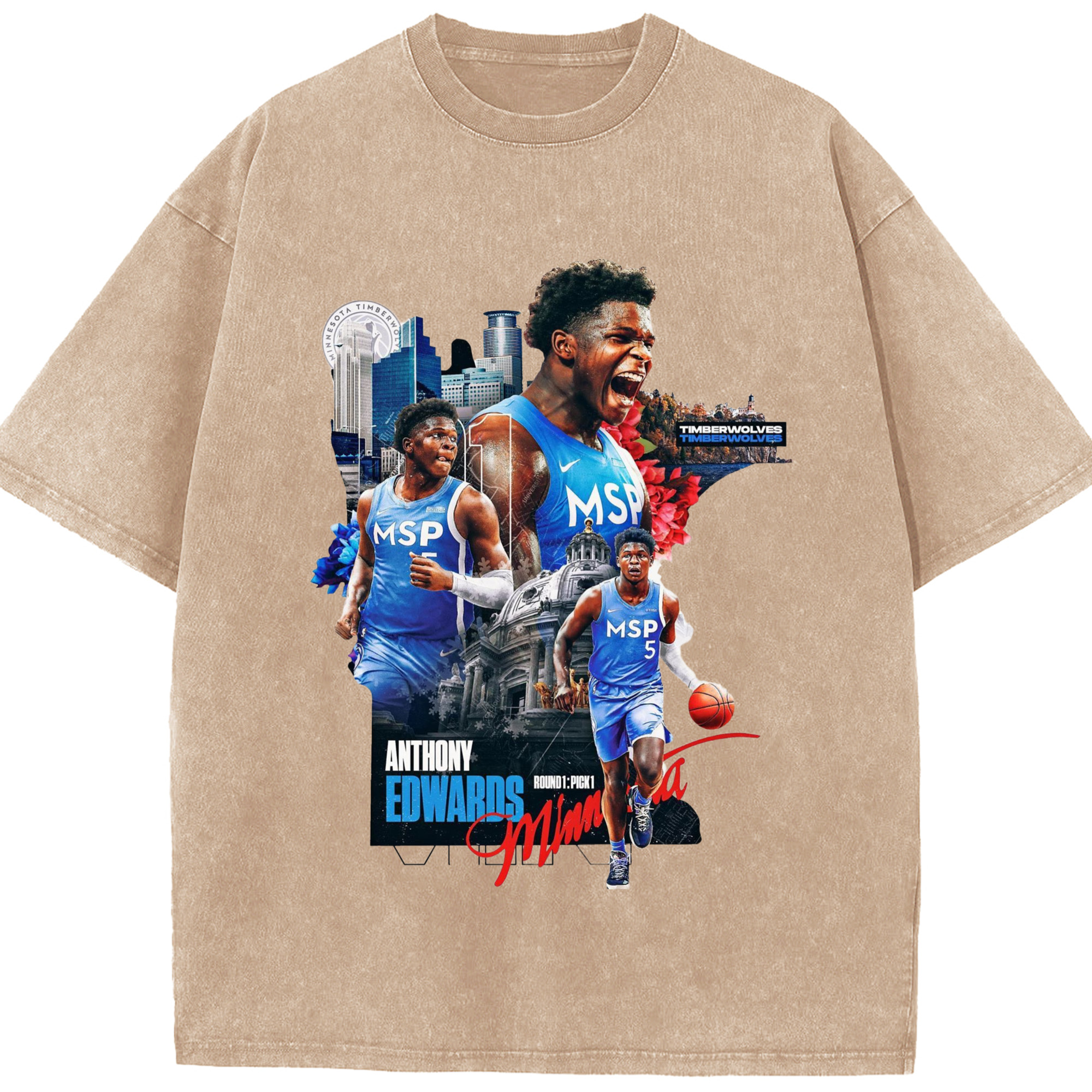 Anthony Edwards Timberwolves Urban Background graphic T-shirt - Washed Vintage Look 230g Cotton Oversized T-Shirt With Front Heat Transfer Print – Soft, Lightweight, Stylish Fit – Comfortable Casual Wear For Sports & Everyday Use