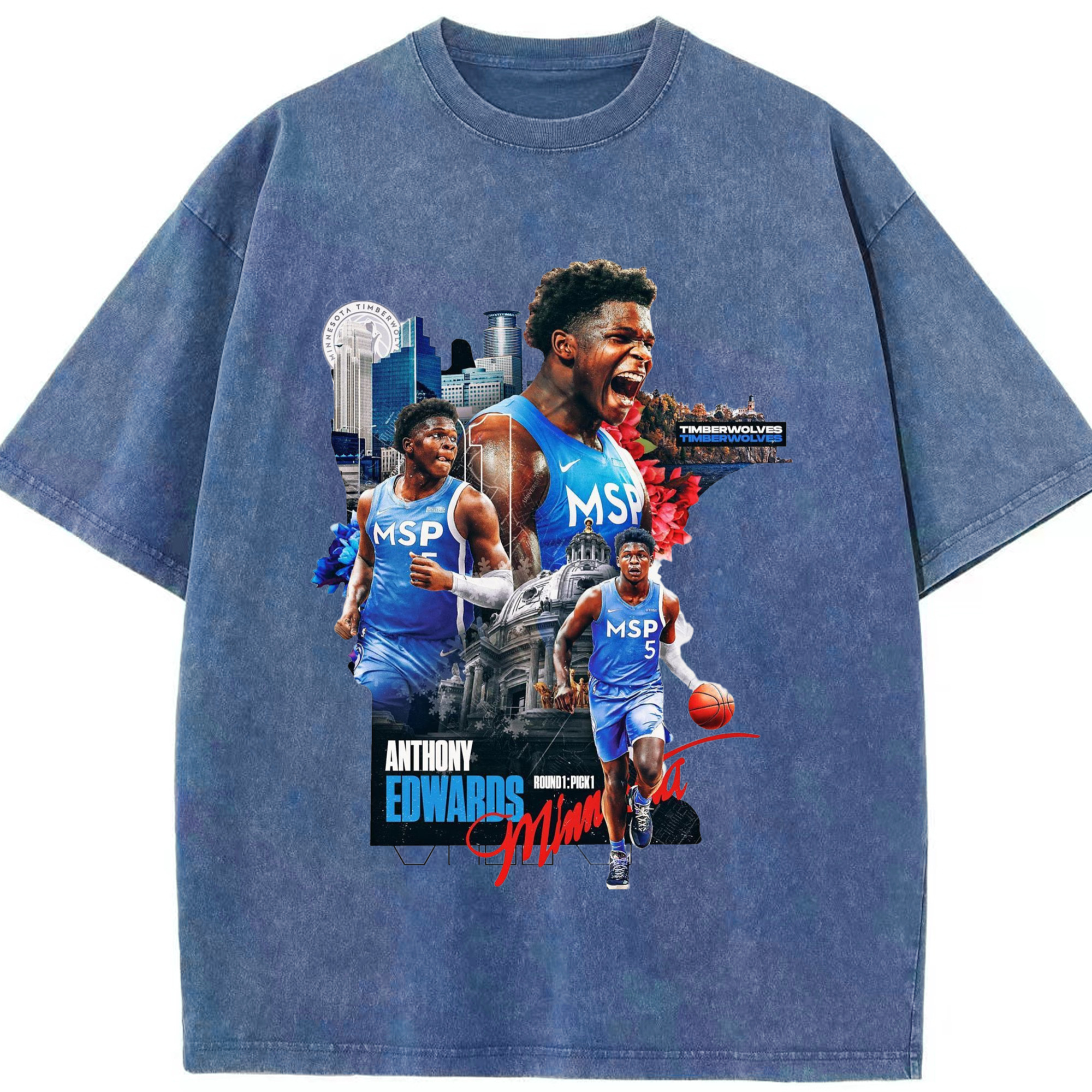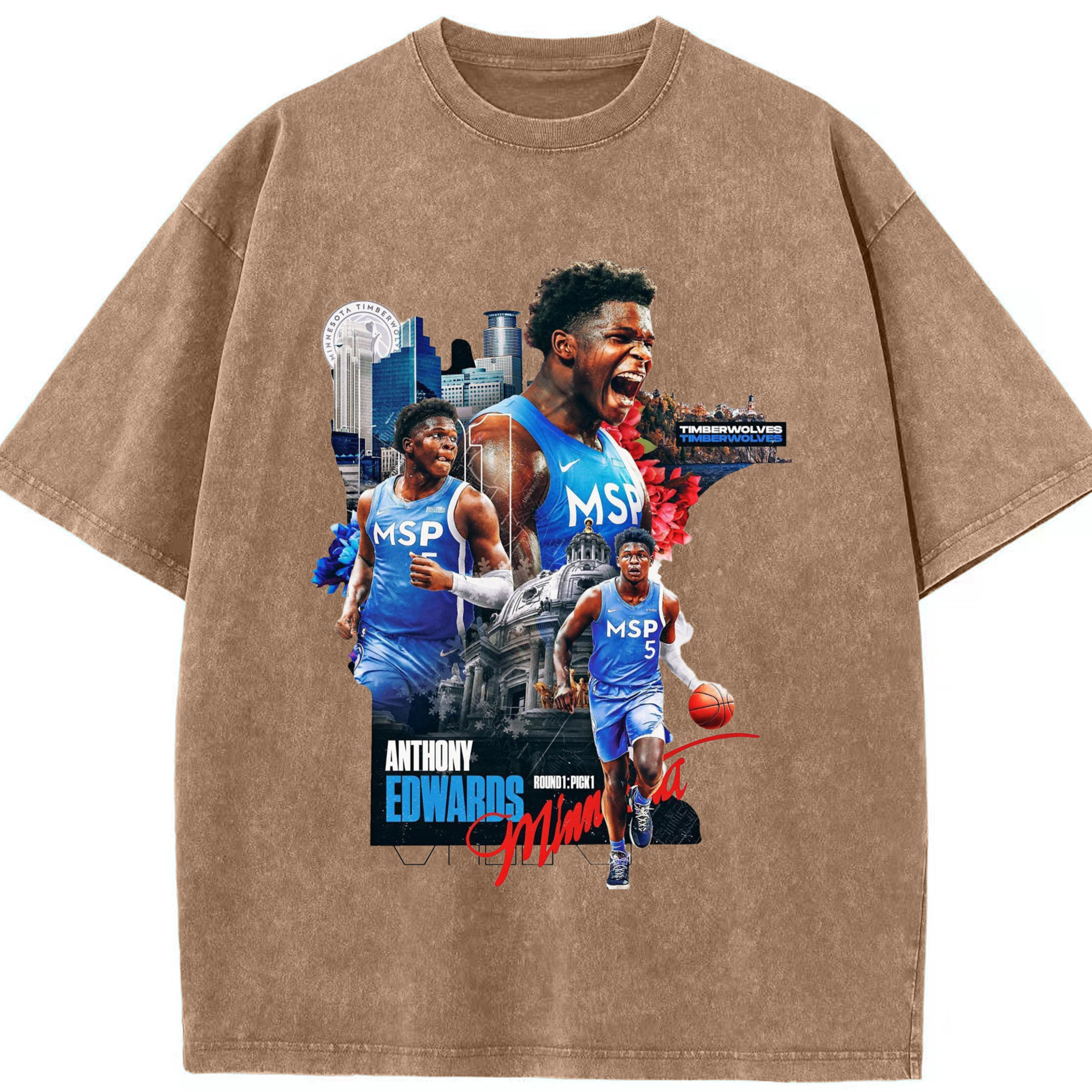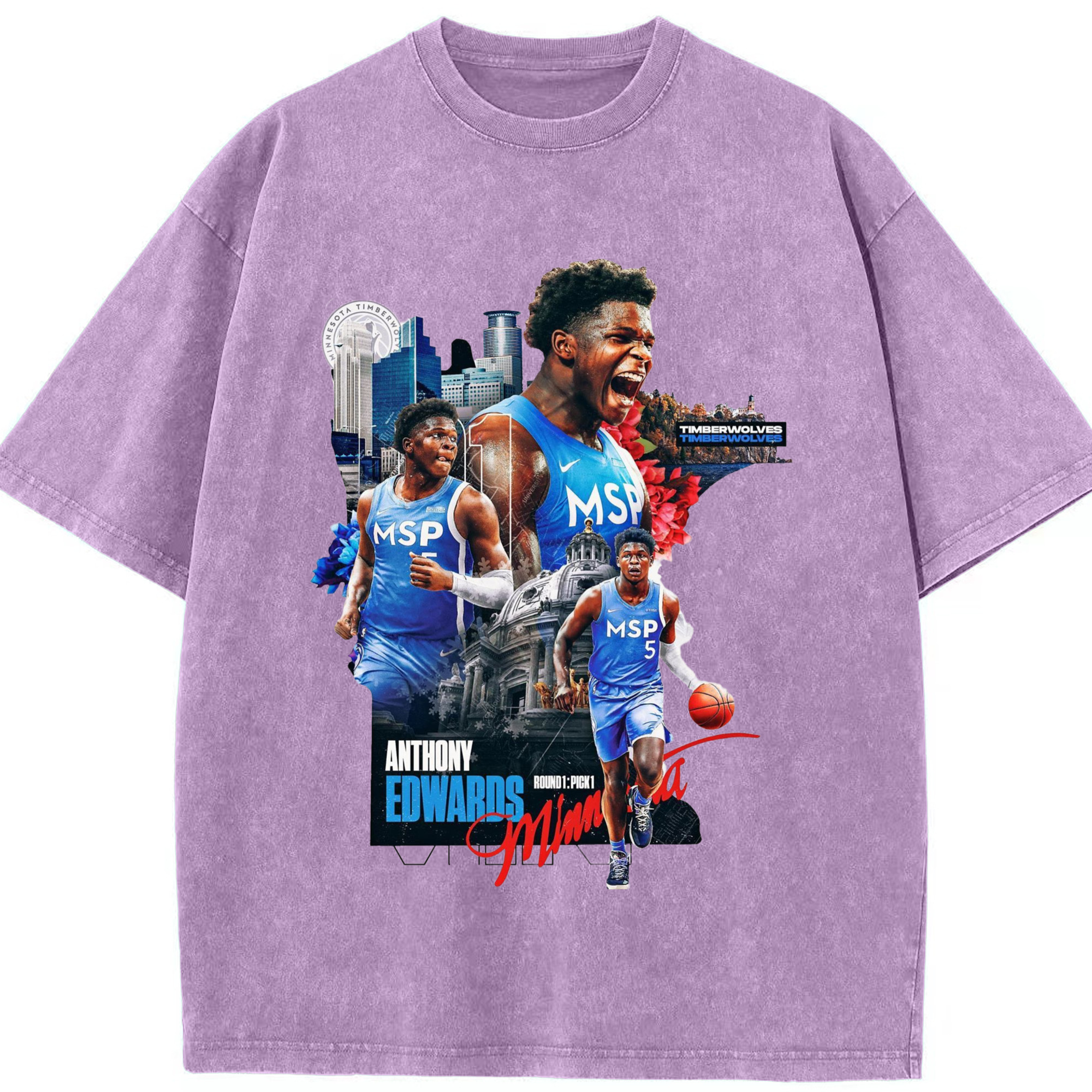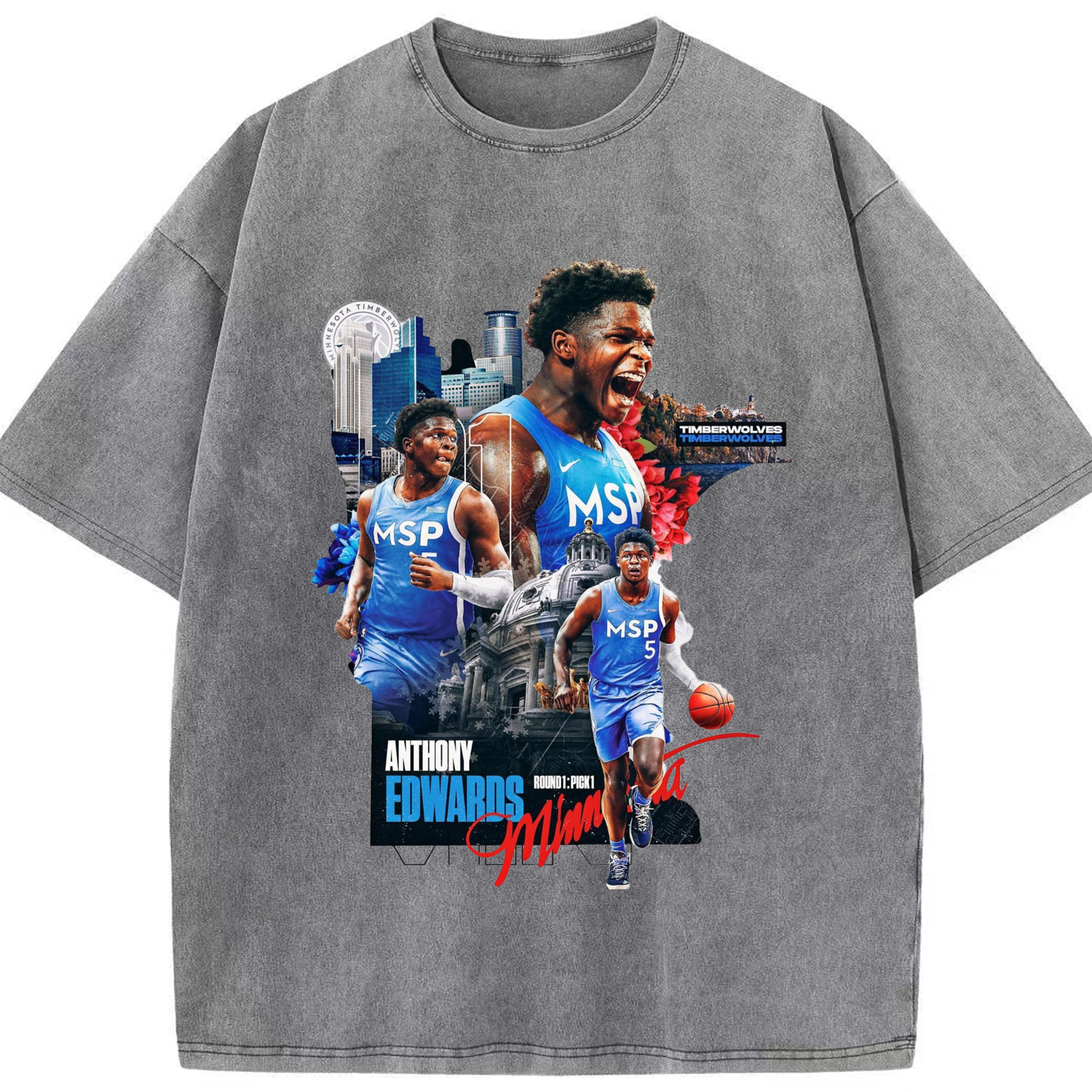 Anthony Edwards Timberwolves Urban Background graphic T-shirt - Washed Vintage Look 230g Cotton Oversized T-Shirt With Front Heat Transfer Print – Soft, Lightweight, Stylish Fit – Comfortable Casual Wear For Sports & Everyday Use