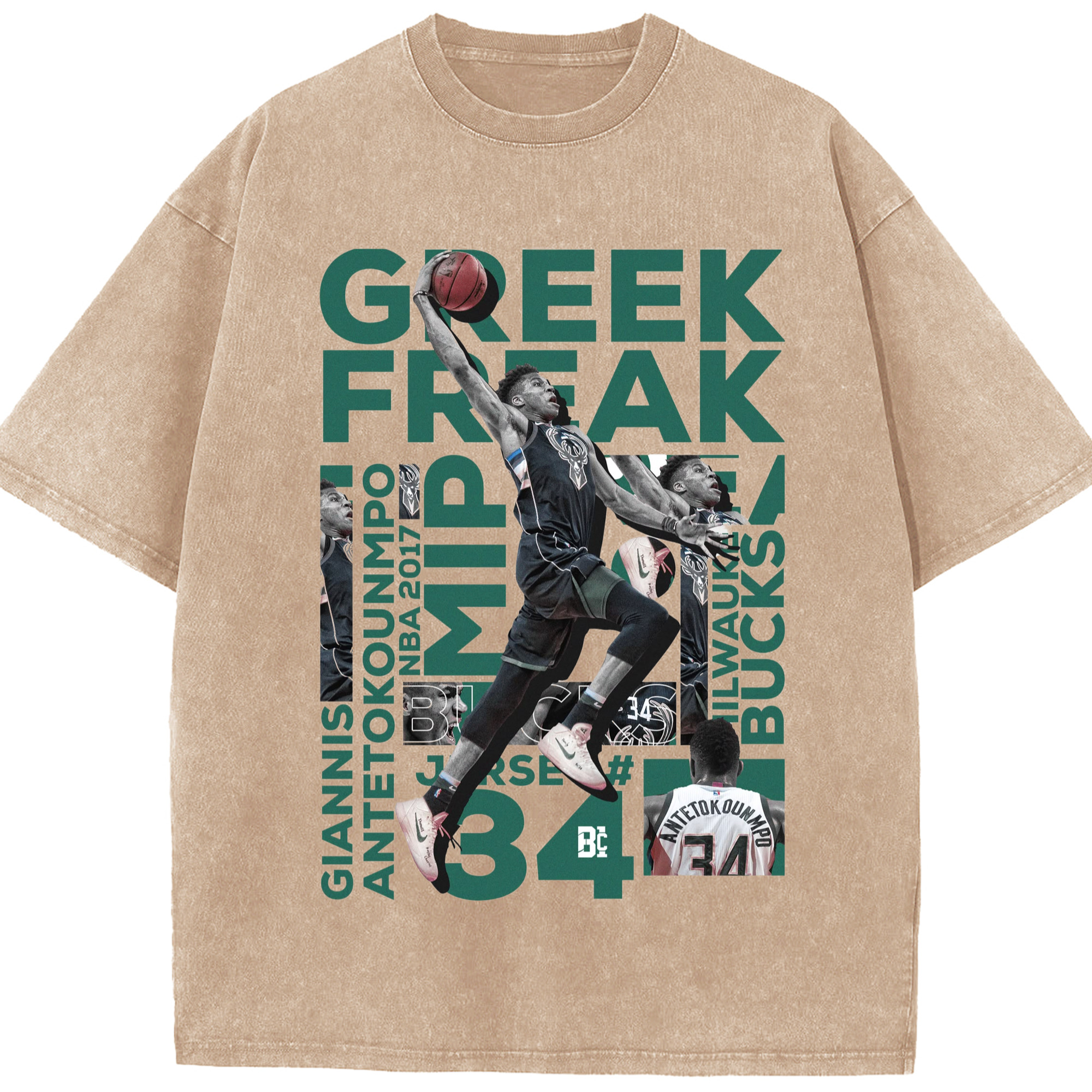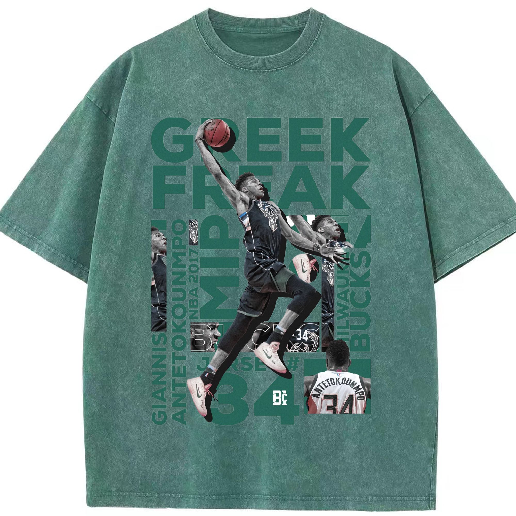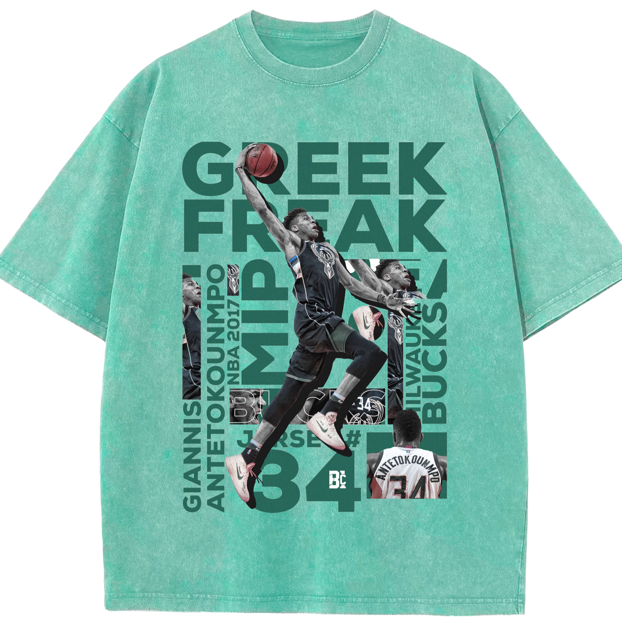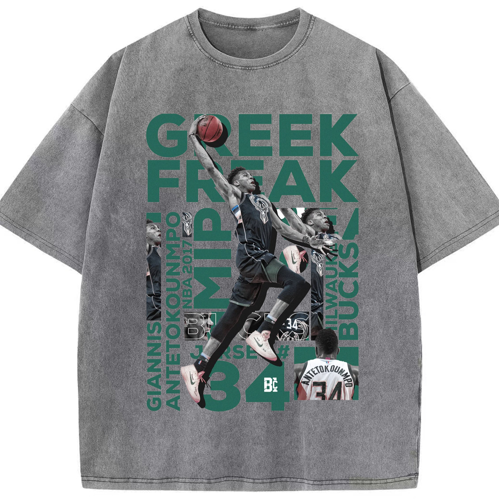 Bucks Giannis Antetokounmpo #34 collage T-shirt - Washed Vintage Look 230g Cotton Oversized T-Shirt With Front Heat Transfer Print – Soft, Lightweight, Stylish Fit – Comfortable Casual Wear For Sports & Everyday Use