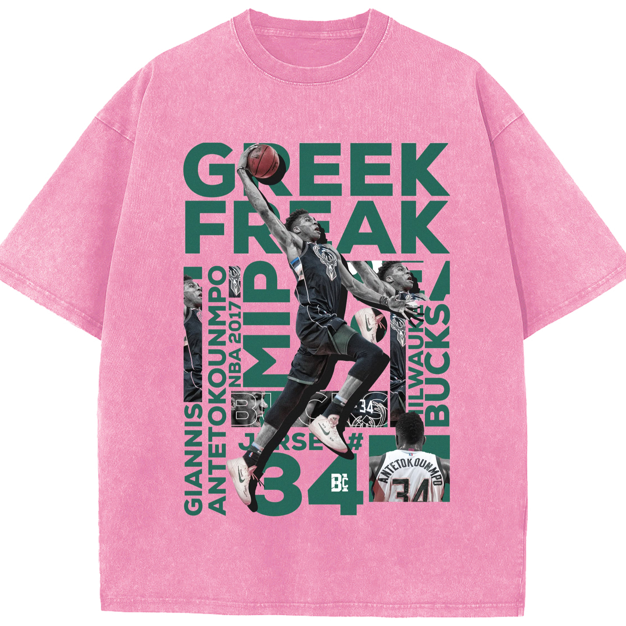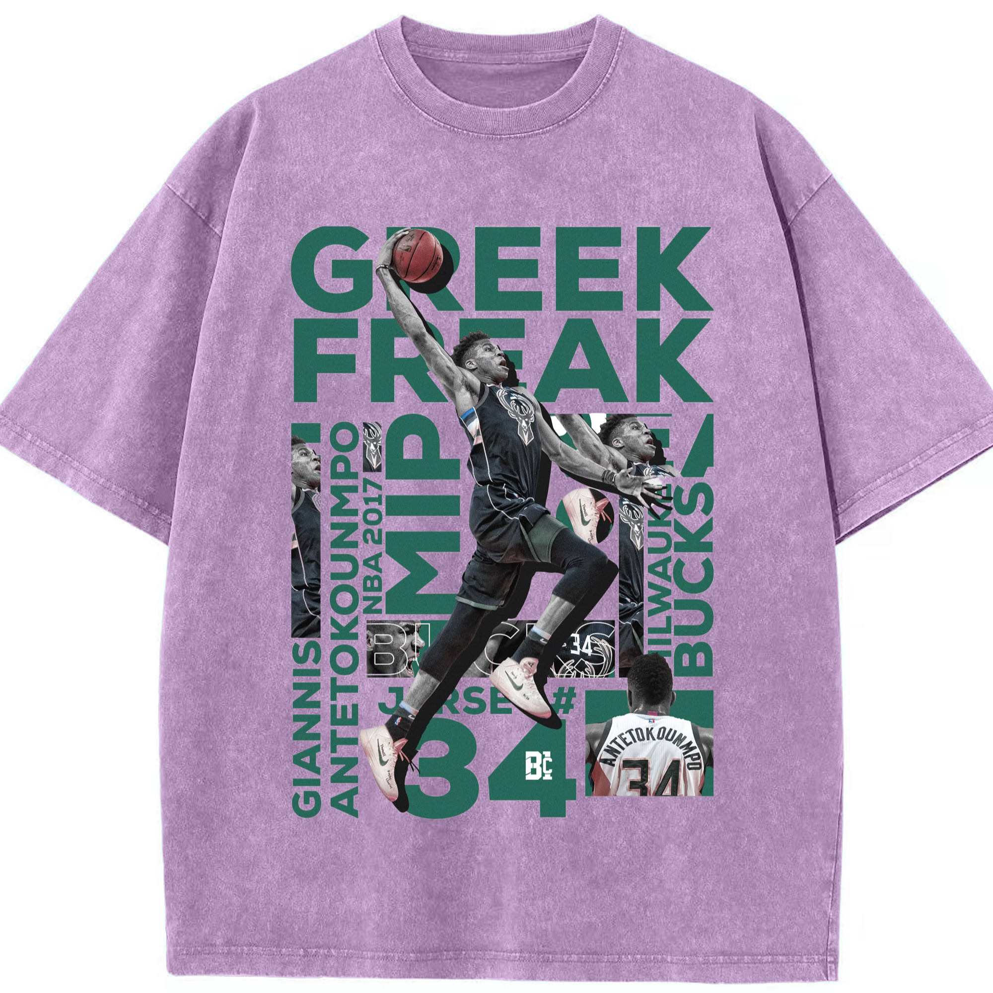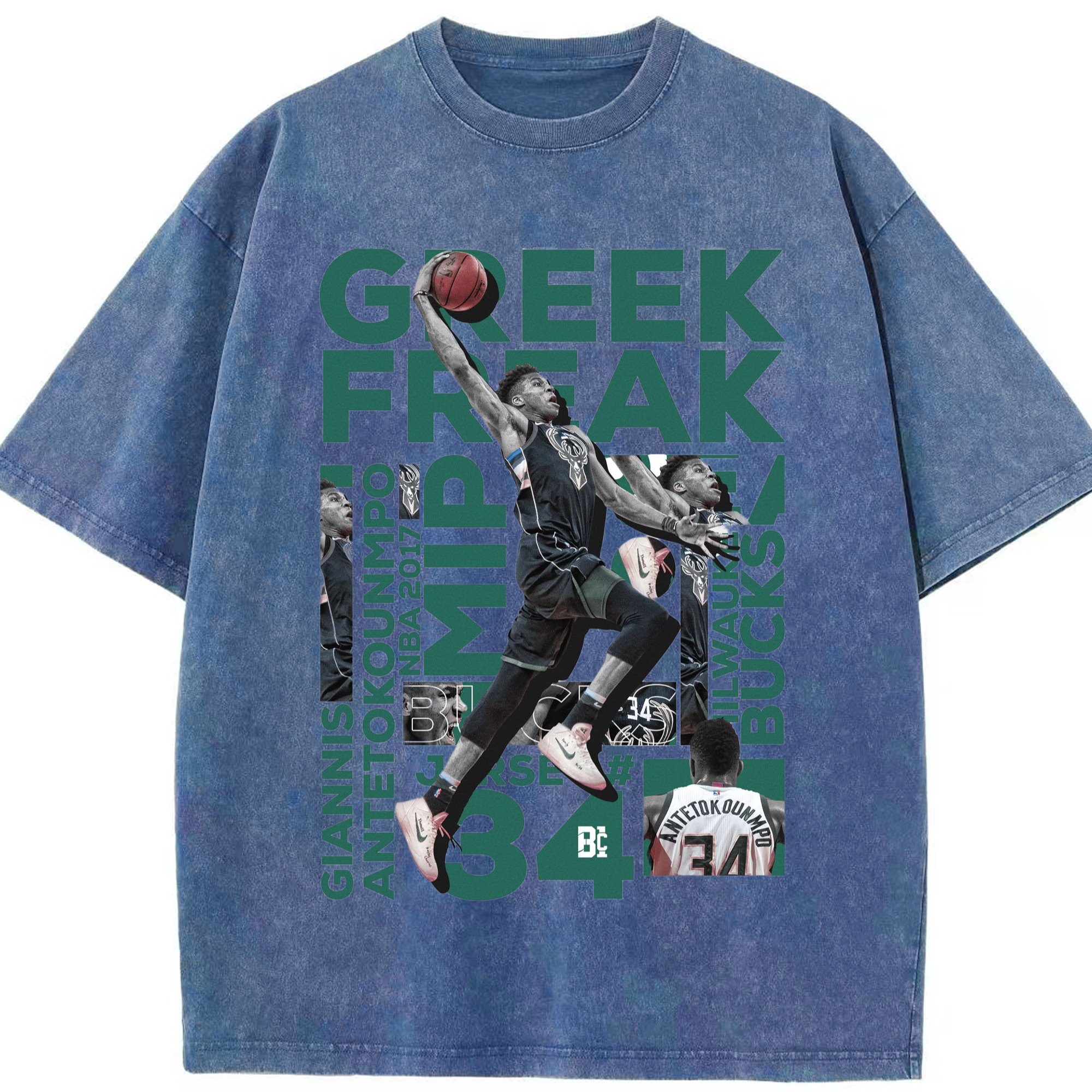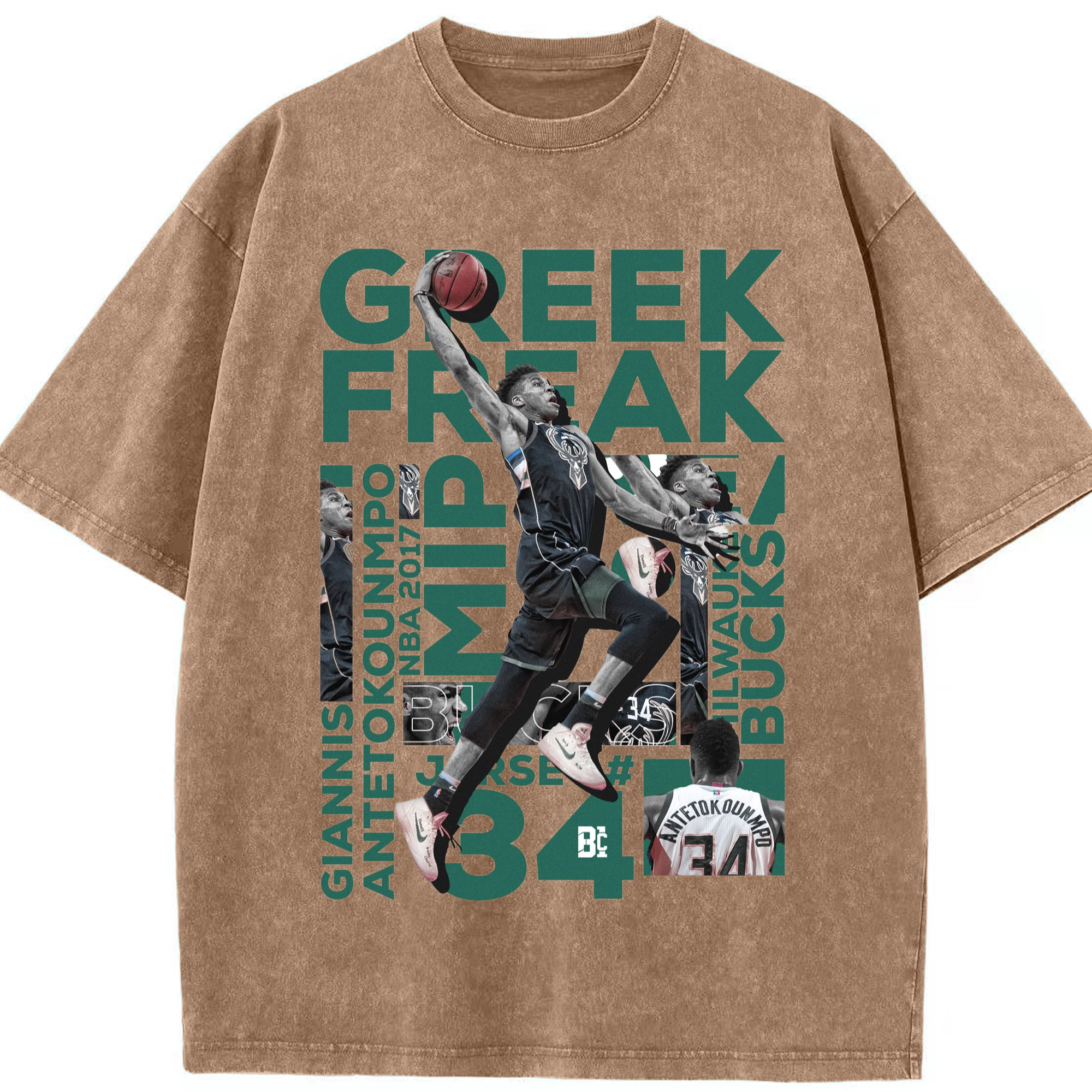 Bucks Giannis Antetokounmpo #34 collage T-shirt - Washed Vintage Look 230g Cotton Oversized T-Shirt With Front Heat Transfer Print – Soft, Lightweight, Stylish Fit – Comfortable Casual Wear For Sports & Everyday Use