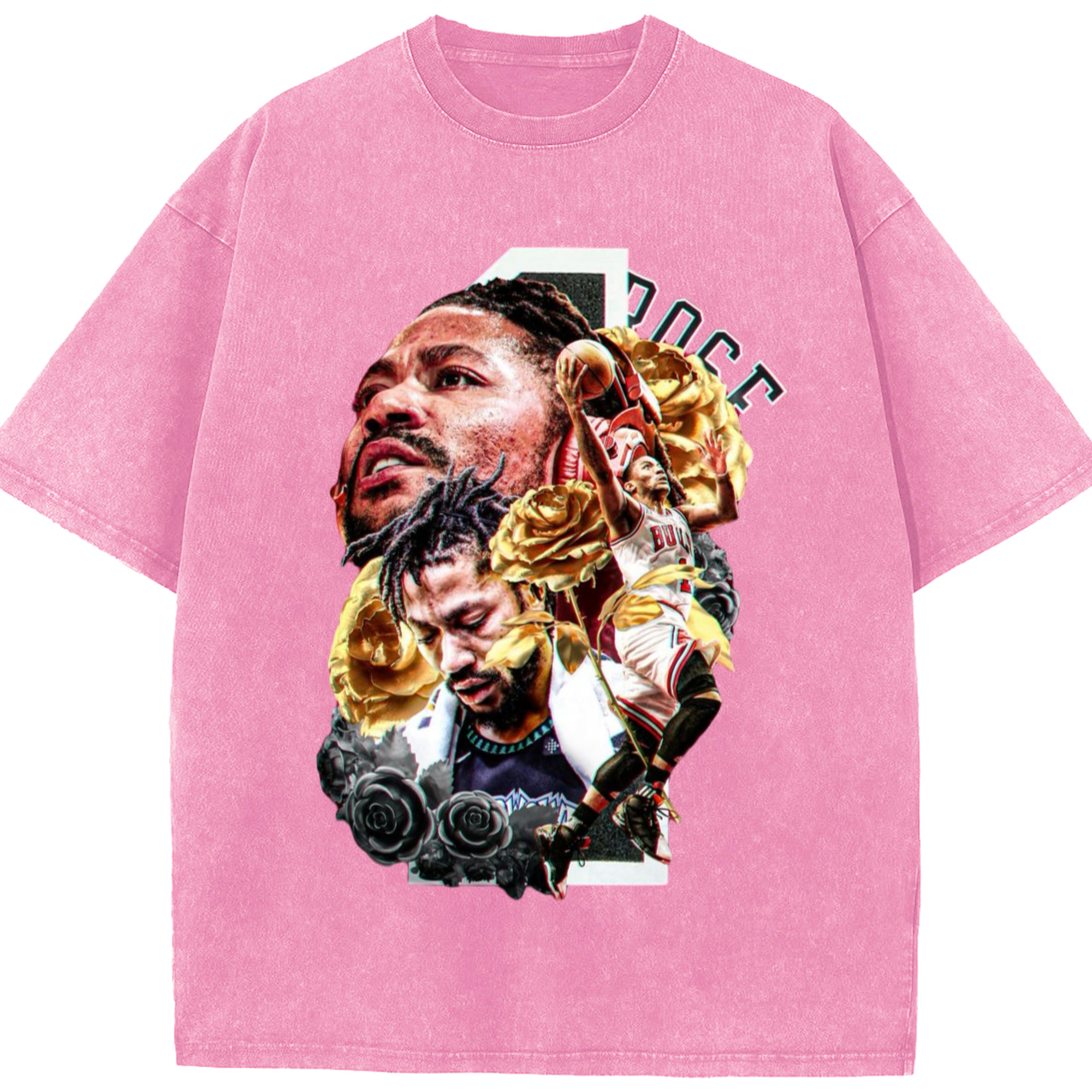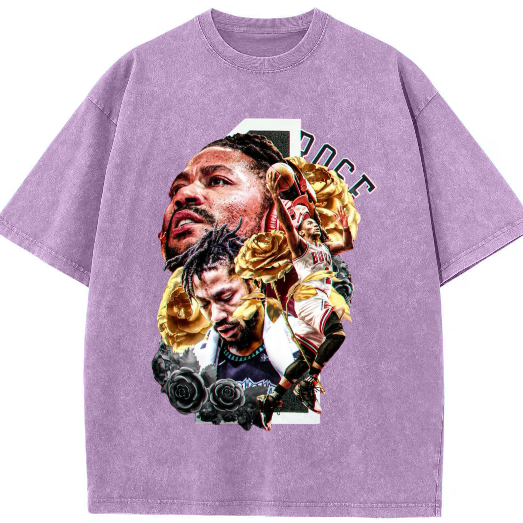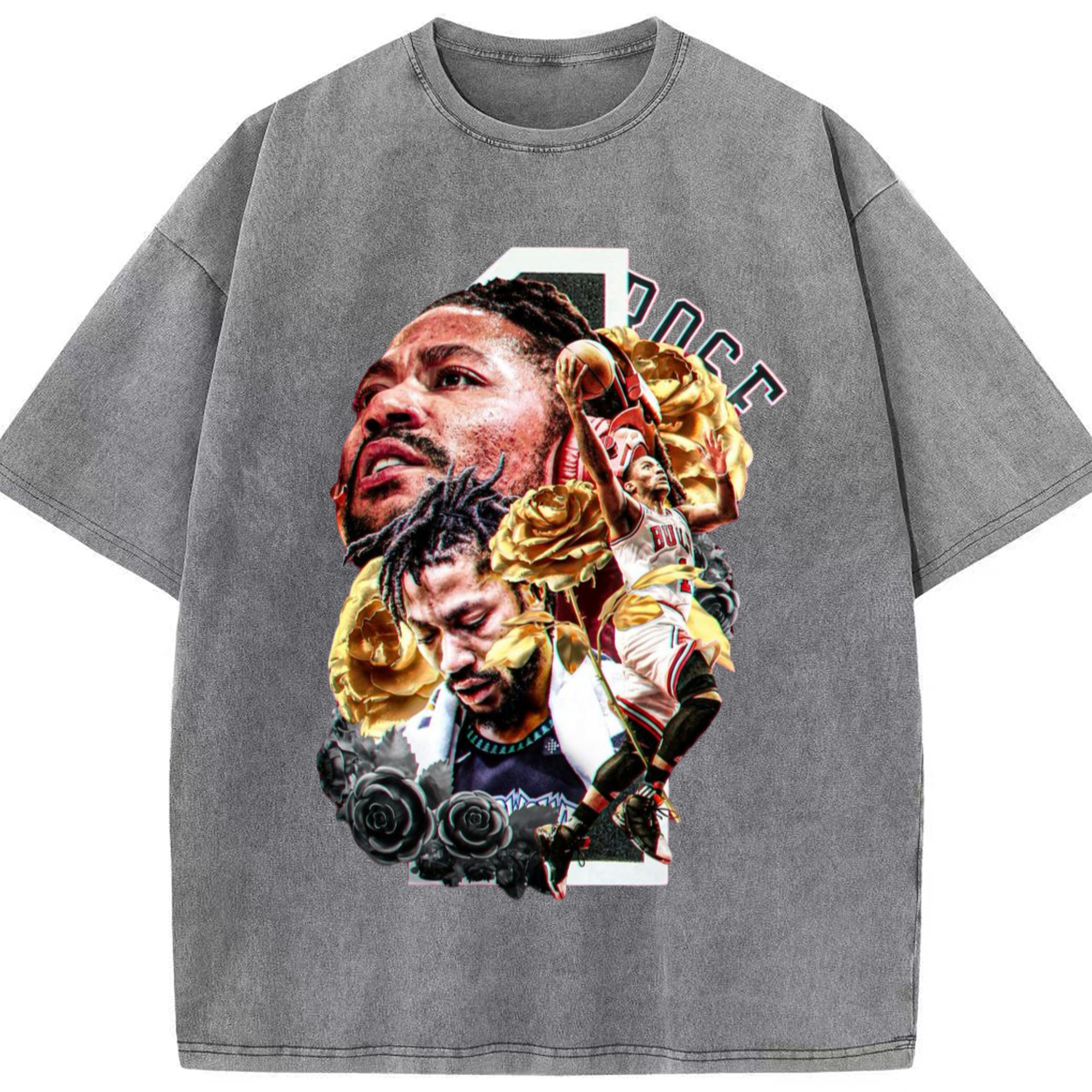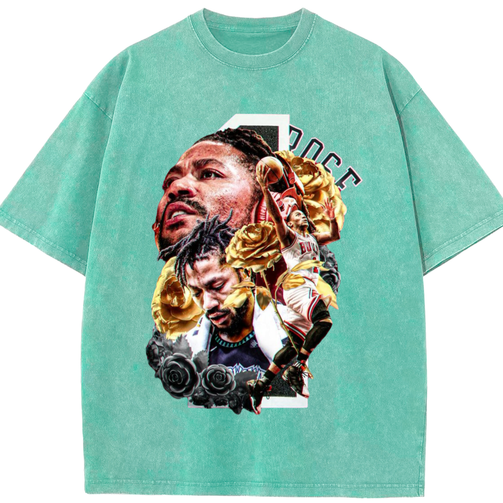 Derrick Rose ‘Roses never die’T-shirt - Washed Vintage Look 230g Cotton Oversized T-Shirt With Front Heat Transfer Print – Soft, Lightweight, Stylish Fit – Comfortable Casual Wear For Sports & Everyday Use