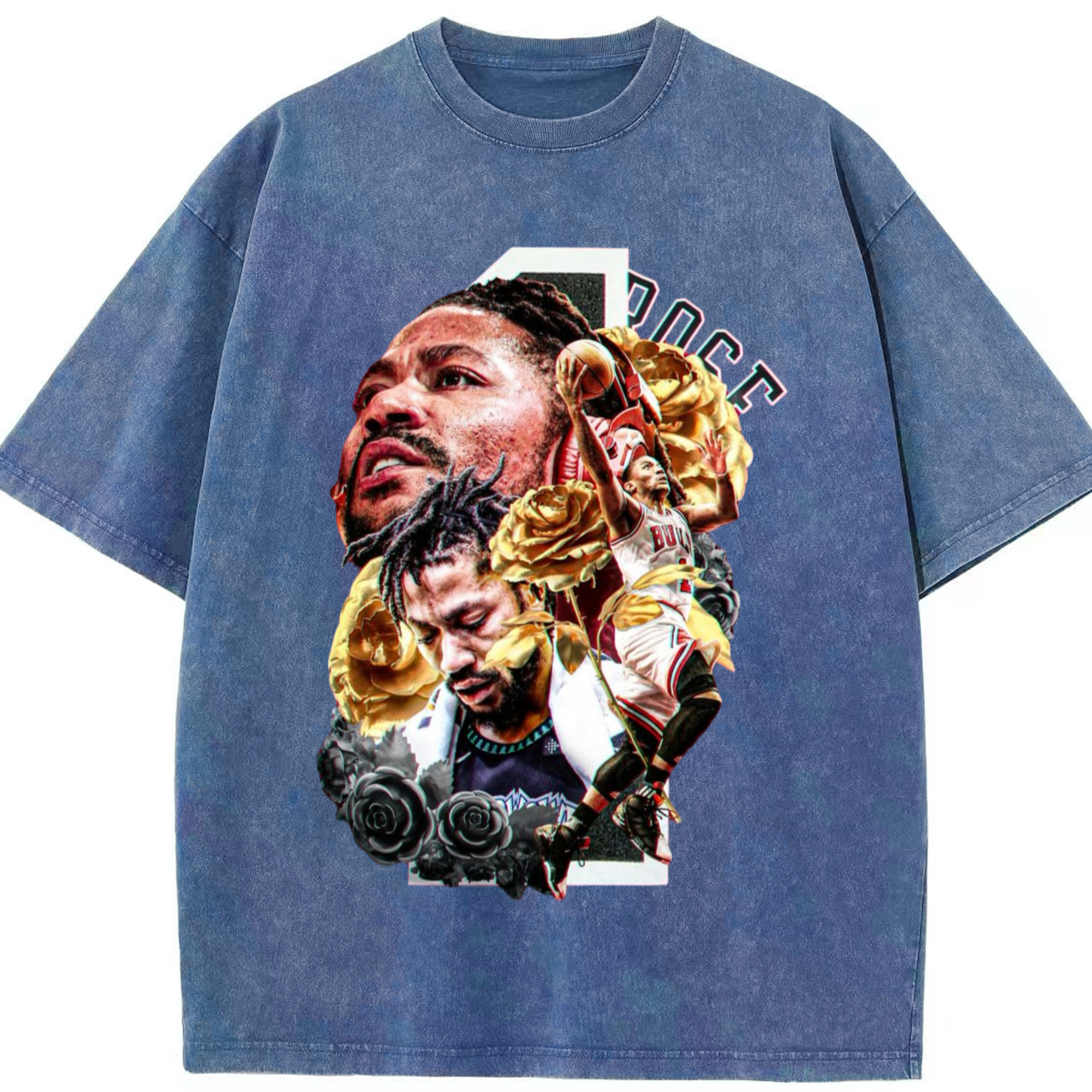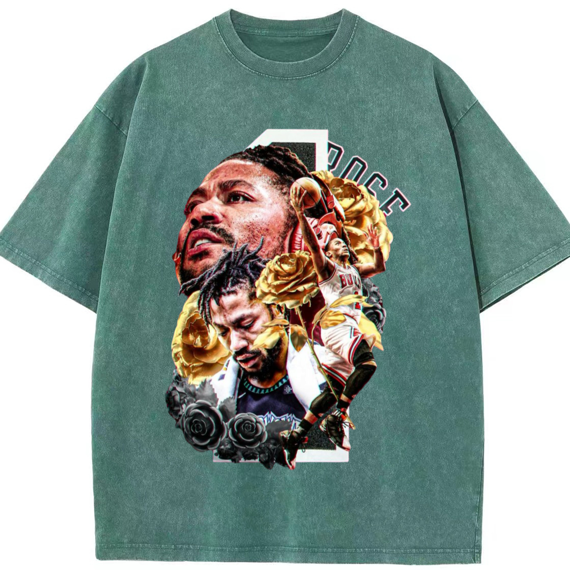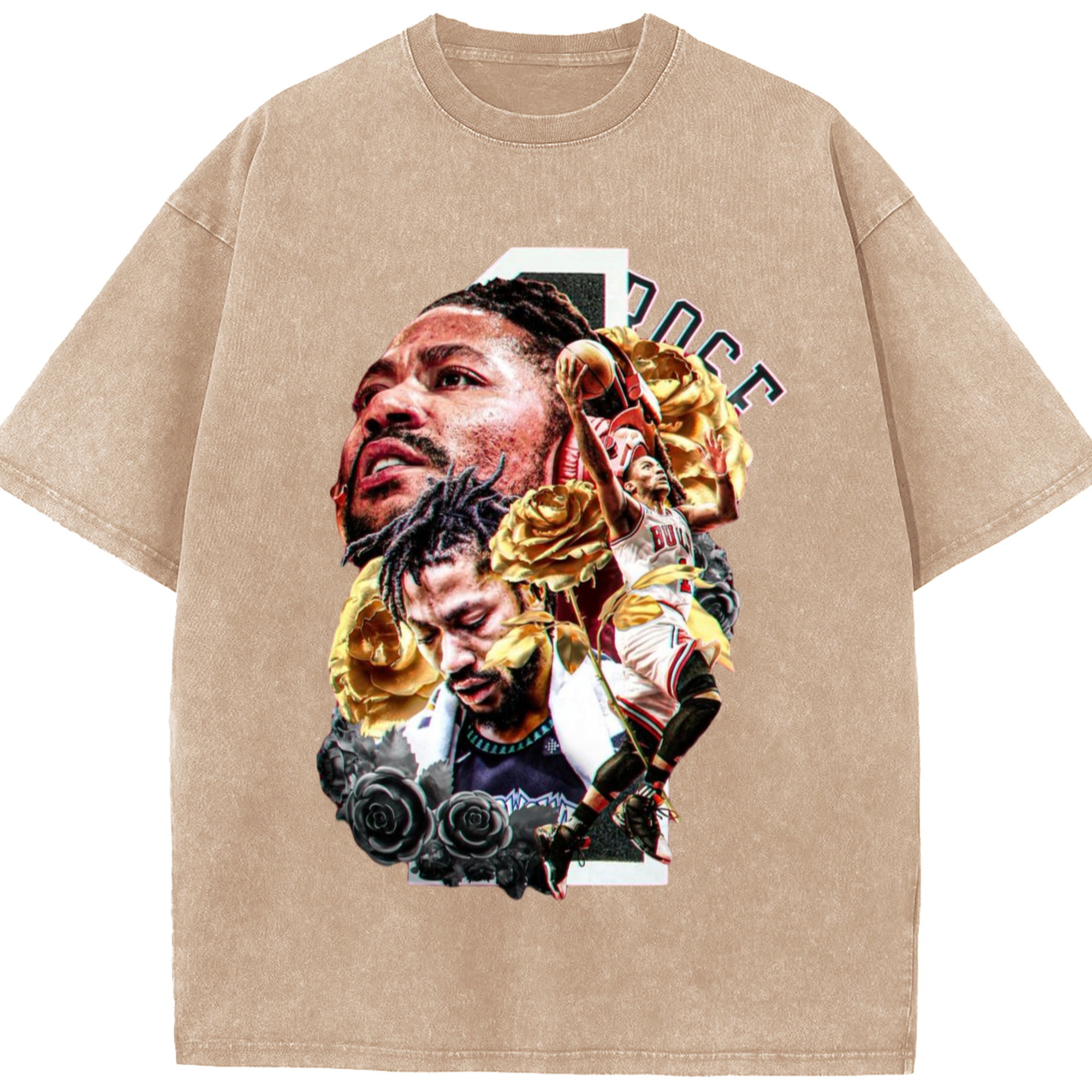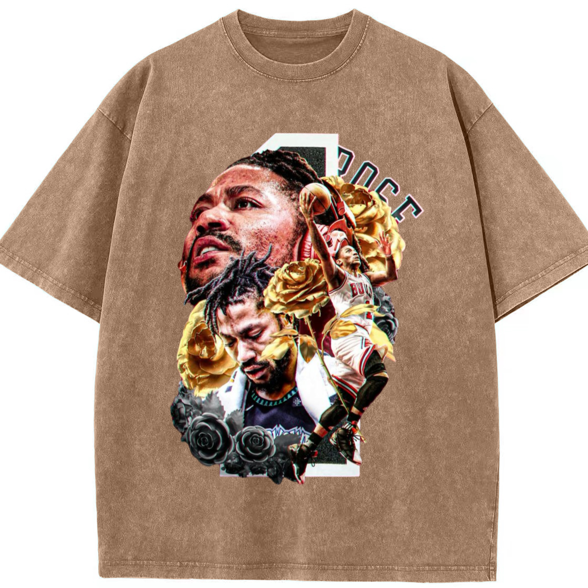 Derrick Rose ‘Roses never die’T-shirt - Washed Vintage Look 230g Cotton Oversized T-Shirt With Front Heat Transfer Print – Soft, Lightweight, Stylish Fit – Comfortable Casual Wear For Sports & Everyday Use