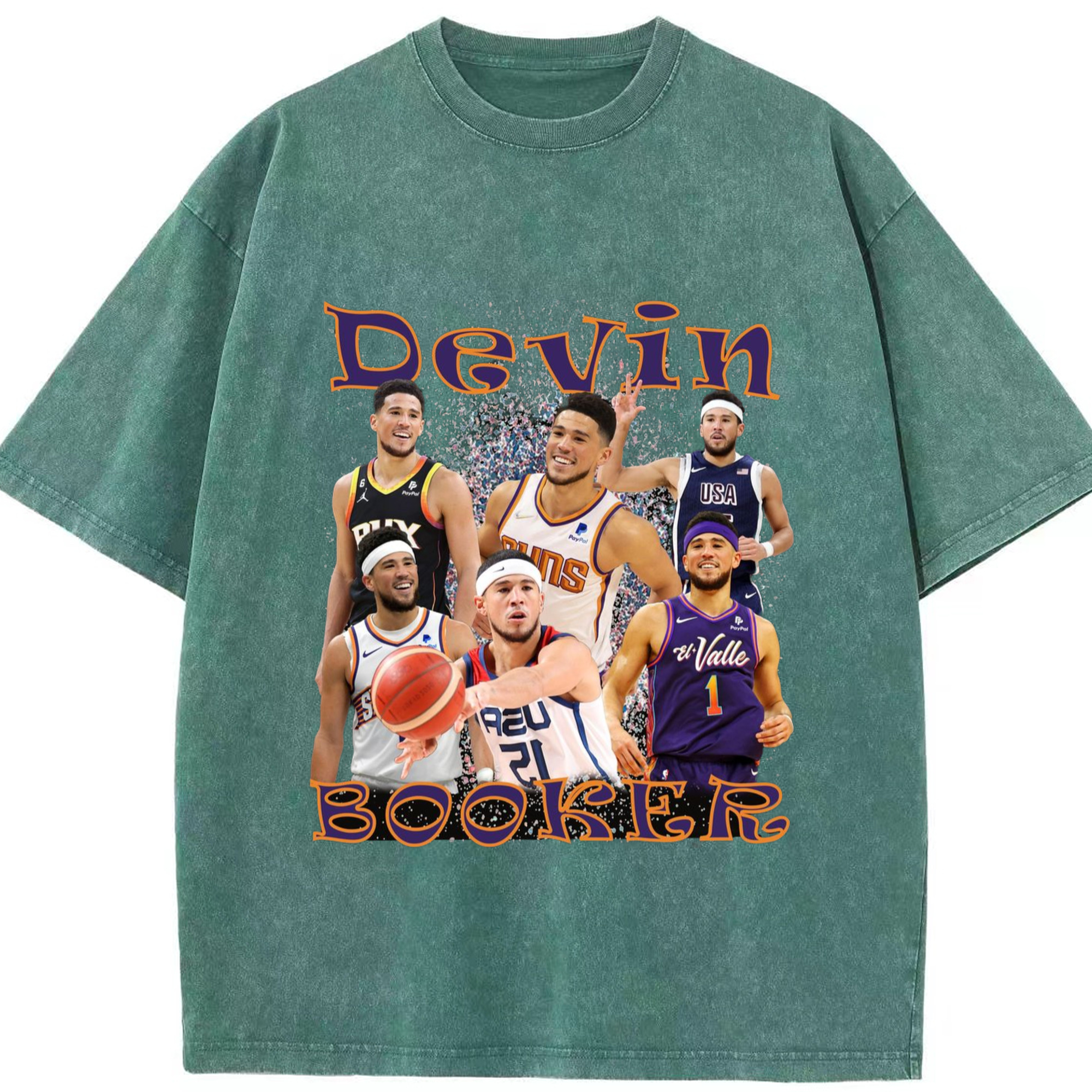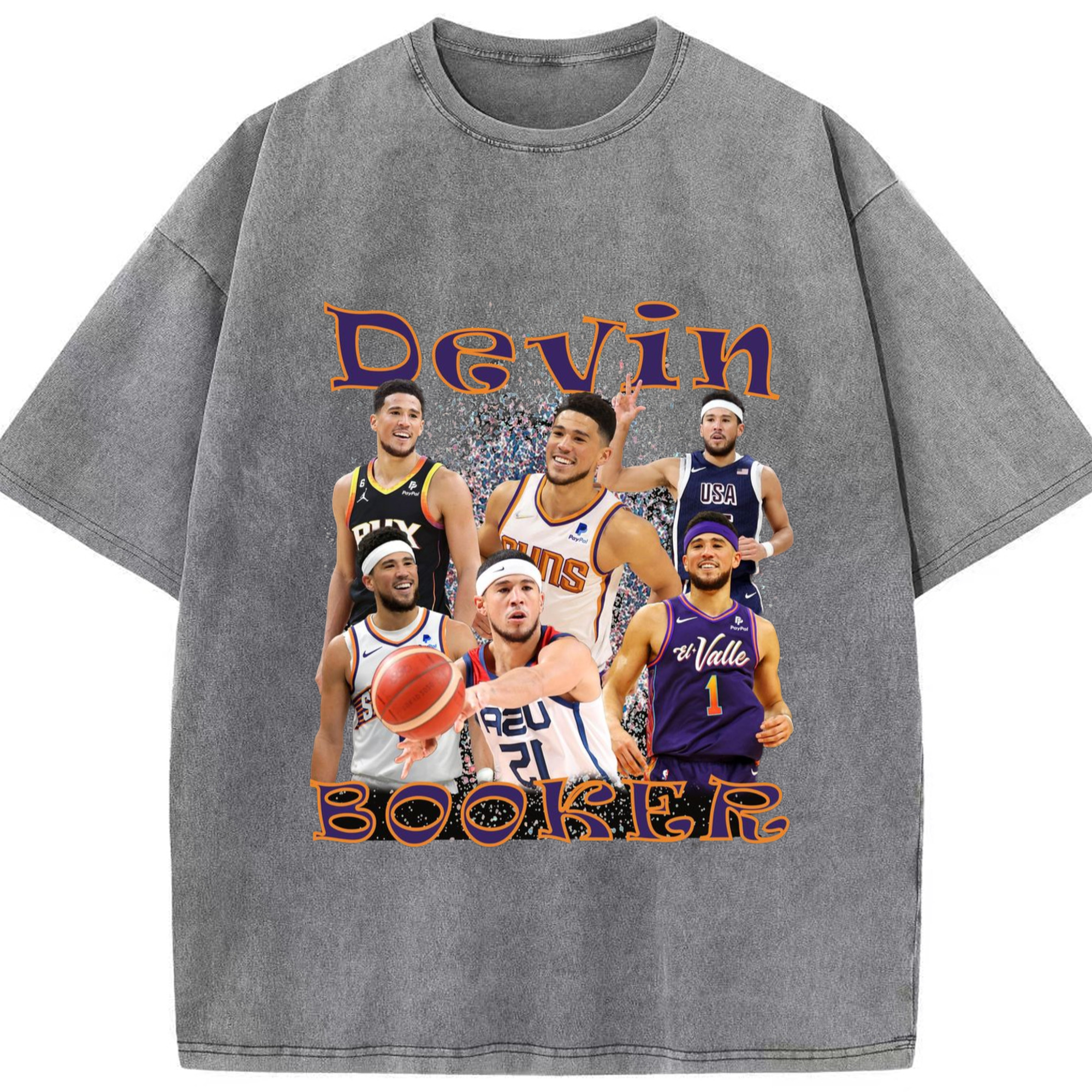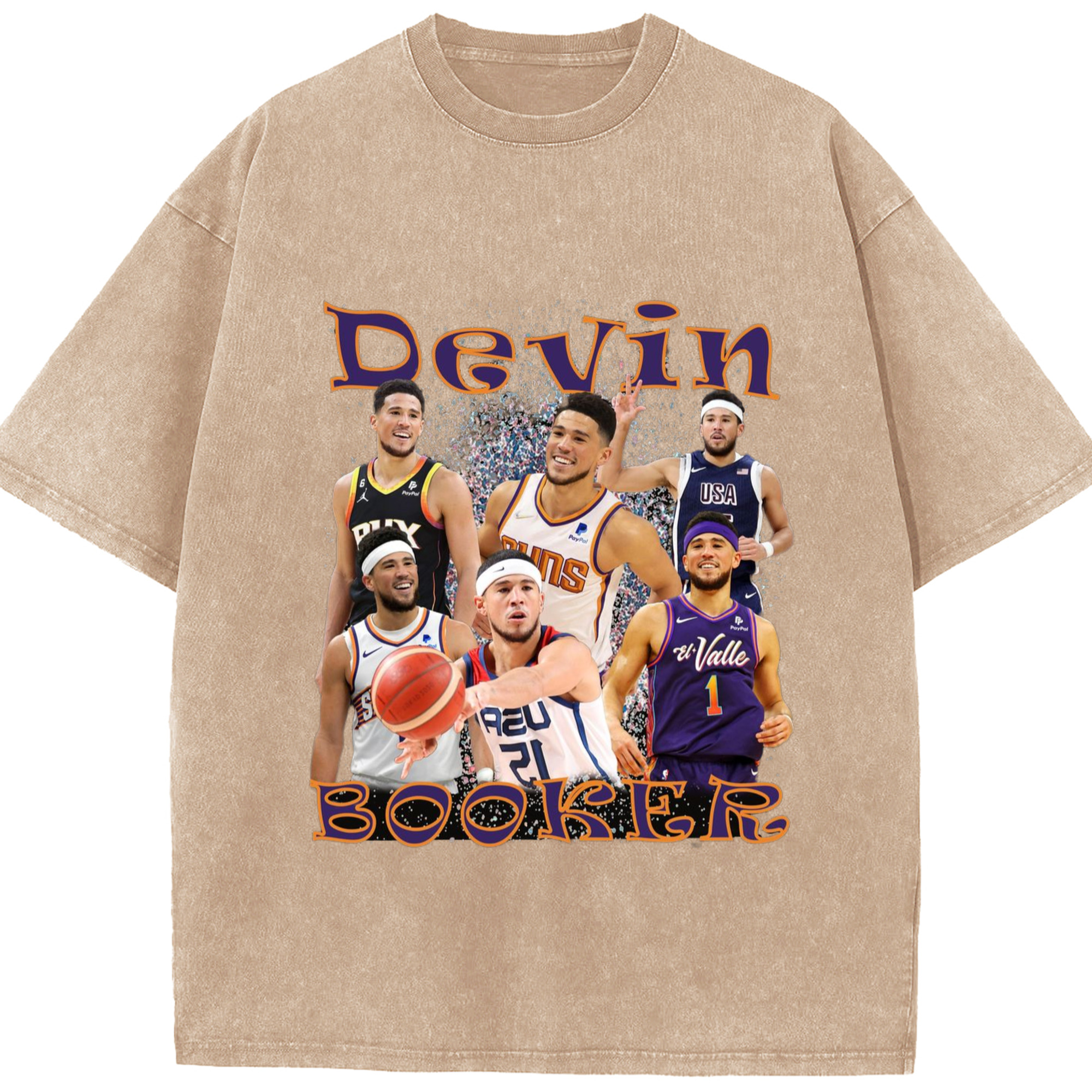 Devin Booker #1 Collage graphic T‑Shirt - Washed Vintage Look 230g Cotton Oversized T-Shirt With Front Heat Transfer Print – Soft, Lightweight, Stylish Fit – Comfortable Casual Wear For Sports & Everyday Use