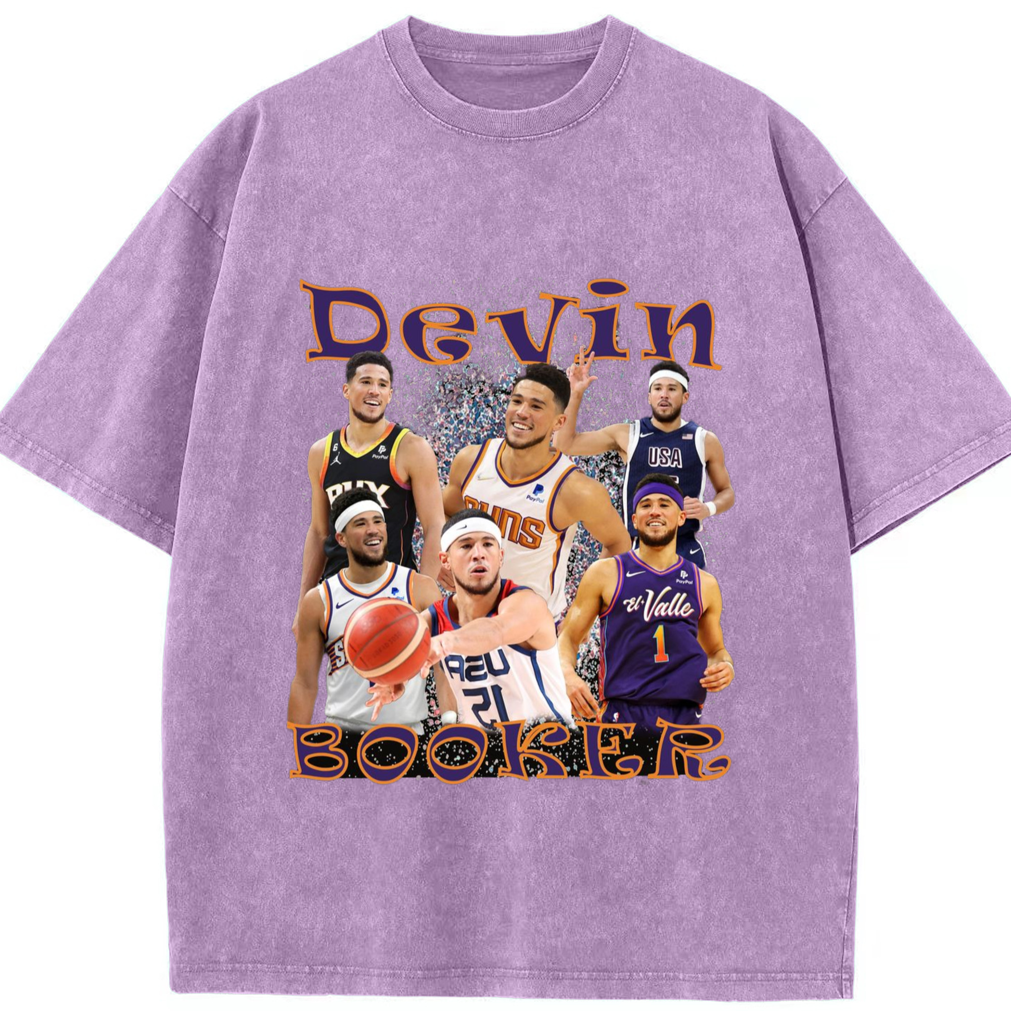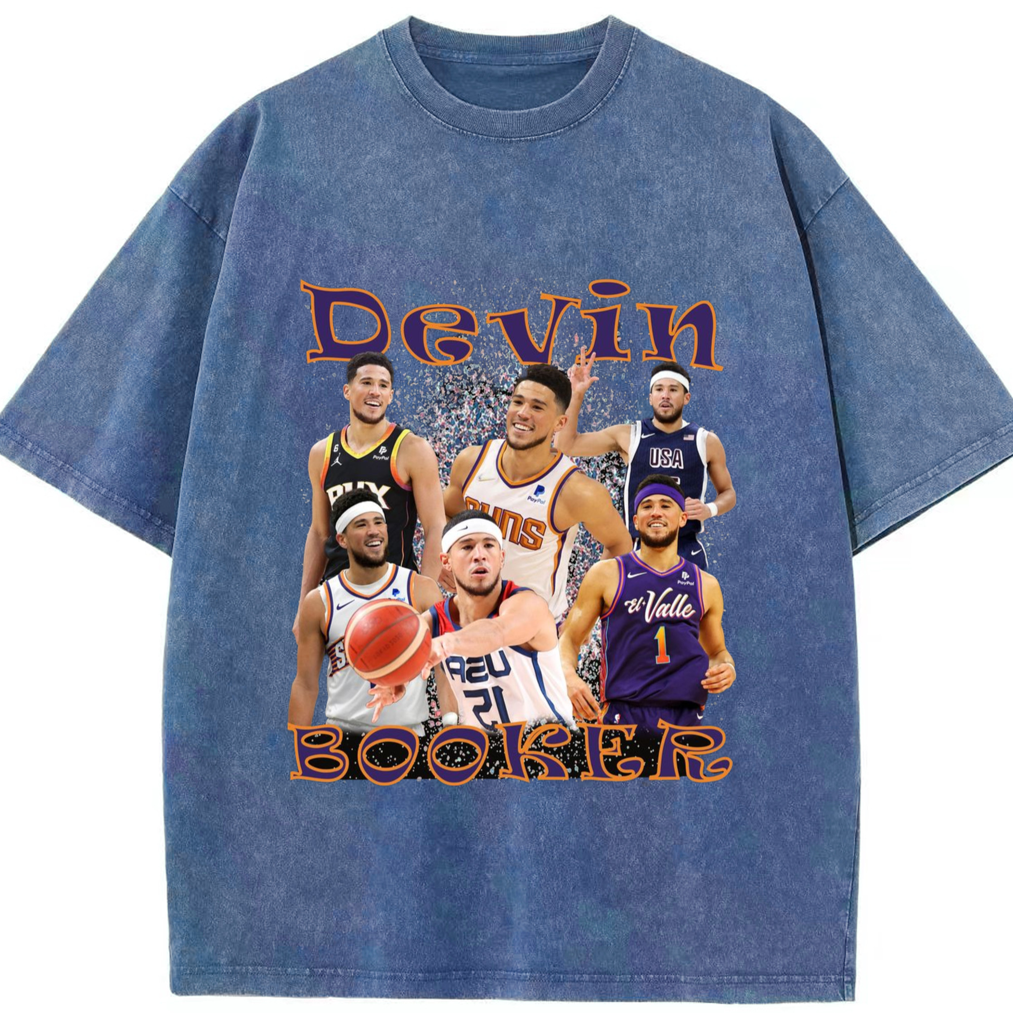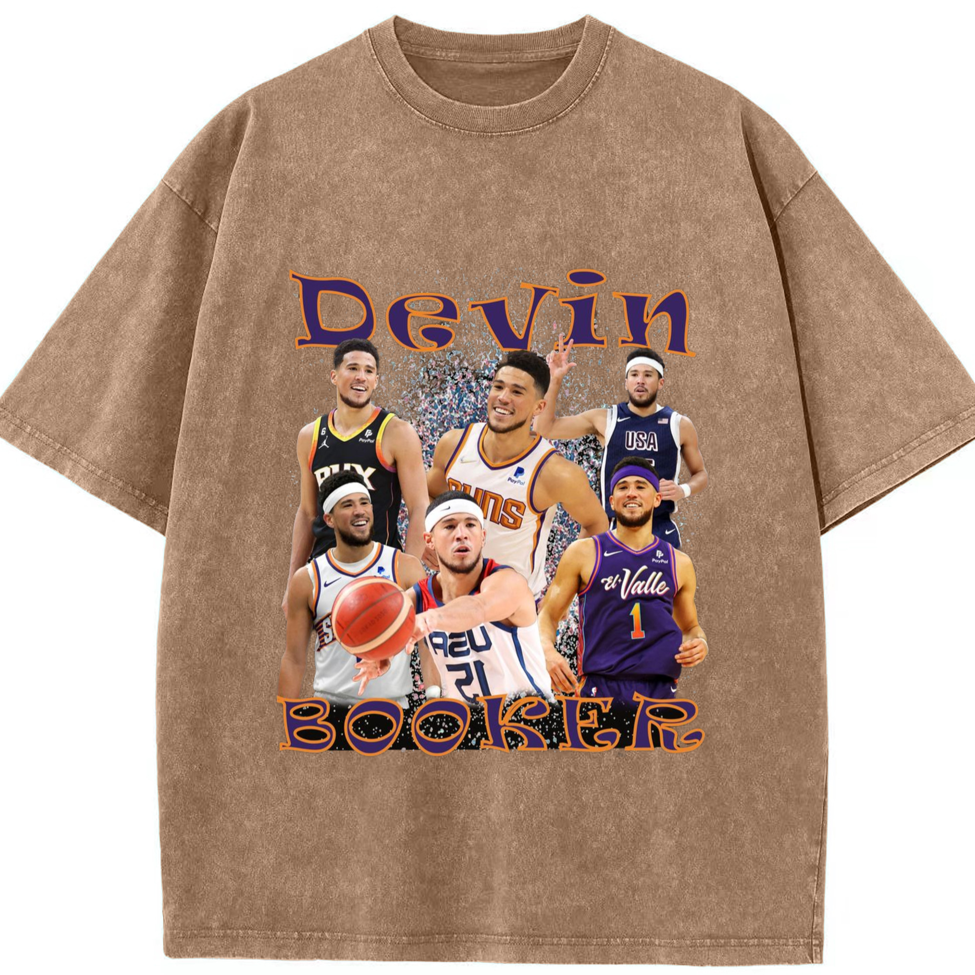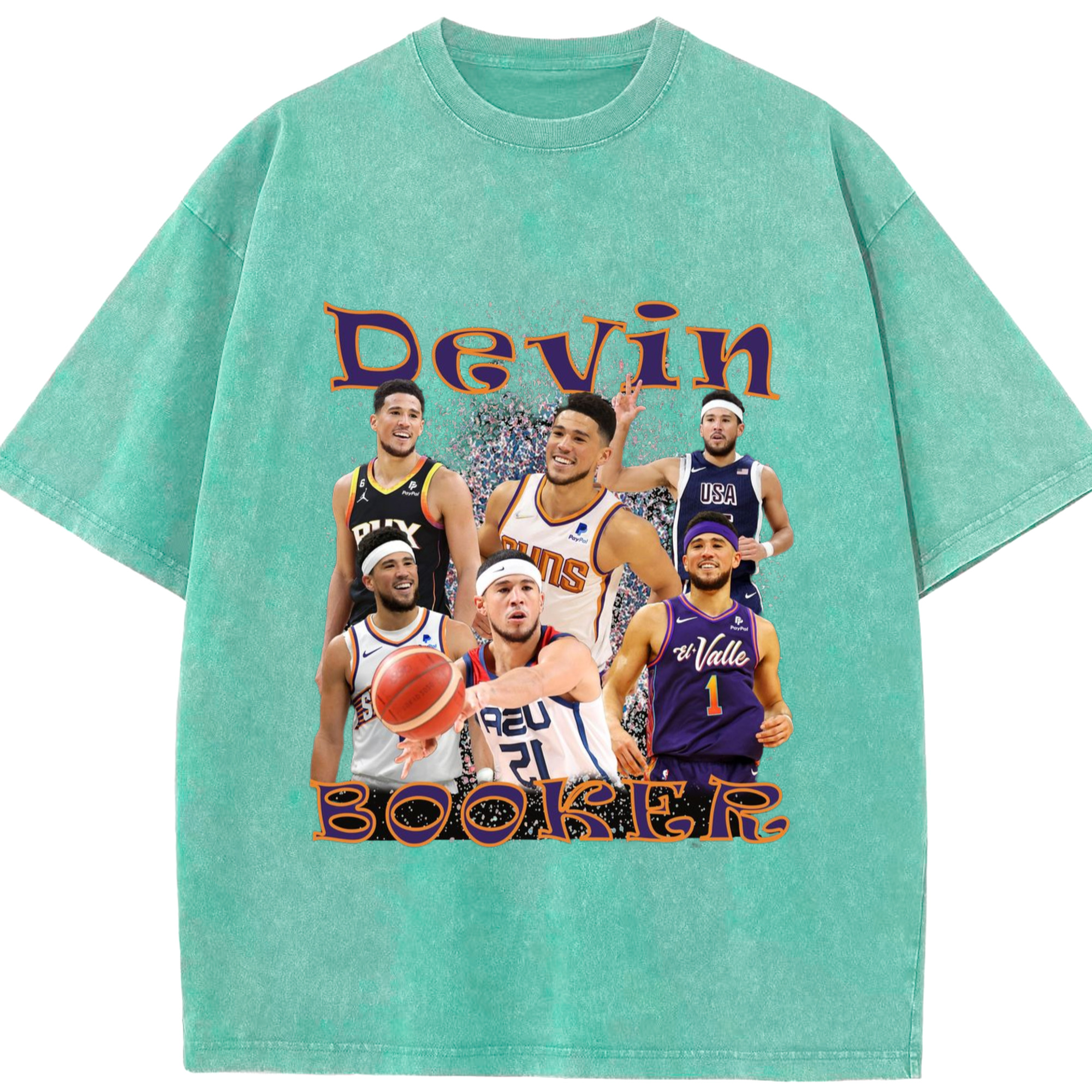 Devin Booker #1 Collage graphic T‑Shirt - Washed Vintage Look 230g Cotton Oversized T-Shirt With Front Heat Transfer Print – Soft, Lightweight, Stylish Fit – Comfortable Casual Wear For Sports & Everyday Use