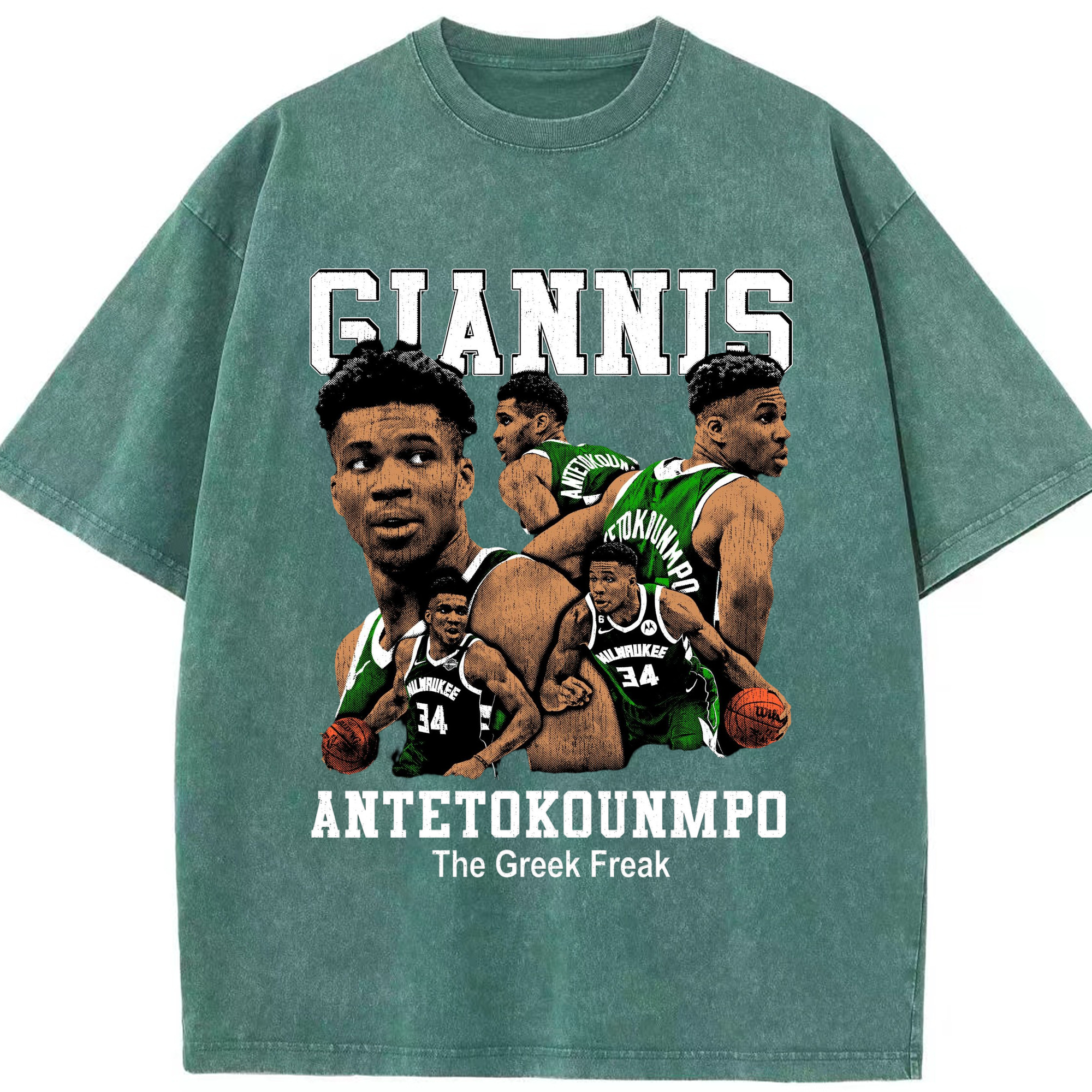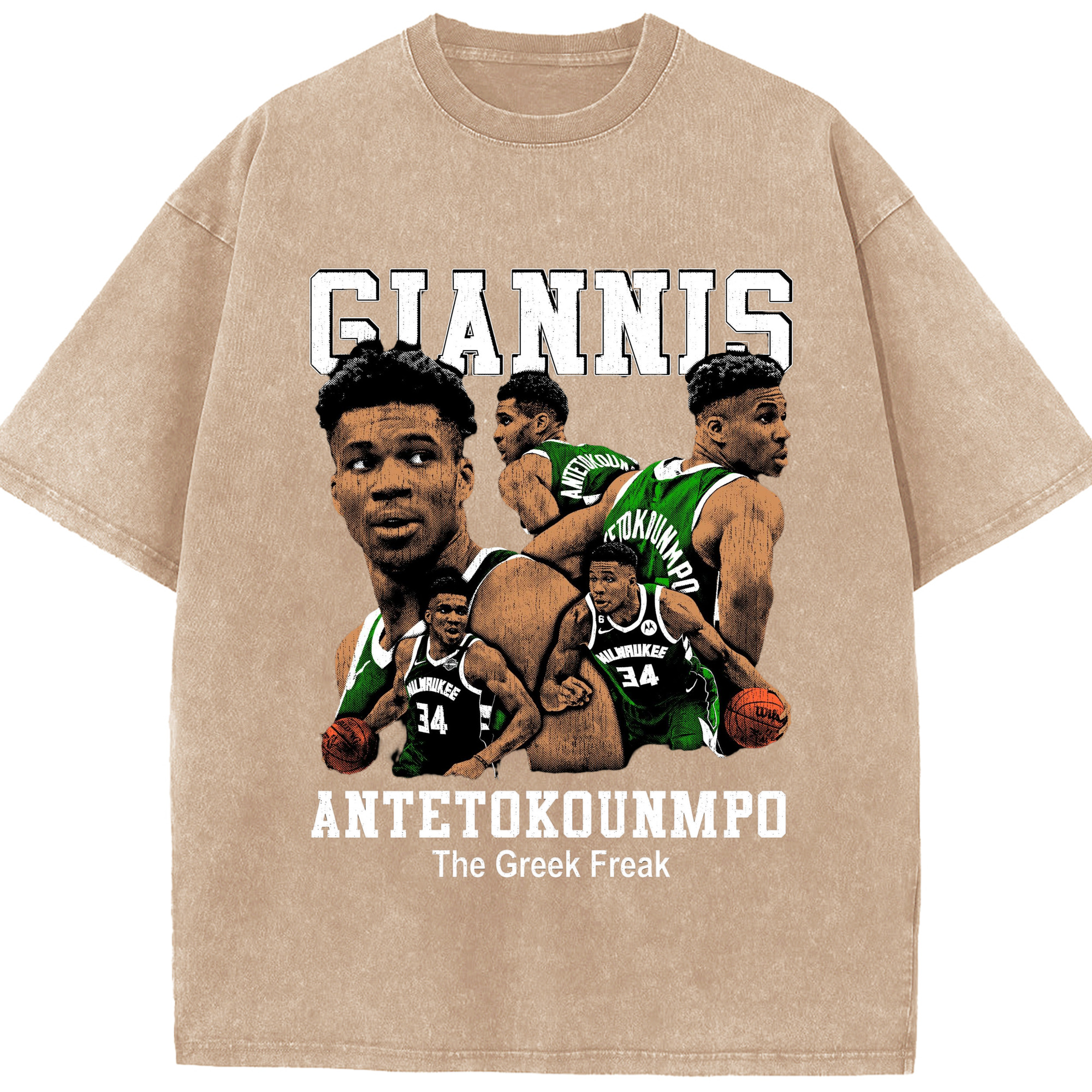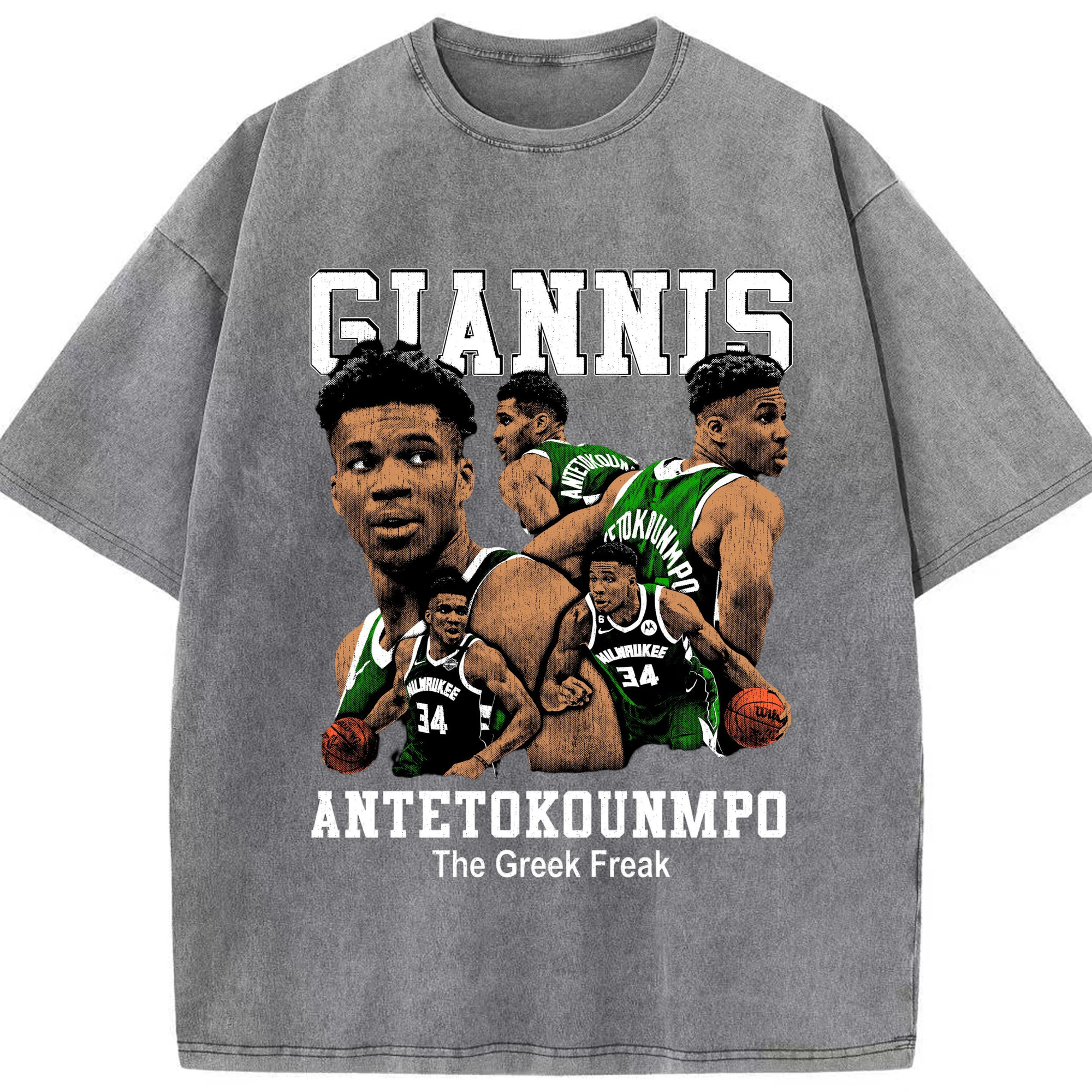 Giannis Antetokounmpo #34 collage T-shirt - Washed Vintage Look 230g Cotton Oversized T-Shirt With Front Heat Transfer Print – Soft, Lightweight, Stylish Fit – Comfortable Casual Wear For Sports & Everyday Use