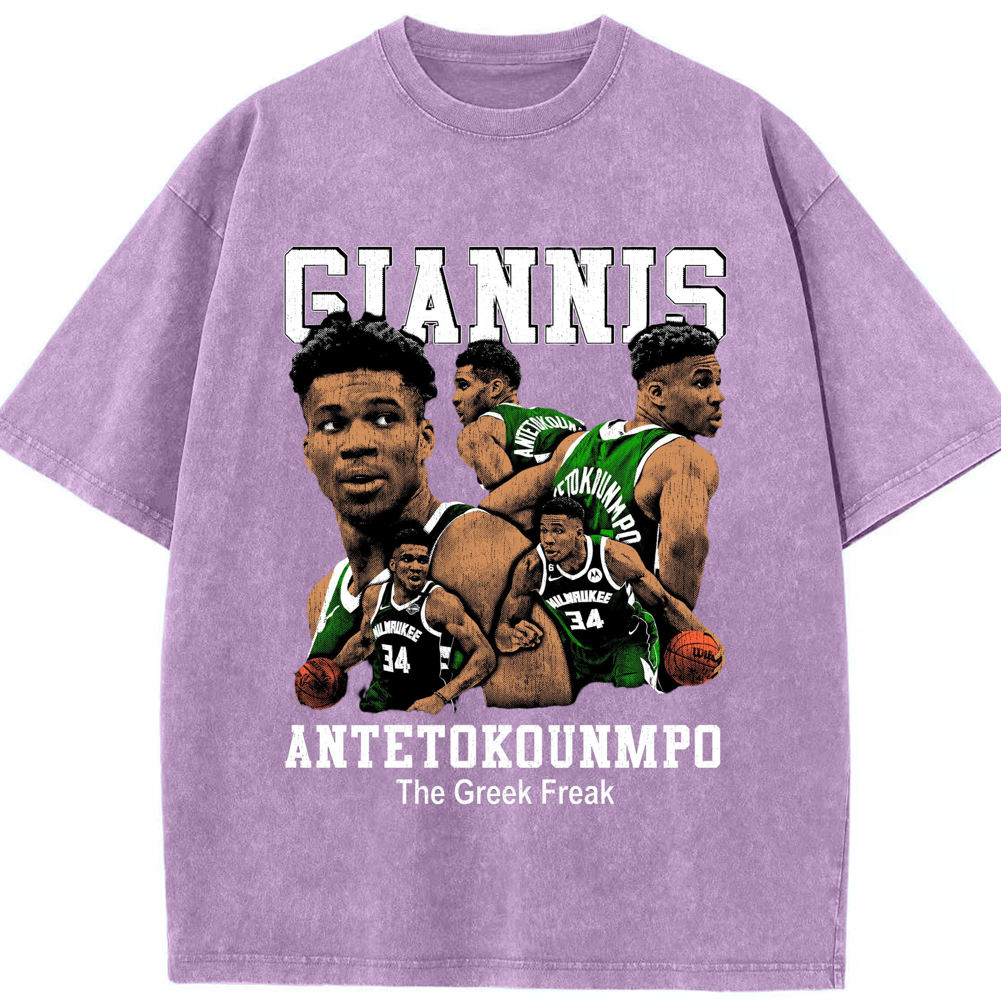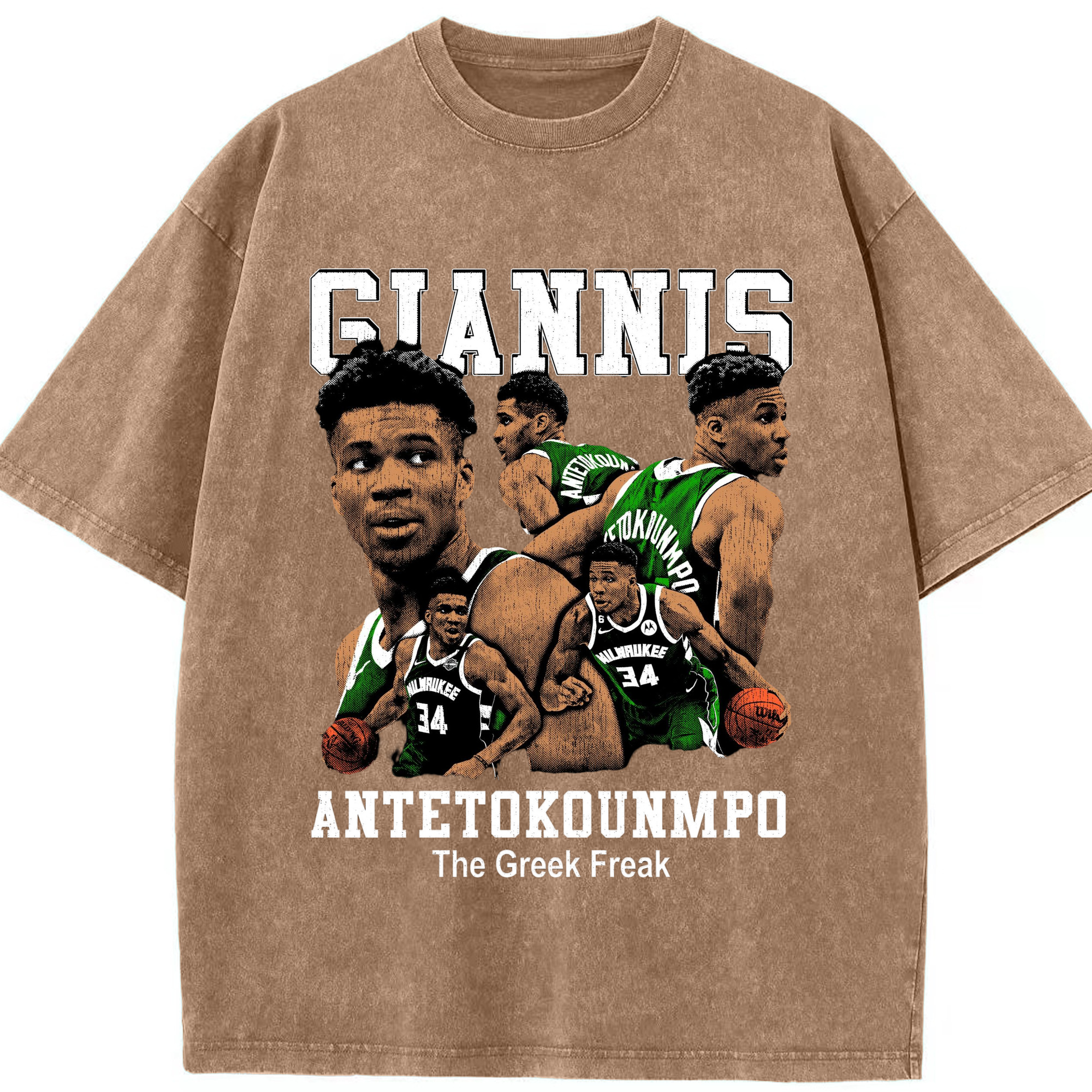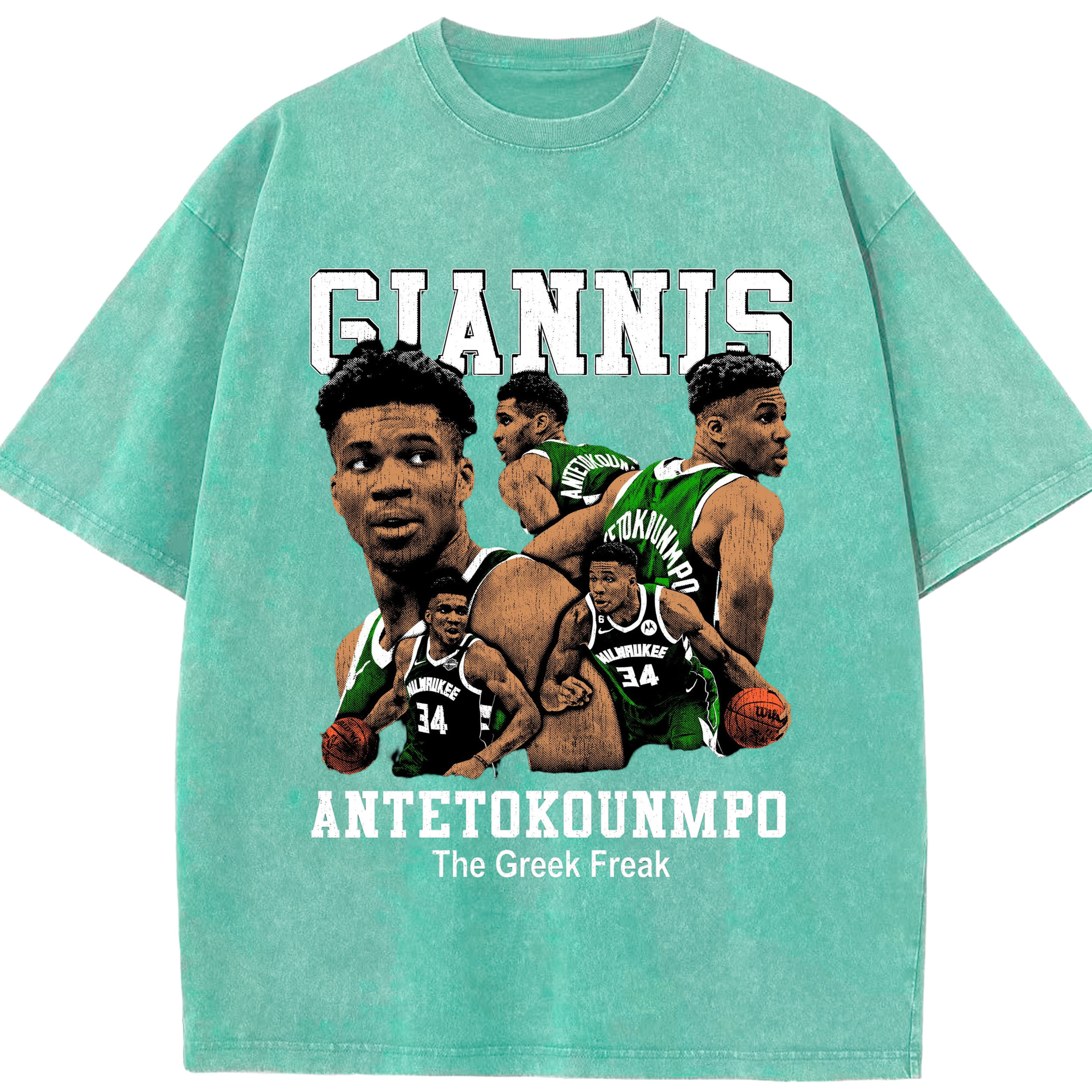Giannis Antetokounmpo #34 collage T-shirt - Washed Vintage Look 230g Cotton Oversized T-Shirt With Front Heat Transfer Print – Soft, Lightweight, Stylish Fit – Comfortable Casual Wear For Sports & Everyday Use