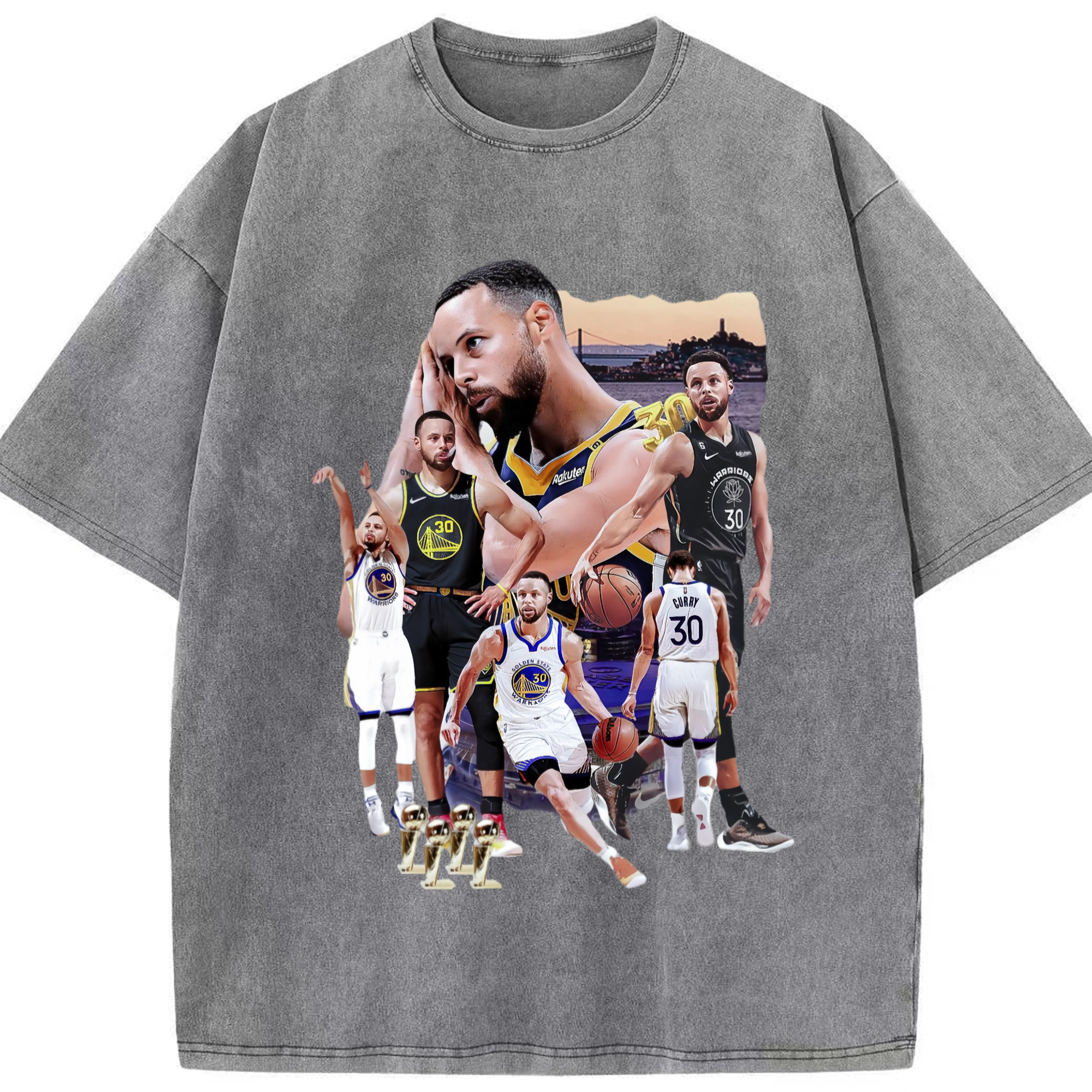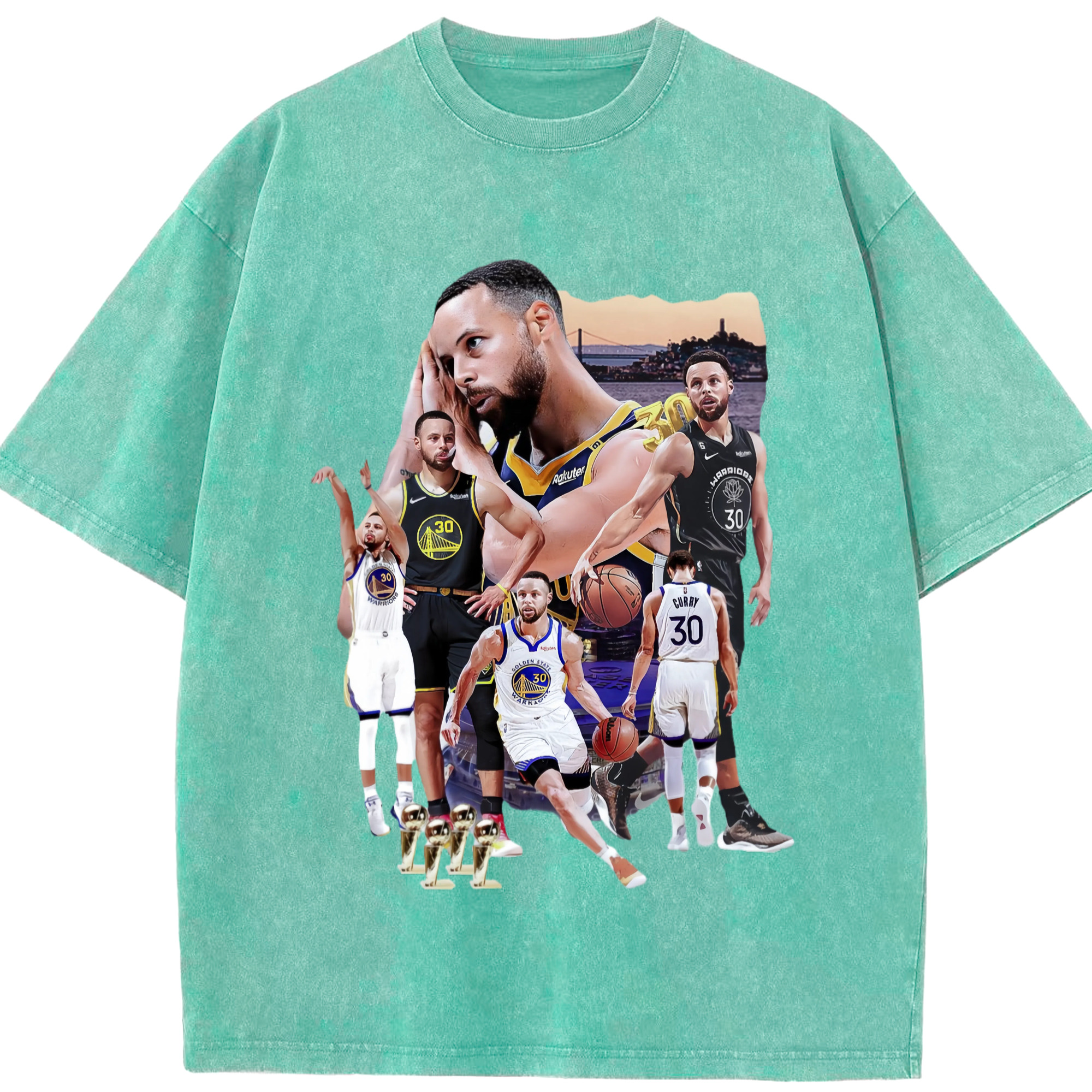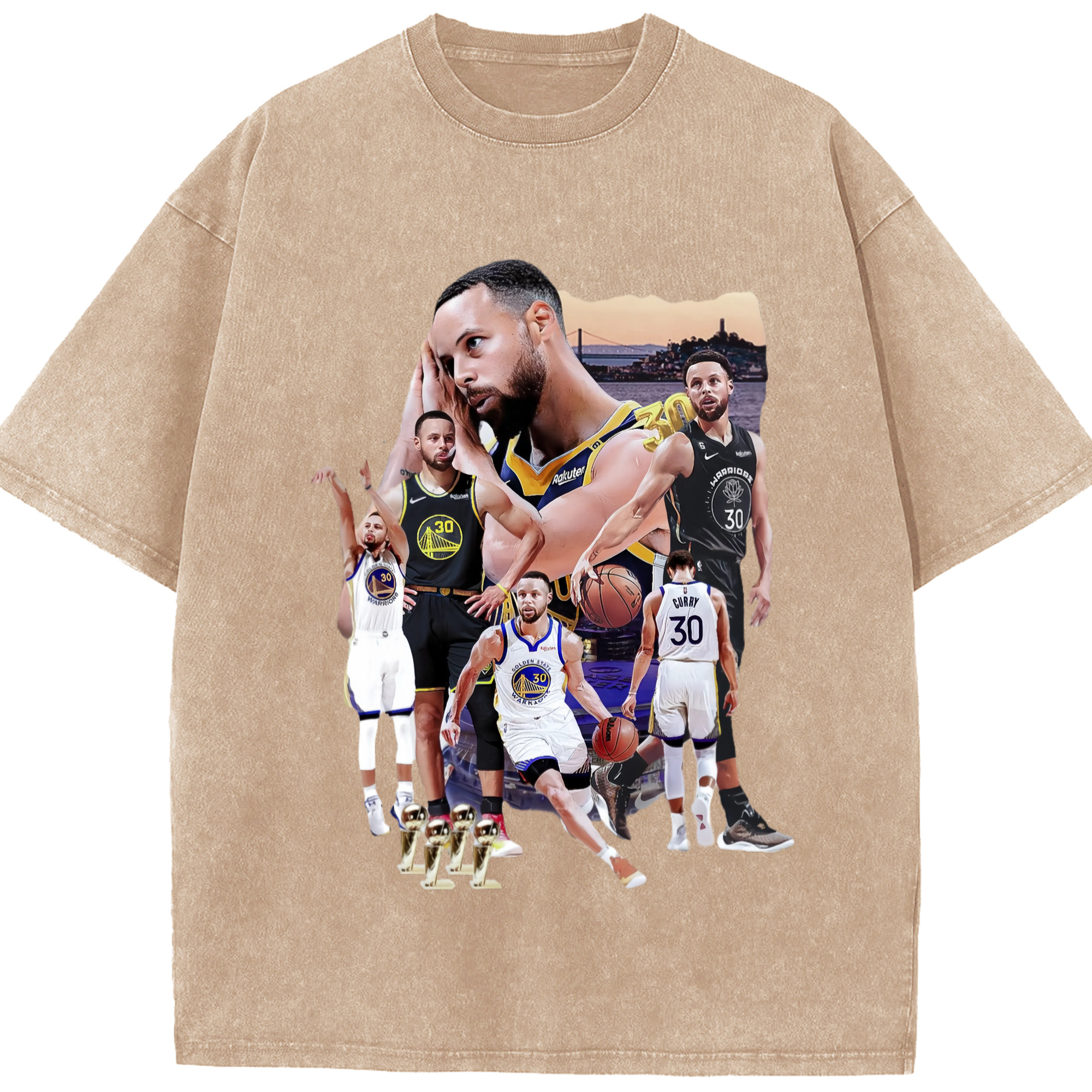 Golden State Warriors Stephen Curry collage tee - Washed Vintage Look 230g Cotton Oversized T-Shirt With Front Heat Transfer Print – Soft, Lightweight, Stylish Fit – Comfortable Casual Wear For Sports & Everyday Use