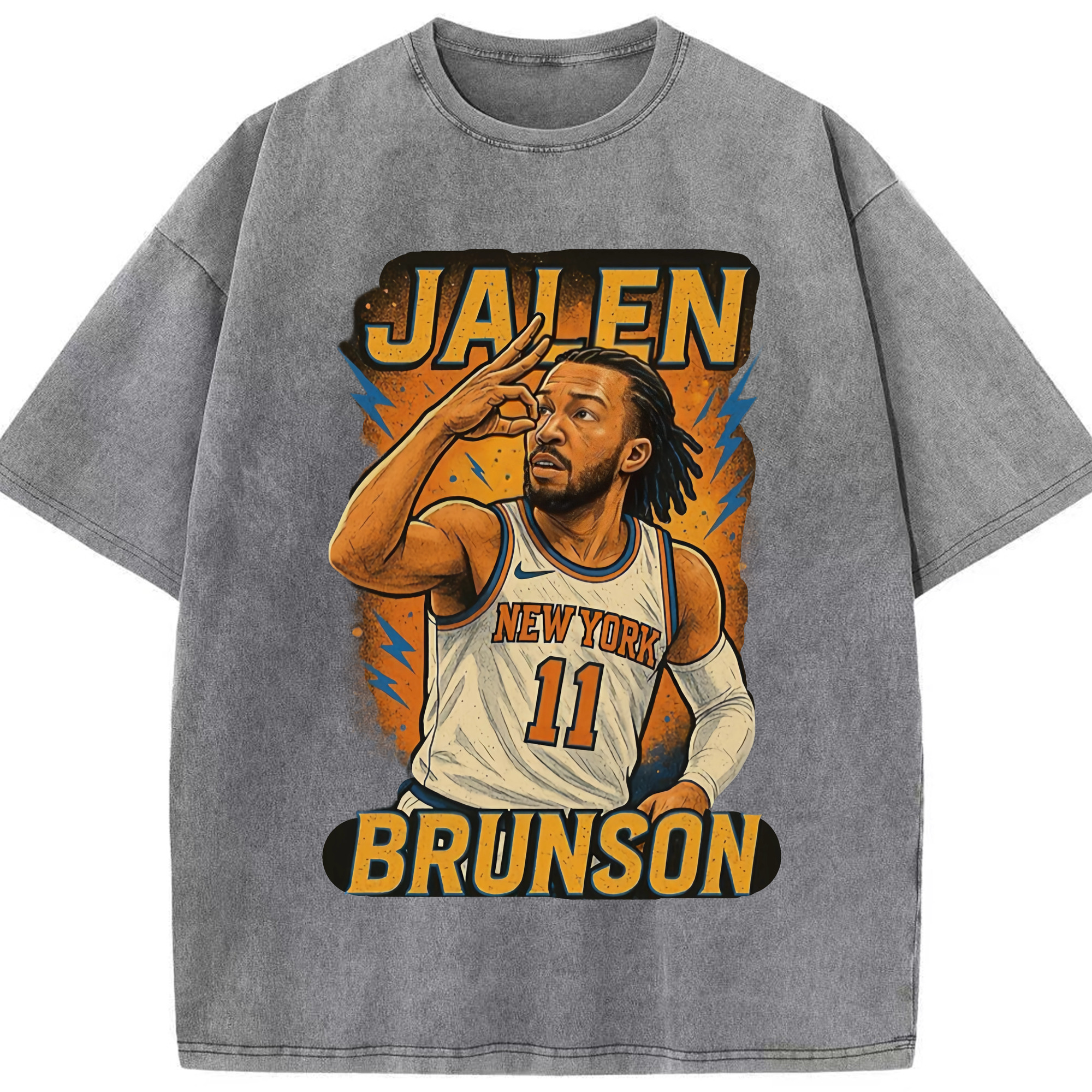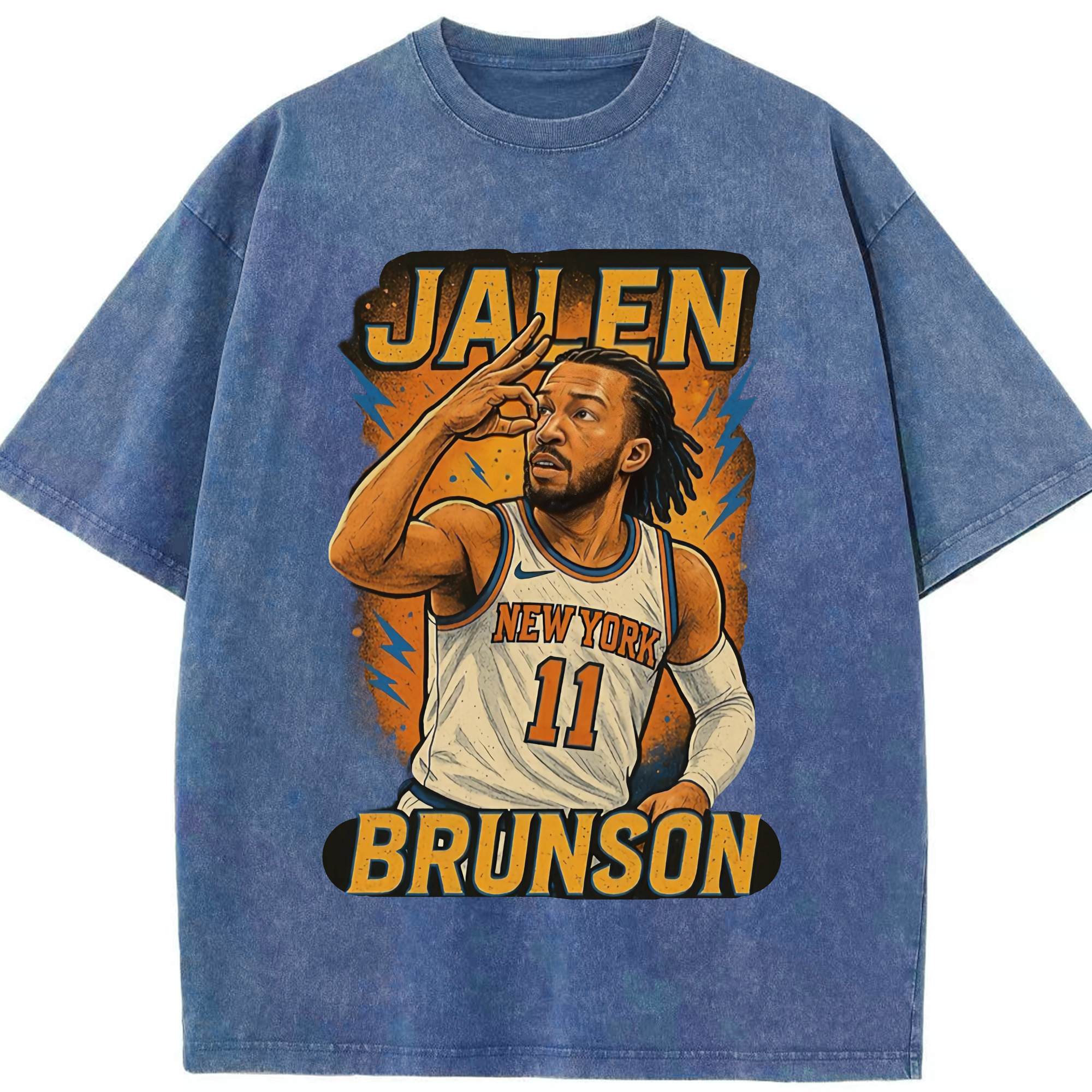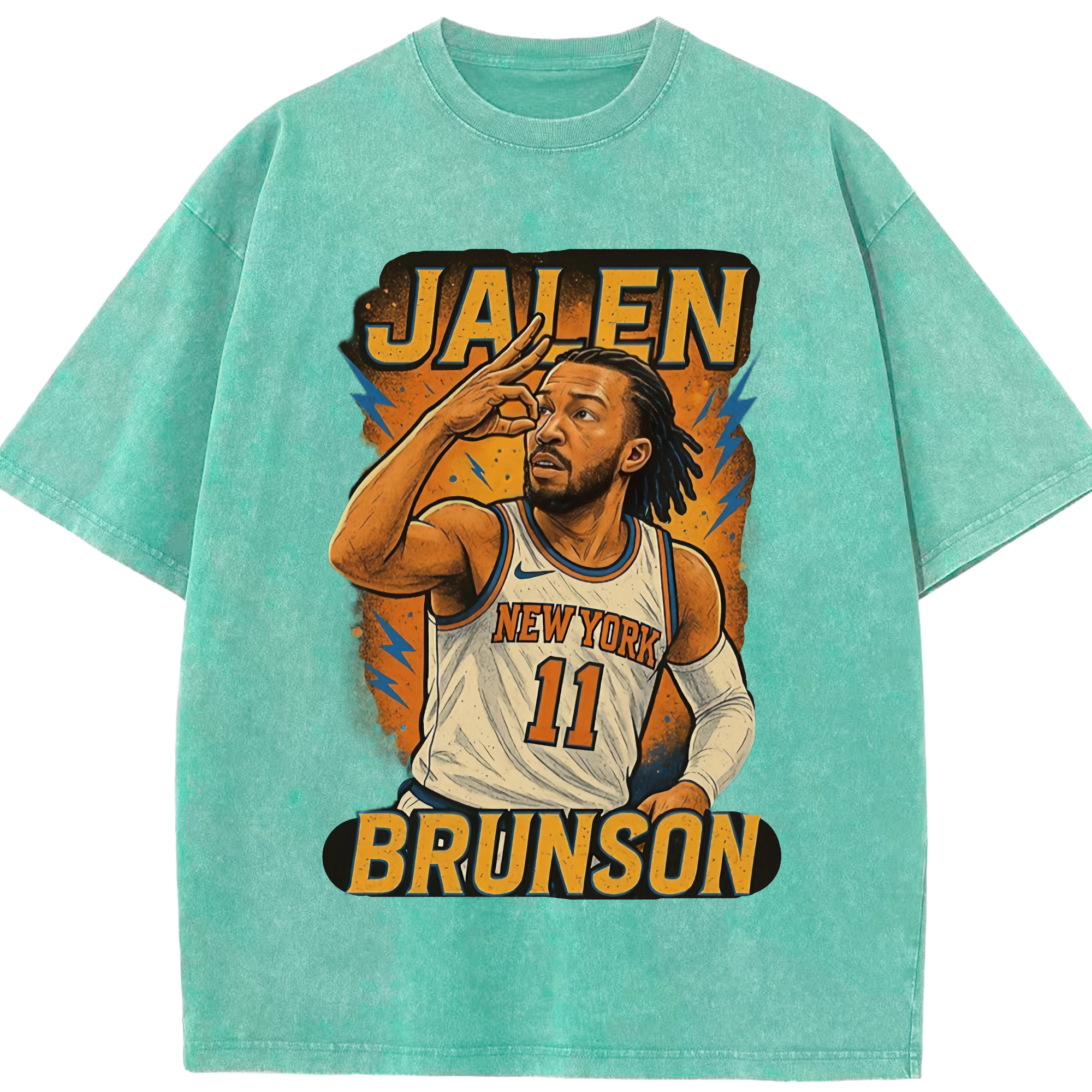 Jalen Brunson Three Point Celebration Cartoon style graphic T‑Shirt - Washed Vintage Look 230g Cotton Oversized T-Shirt With Front Heat Transfer Print – Soft, Lightweight, Stylish Fit – Comfortable Casual Wear For Sports & Everyday Use