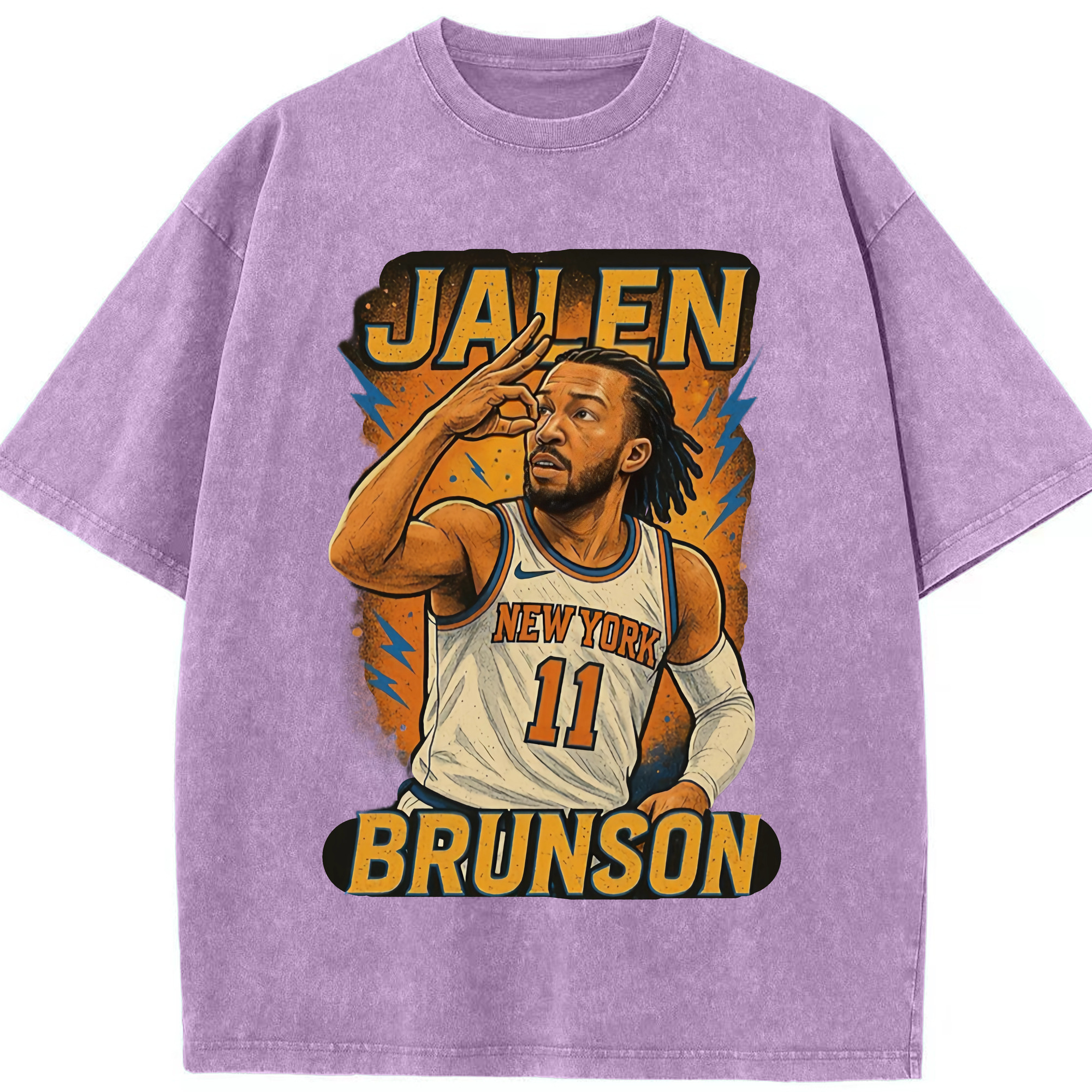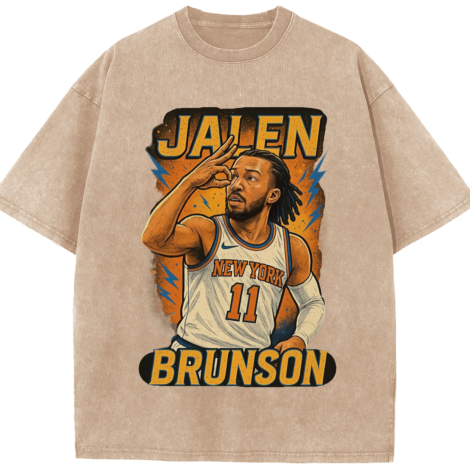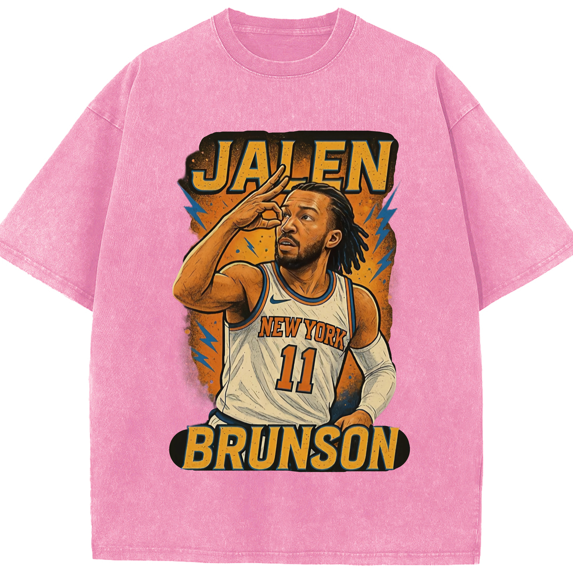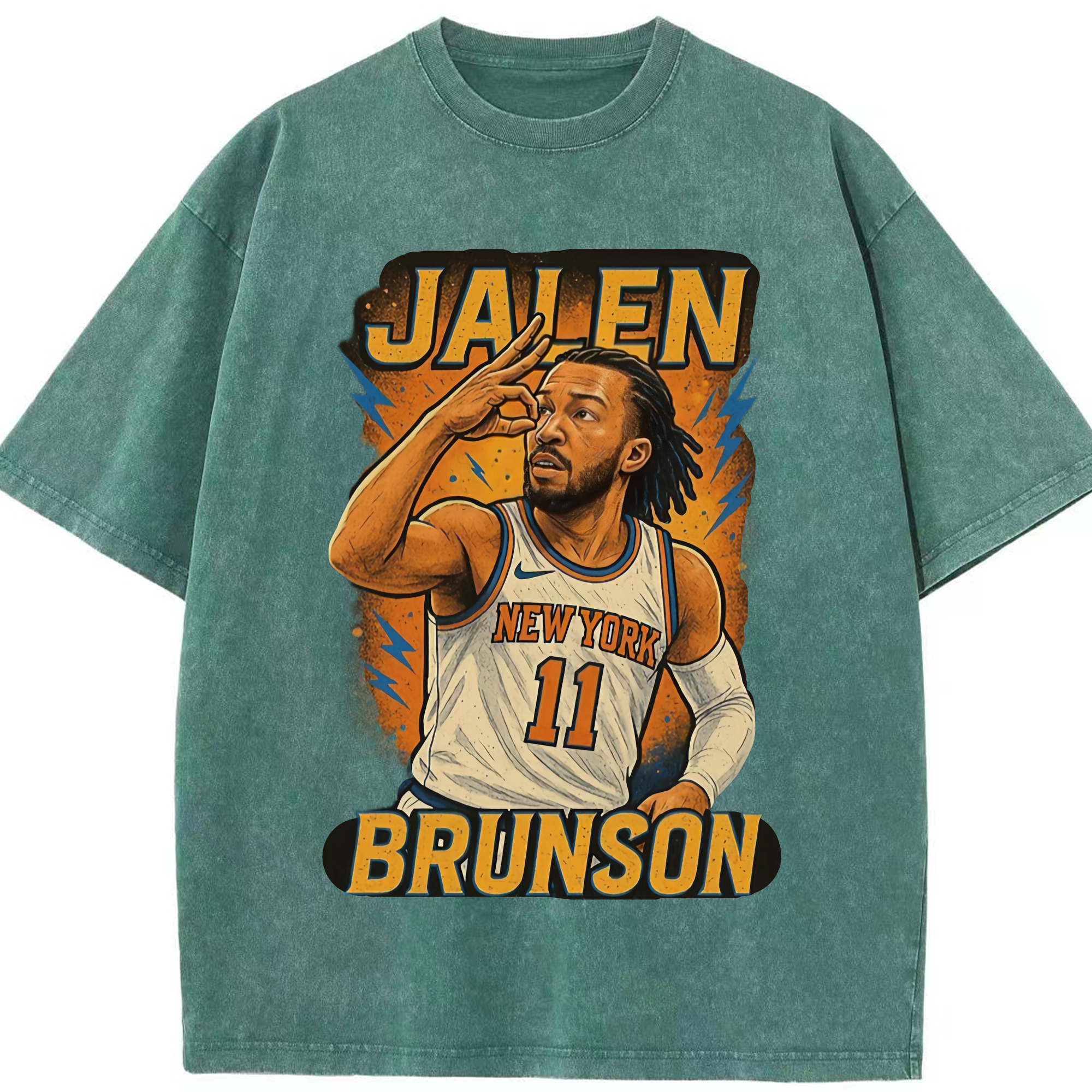 Jalen Brunson Three Point Celebration Cartoon style graphic T‑Shirt - Washed Vintage Look 230g Cotton Oversized T-Shirt With Front Heat Transfer Print – Soft, Lightweight, Stylish Fit – Comfortable Casual Wear For Sports & Everyday Use