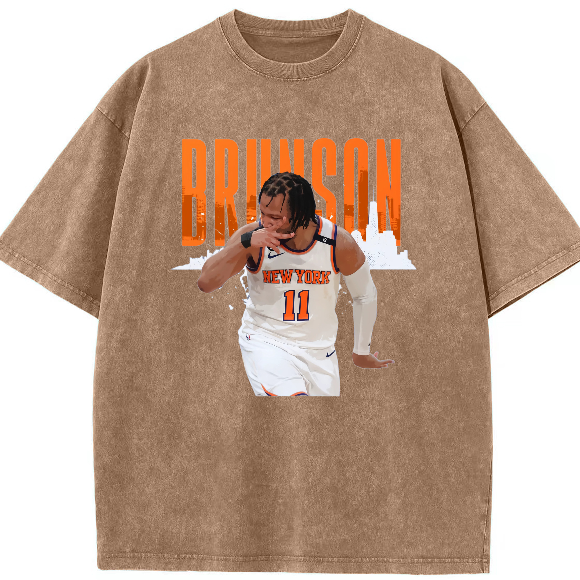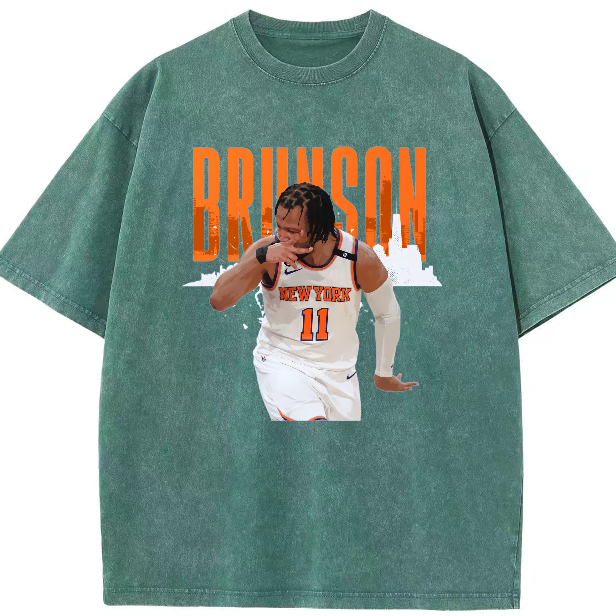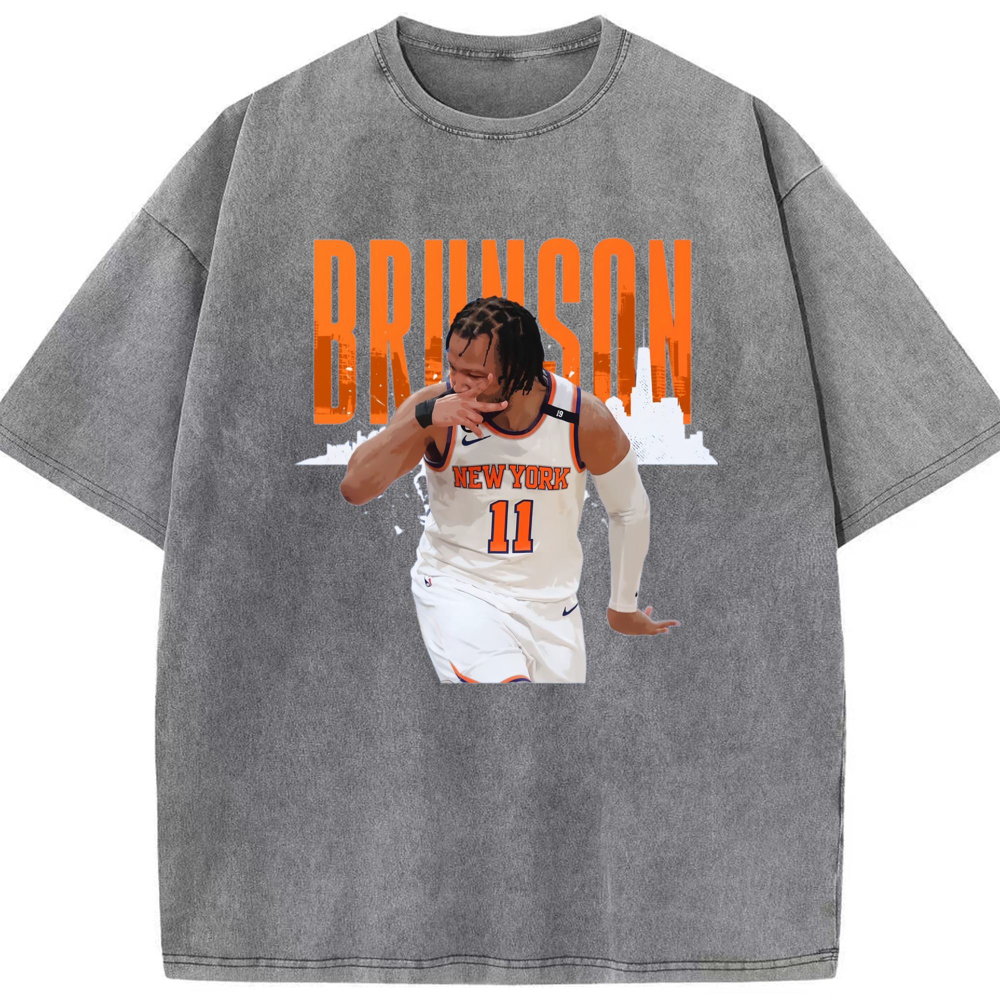 Jalen Brunson Three Point Celebration t-Shirt - Washed Vintage Look 230g Cotton Oversized T-Shirt With Front Heat Transfer Print – Soft, Lightweight, Stylish Fit – Comfortable Casual Wear For Sports & Everyday Use