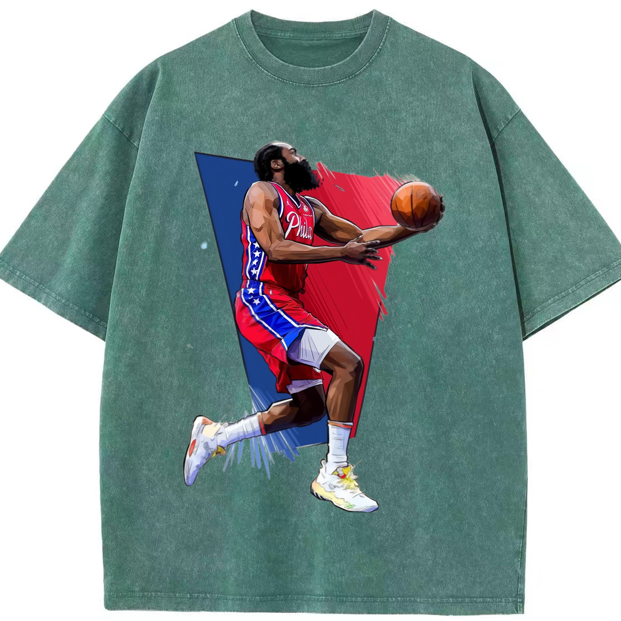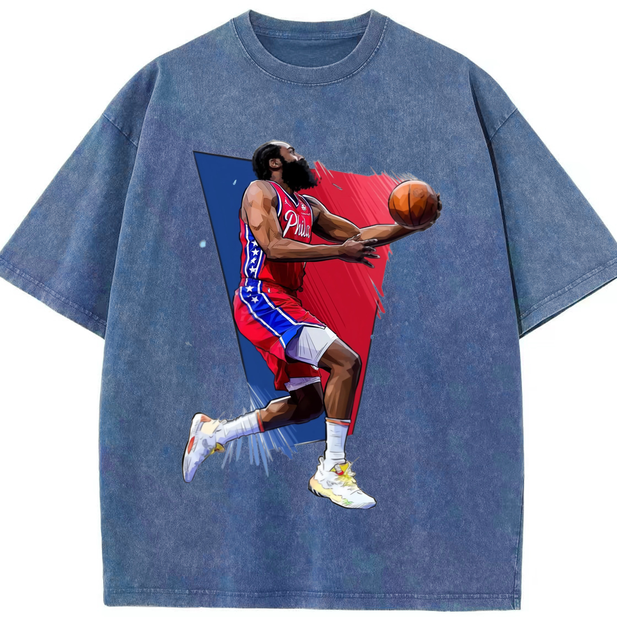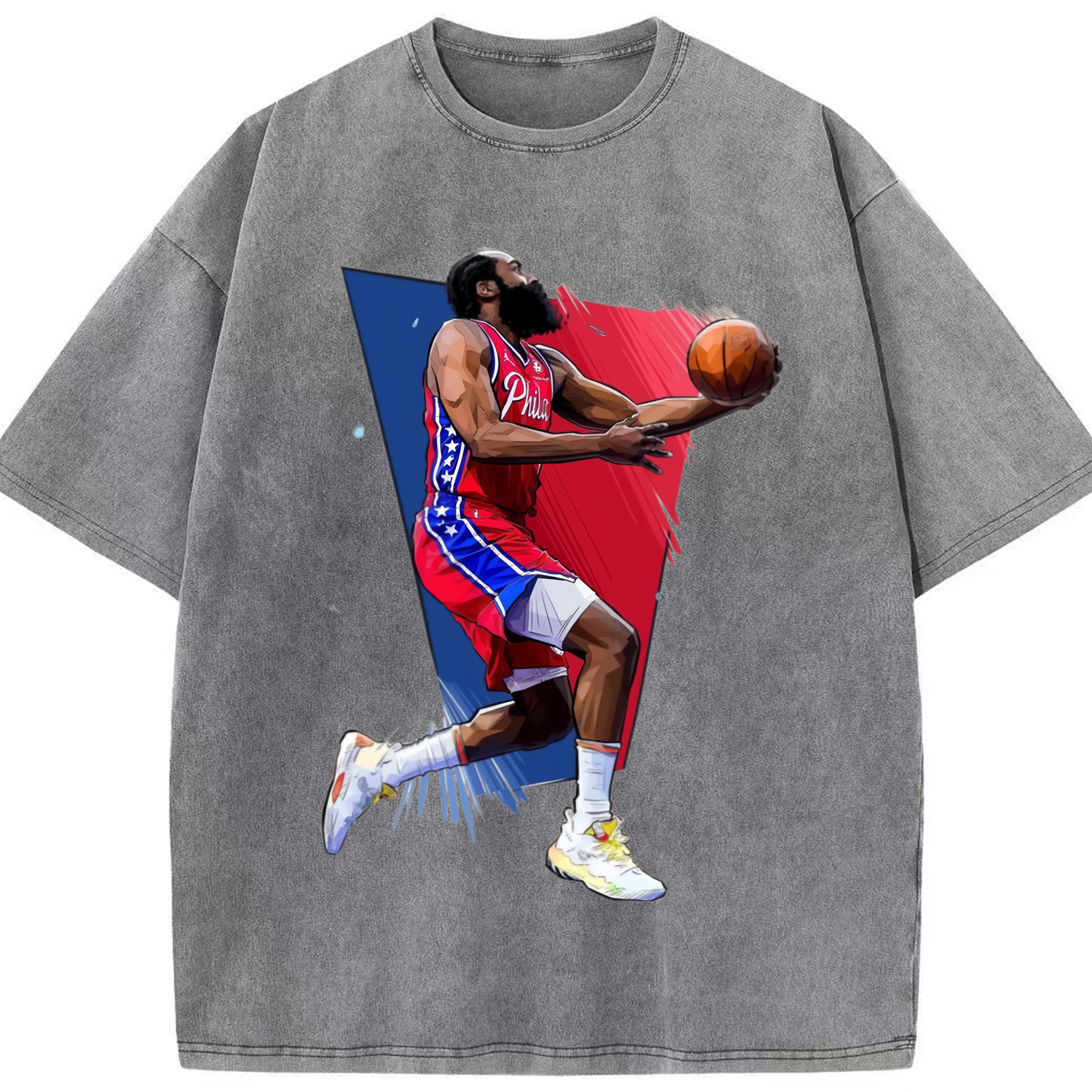 James Harden 76er comic style T‑shirt - Washed Vintage Look 230g Cotton Oversized T-Shirt With Front Heat Transfer Print – Soft, Lightweight, Stylish Fit – Comfortable Casual Wear For Sports & Everyday Use