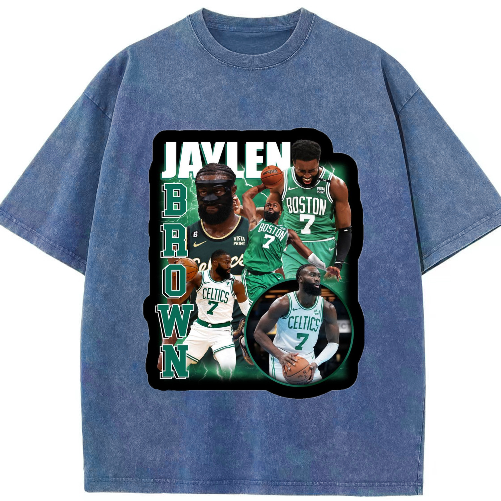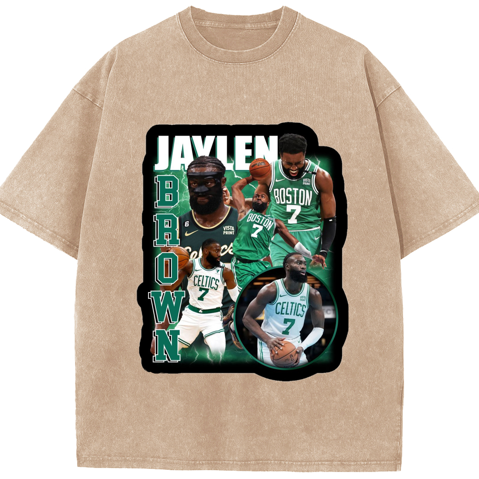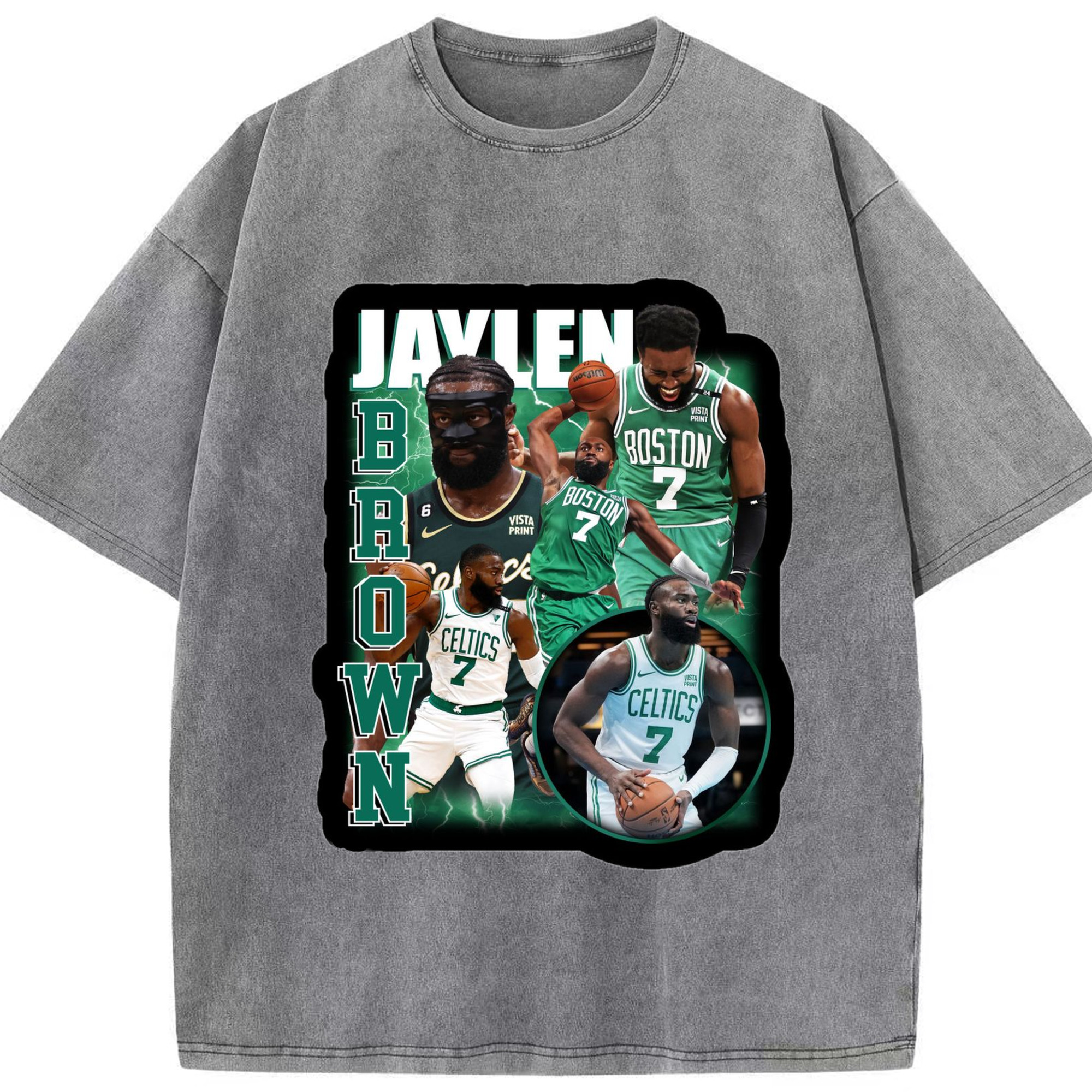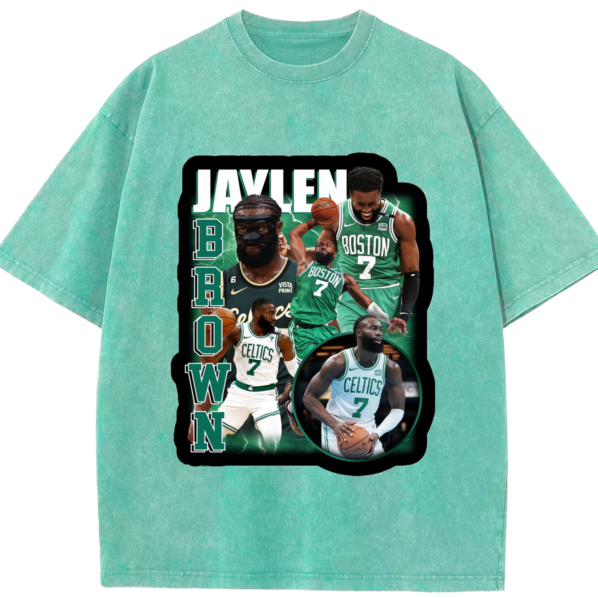 Jaylen Brown Collage graphic T‑Shirt - Washed Vintage Look 230g Cotton Oversized T-Shirt With Front Heat Transfer Print – Soft, Lightweight, Stylish Fit – Comfortable Casual Wear For Sports & Everyday Use
