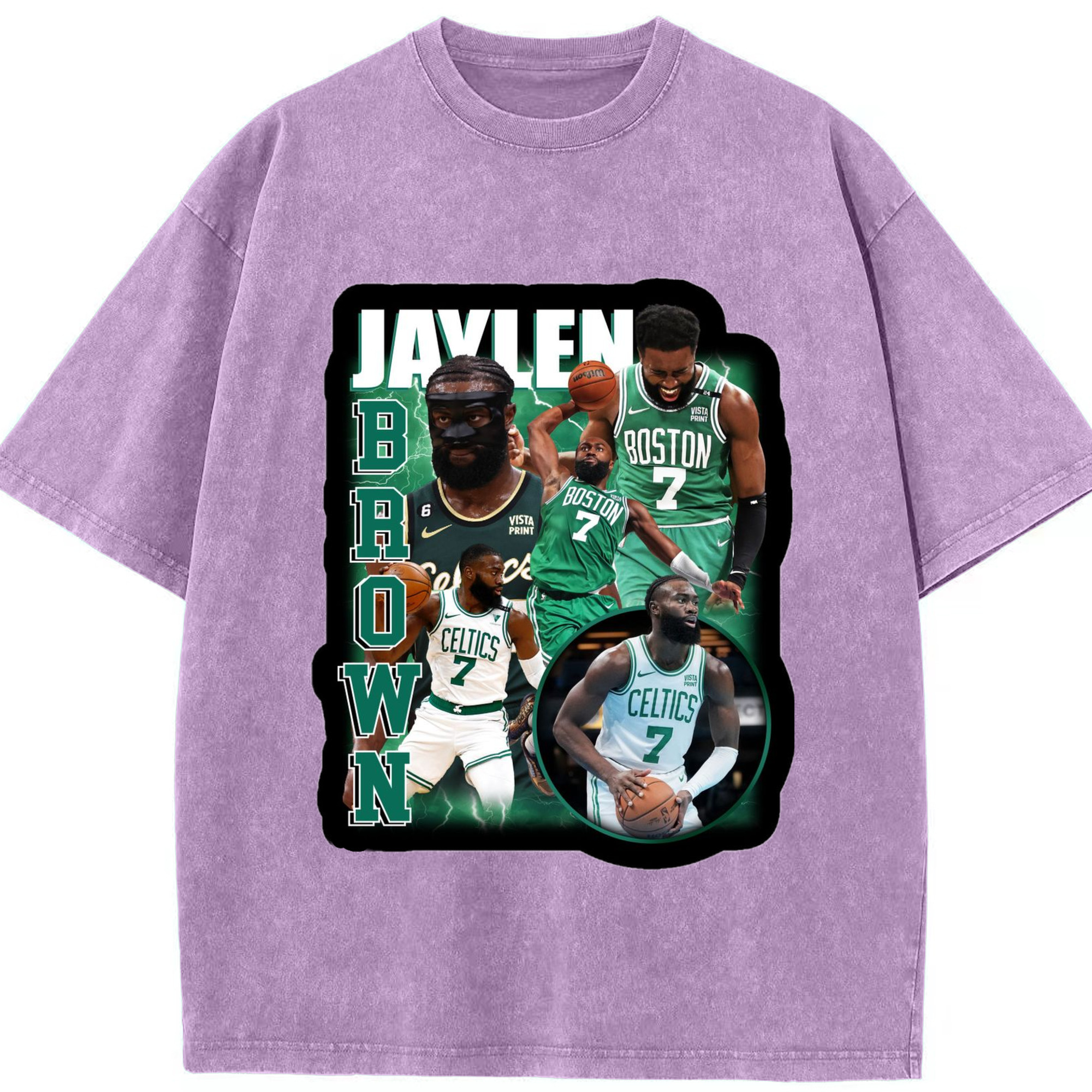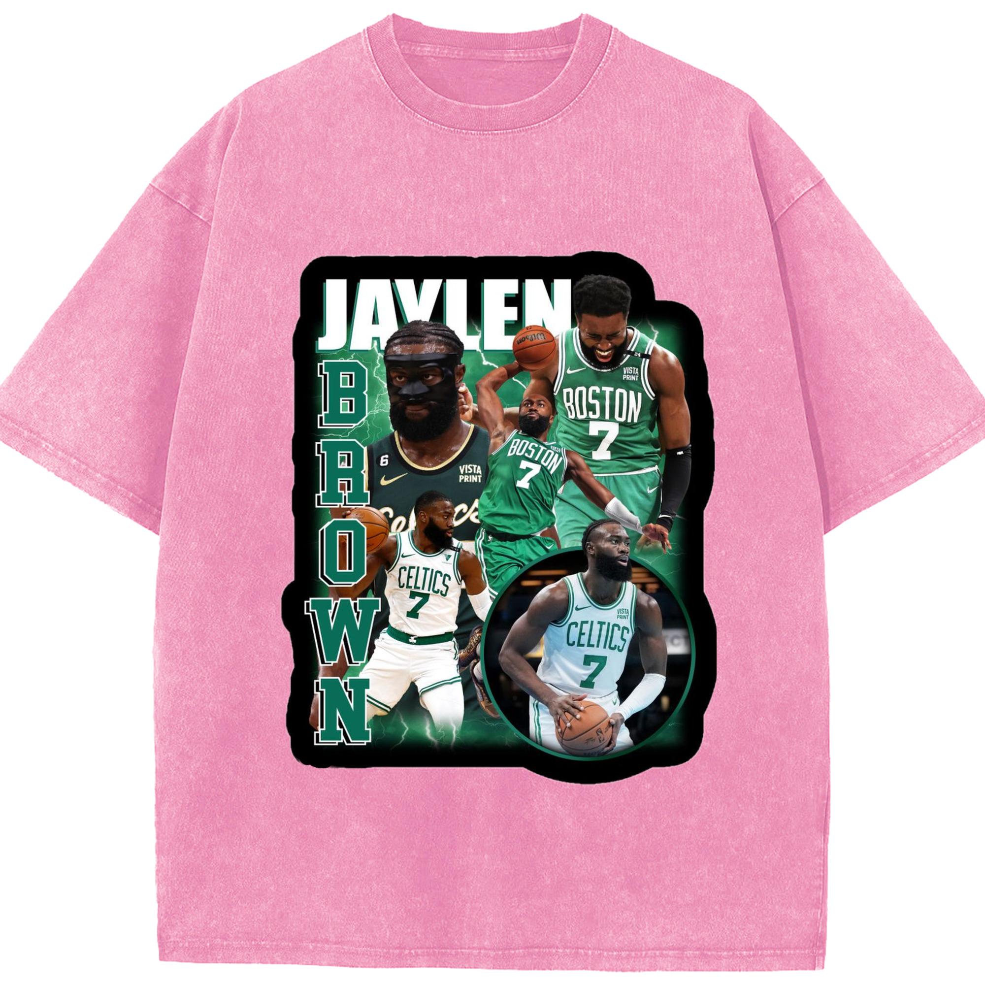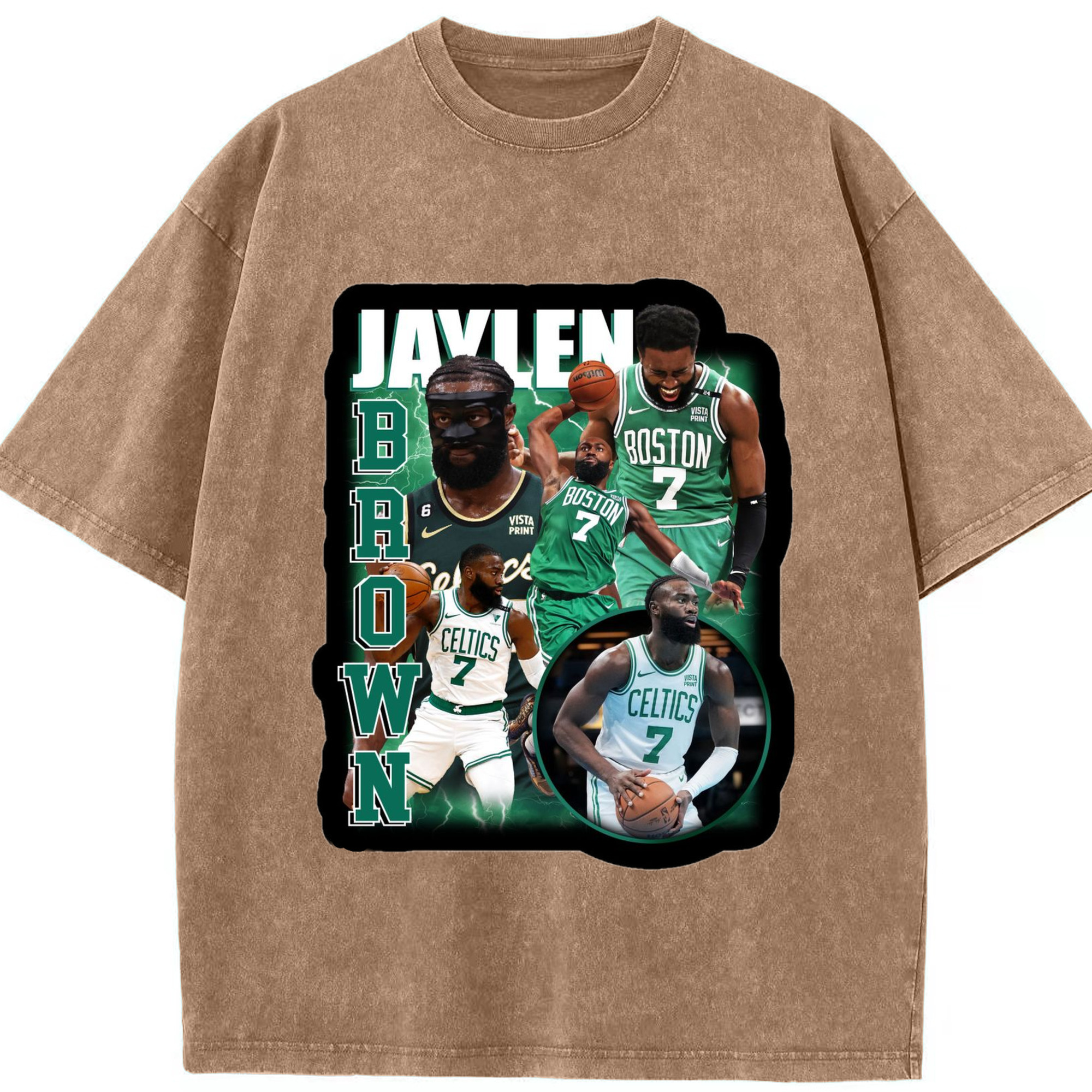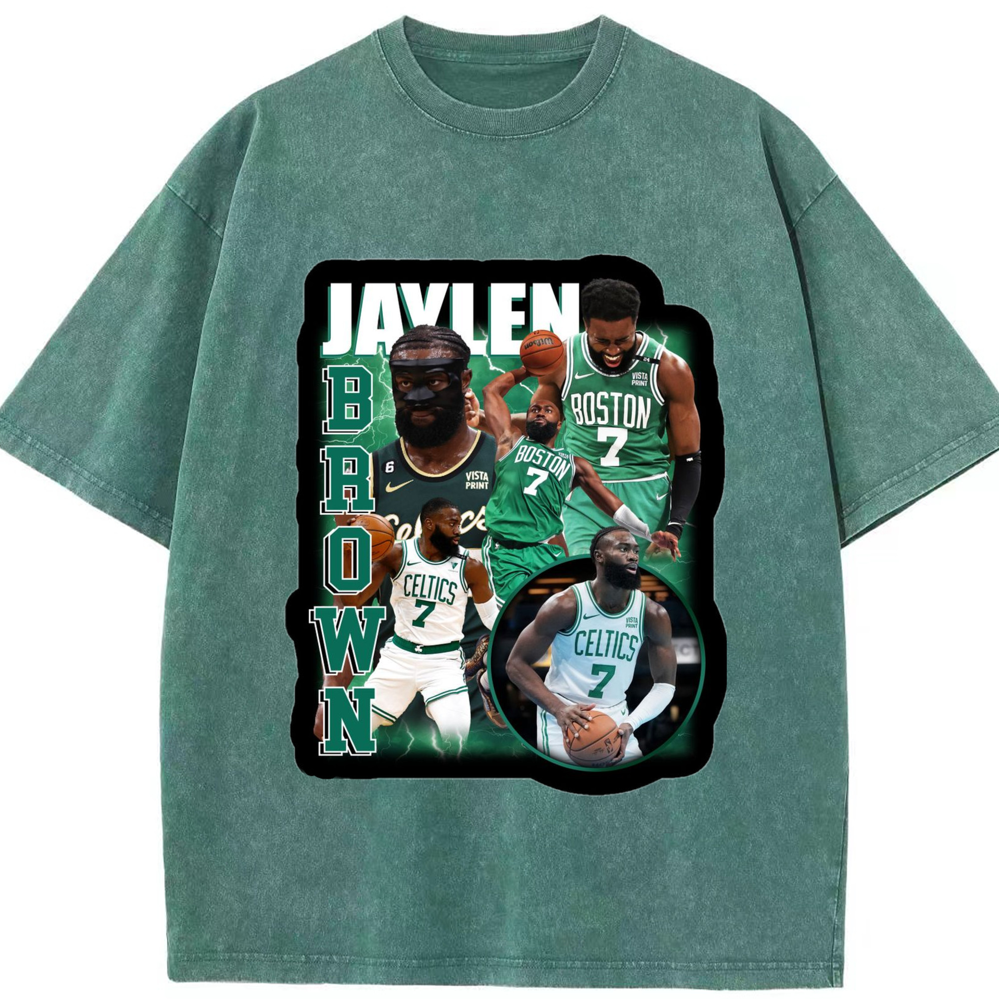 Jaylen Brown Collage graphic T‑Shirt - Washed Vintage Look 230g Cotton Oversized T-Shirt With Front Heat Transfer Print – Soft, Lightweight, Stylish Fit – Comfortable Casual Wear For Sports & Everyday Use