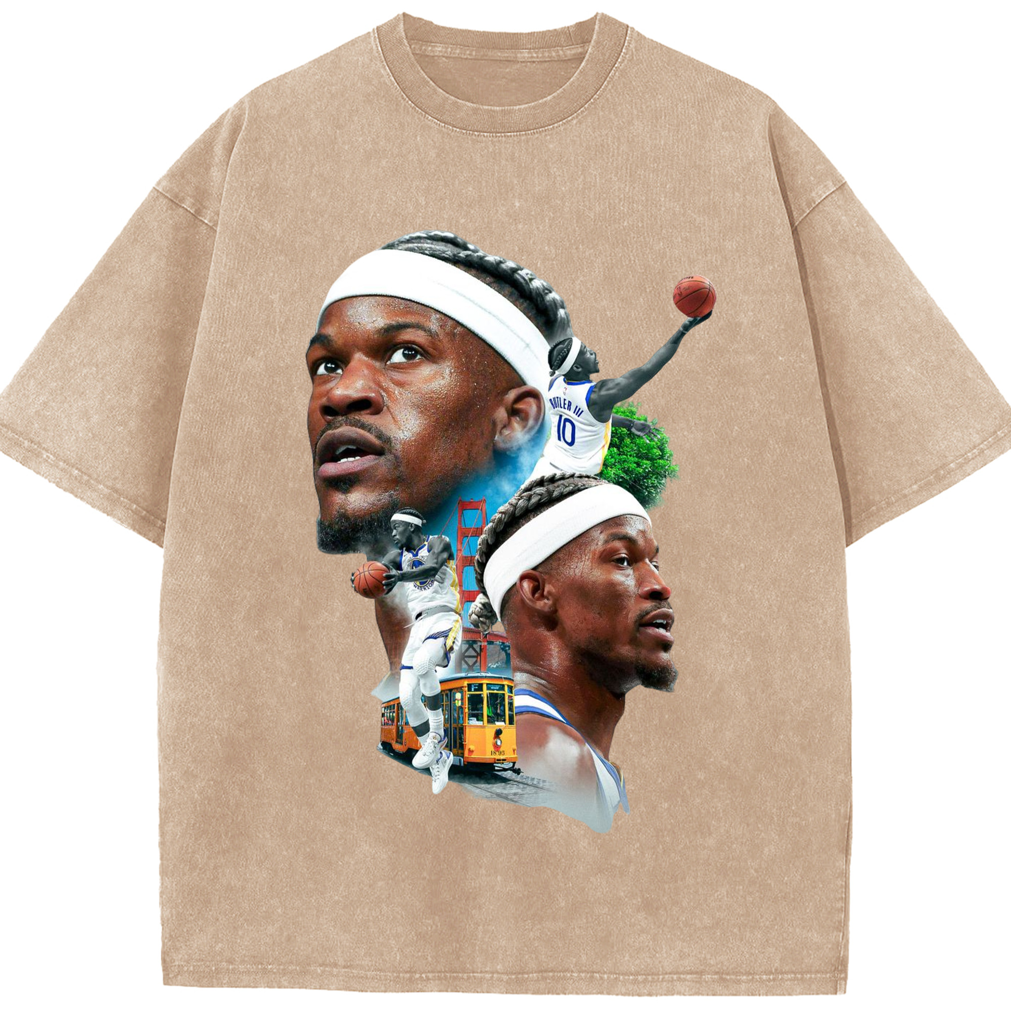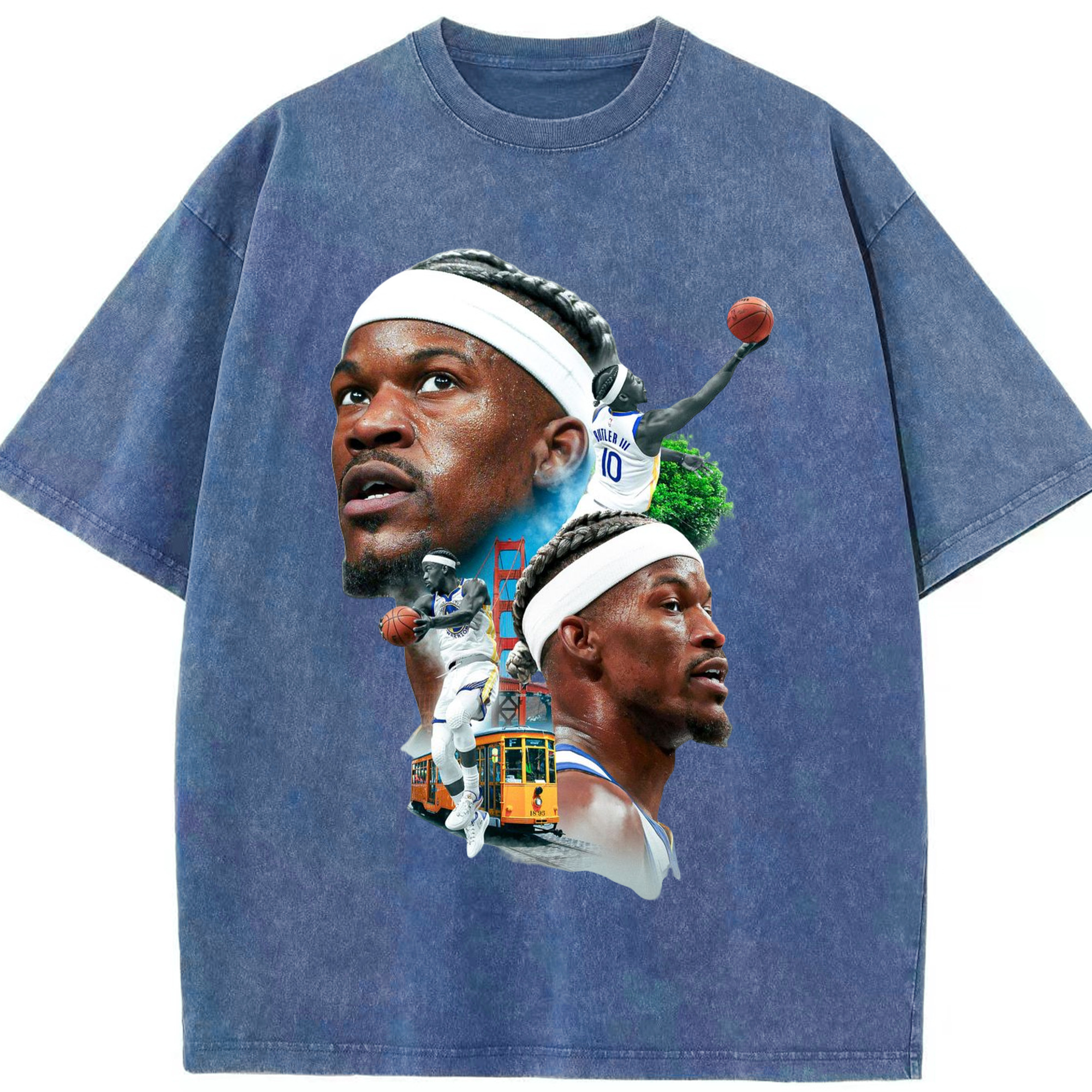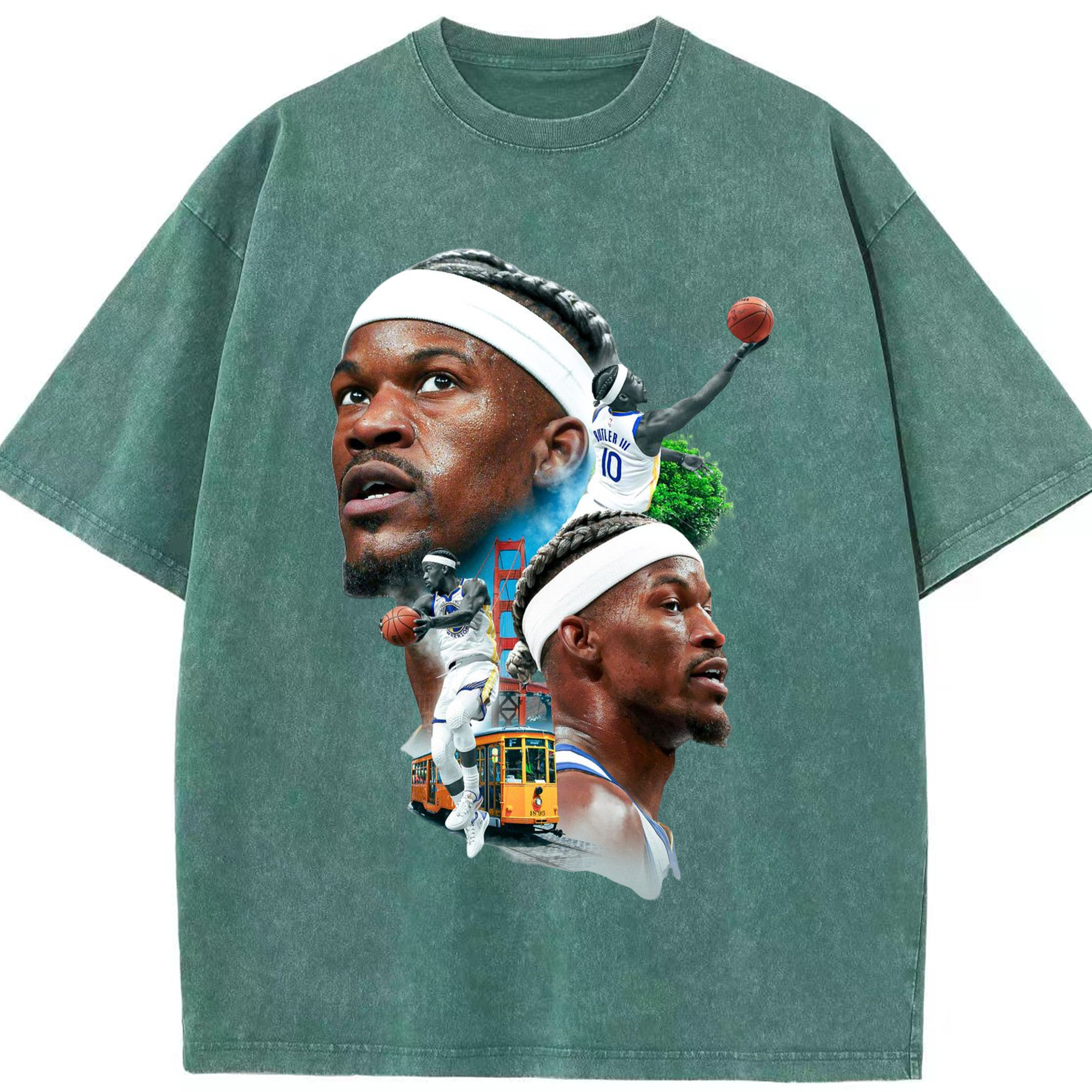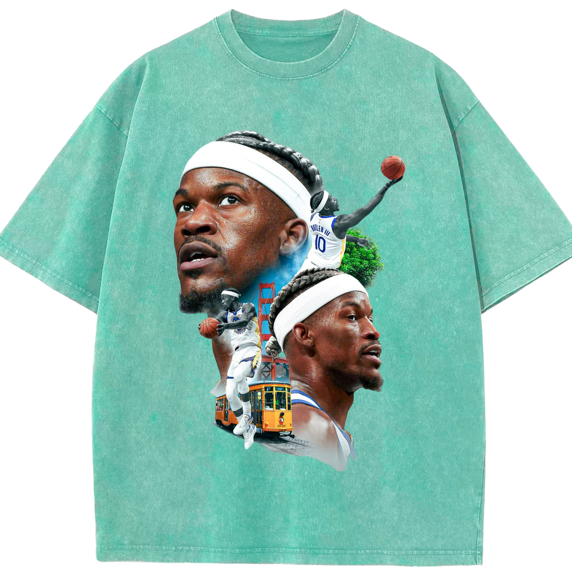 Jimmy butler warriors Collage graphic T‑Shirt - Washed Vintage Look 230g Cotton Oversized T-Shirt With Front Heat Transfer Print – Soft, Lightweight, Stylish Fit – Comfortable Casual Wear For Sports & Everyday Use