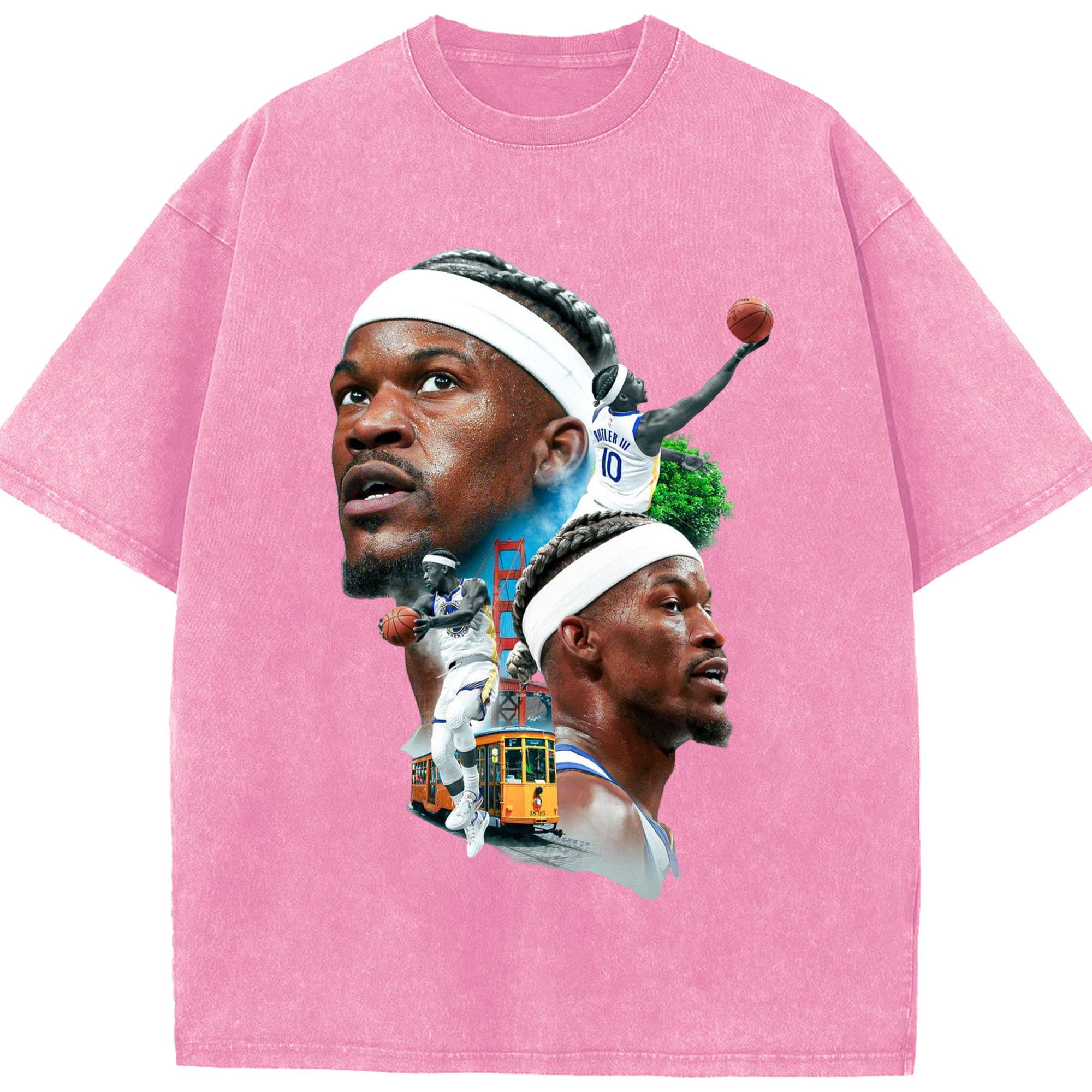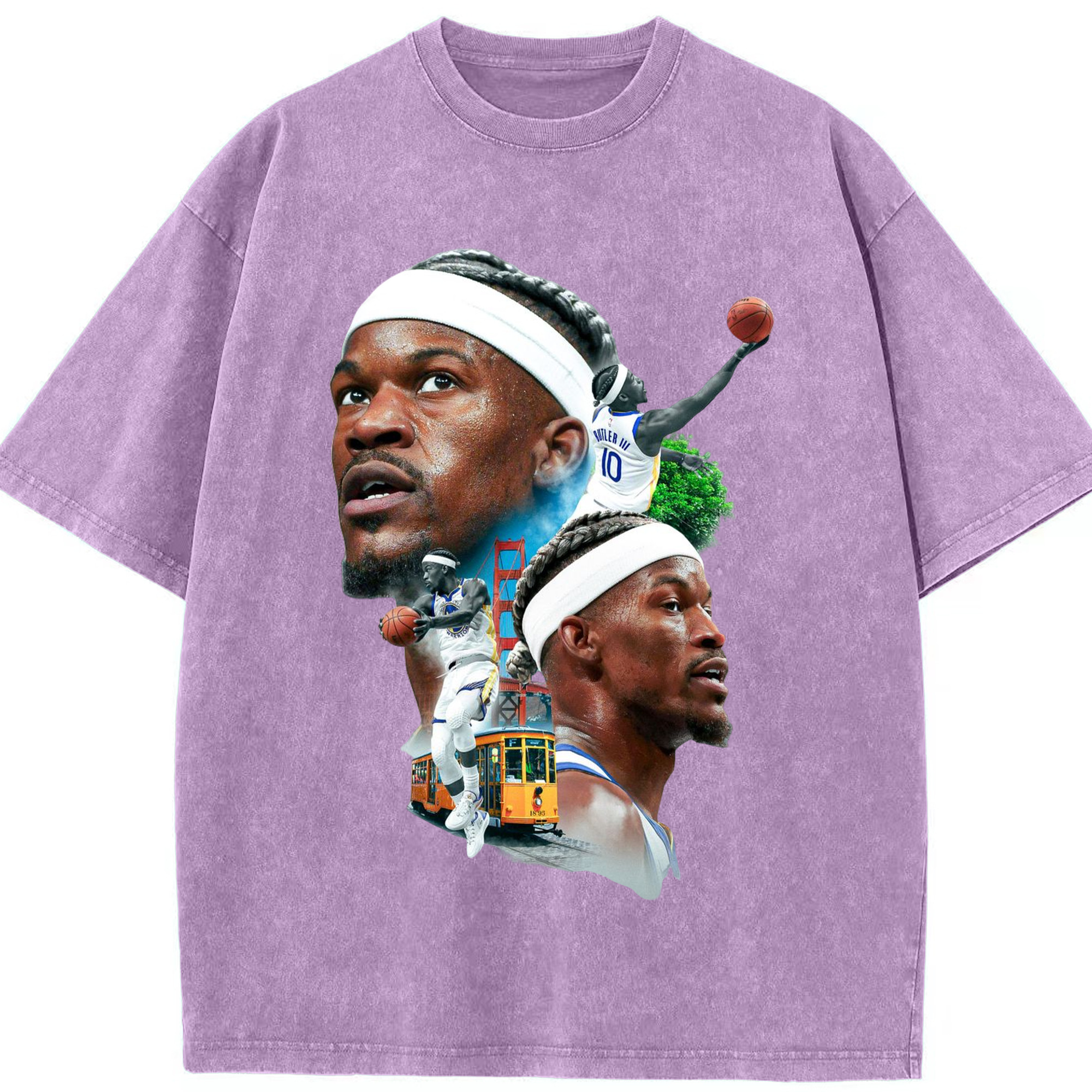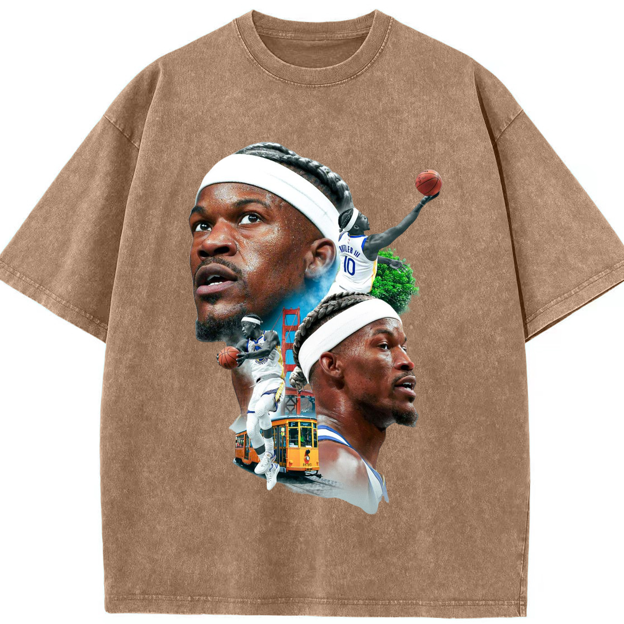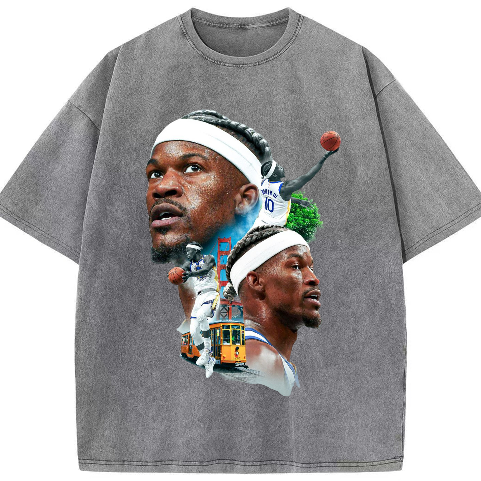 Jimmy butler warriors Collage graphic T‑Shirt - Washed Vintage Look 230g Cotton Oversized T-Shirt With Front Heat Transfer Print – Soft, Lightweight, Stylish Fit – Comfortable Casual Wear For Sports & Everyday Use