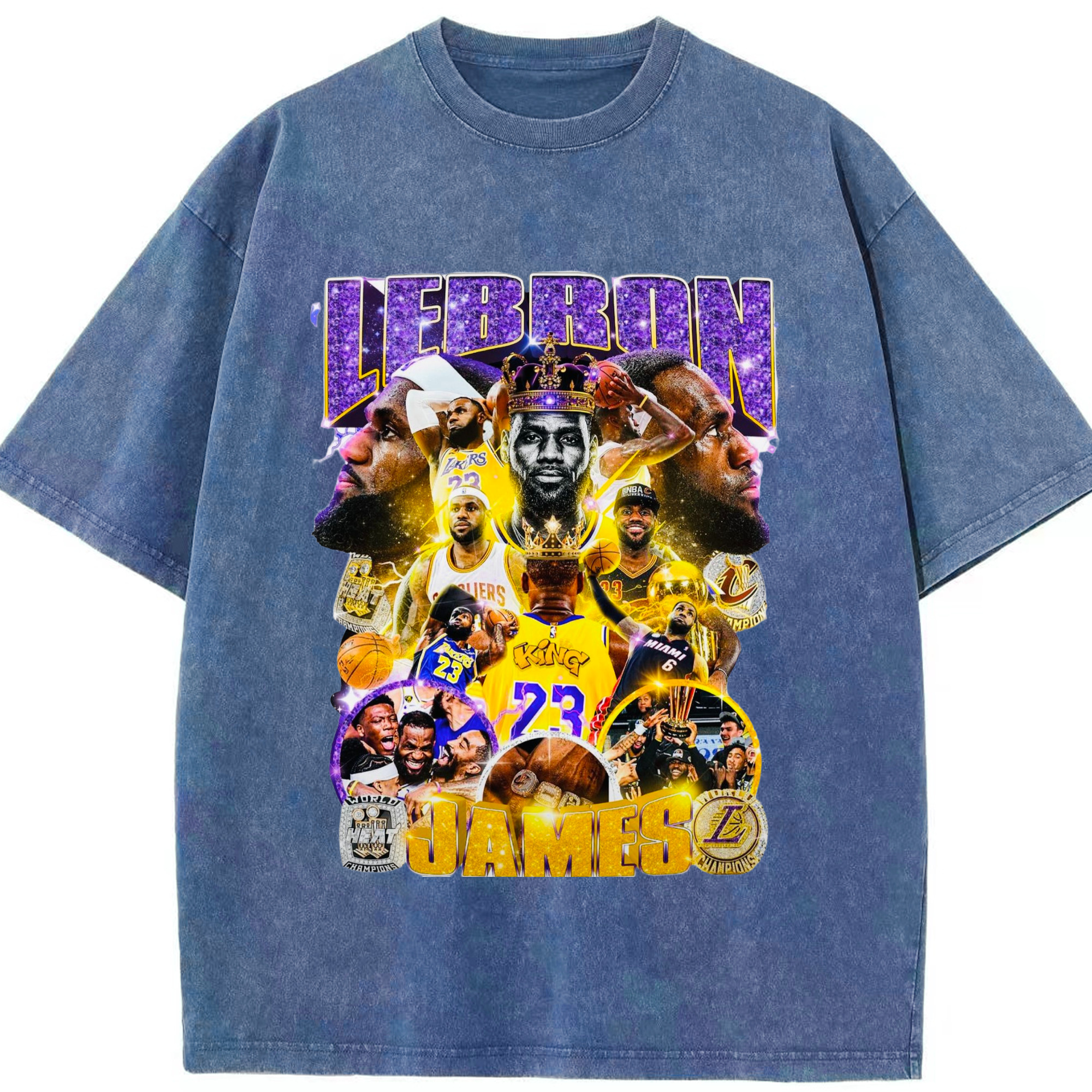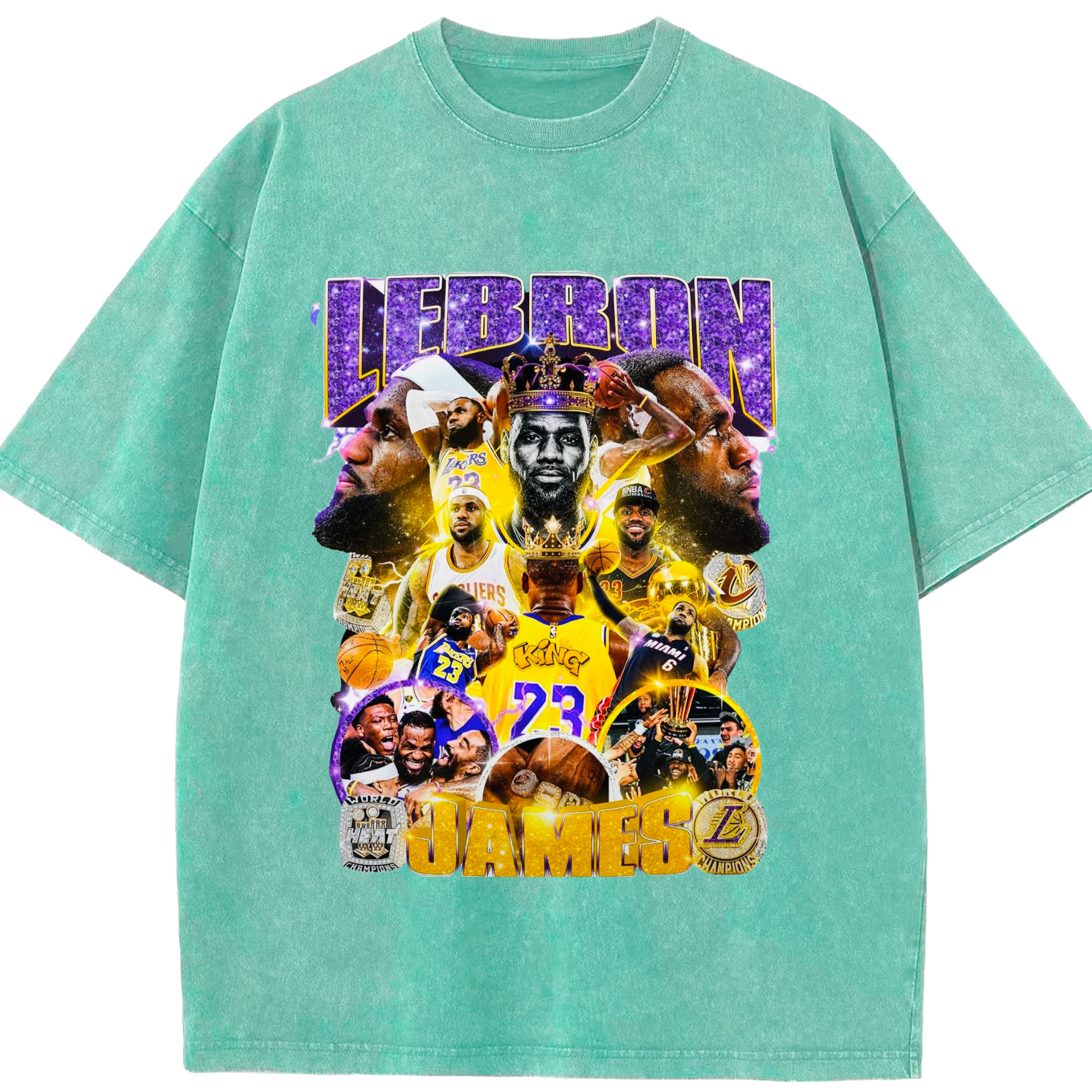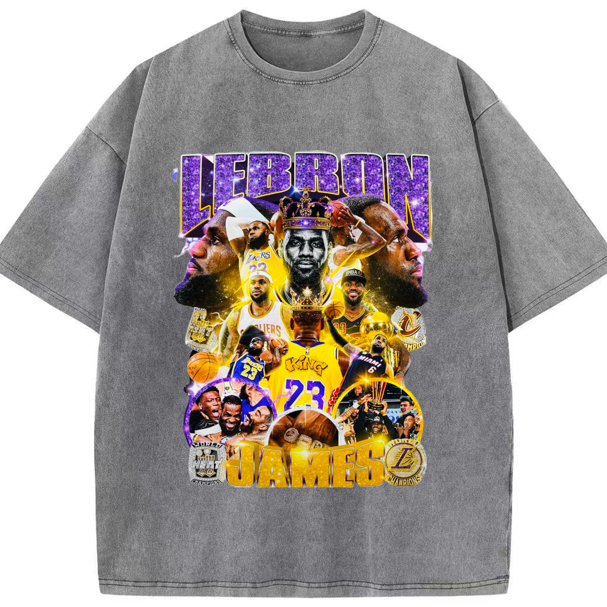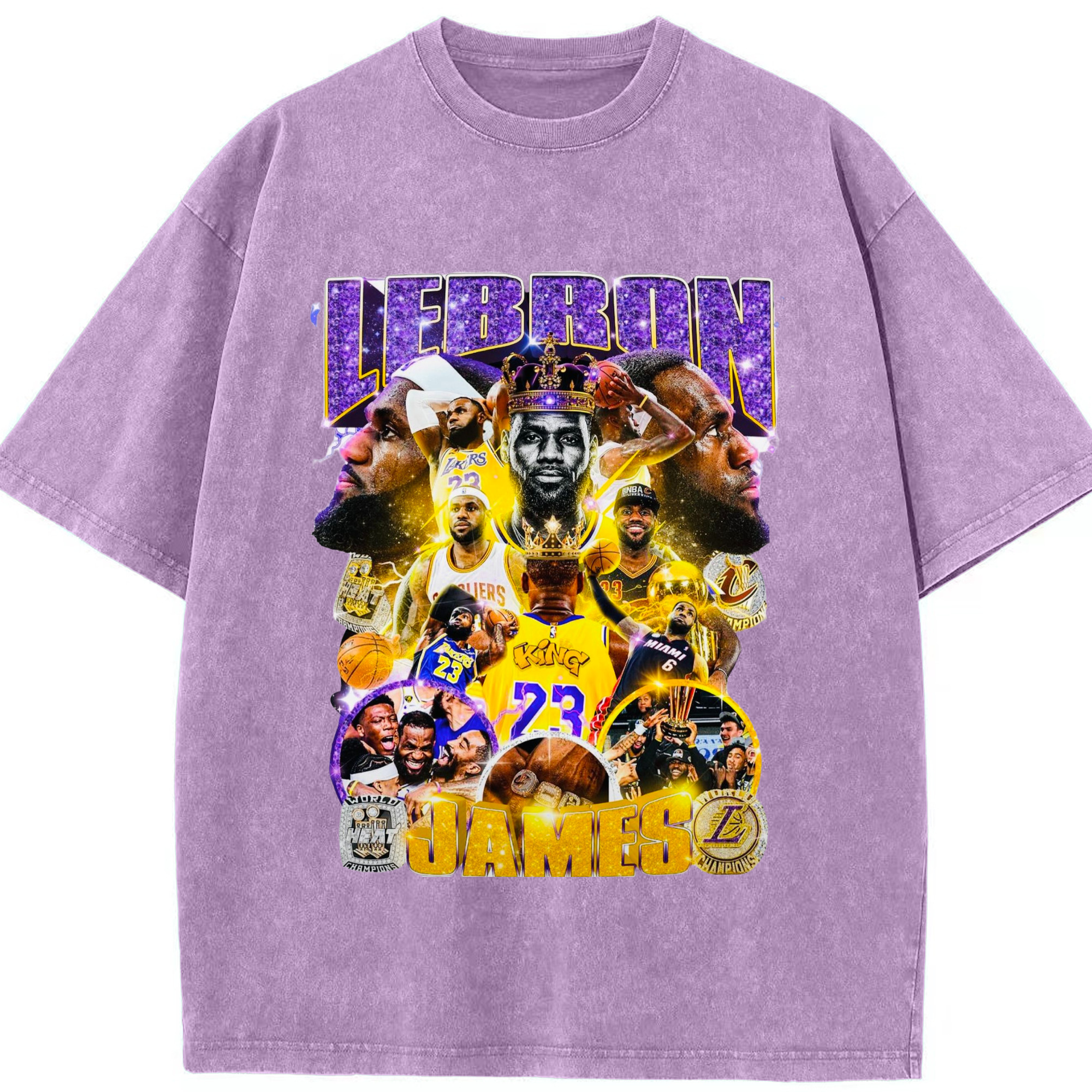 Lakers lebron james #6 #23 collage graphic T‑Shirt - Washed Vintage Look 230g Cotton Oversized T-Shirt With Front Heat Transfer Print – Soft, Lightweight, Stylish Fit – Comfortable Casual Wear For Sports & Everyday Use
