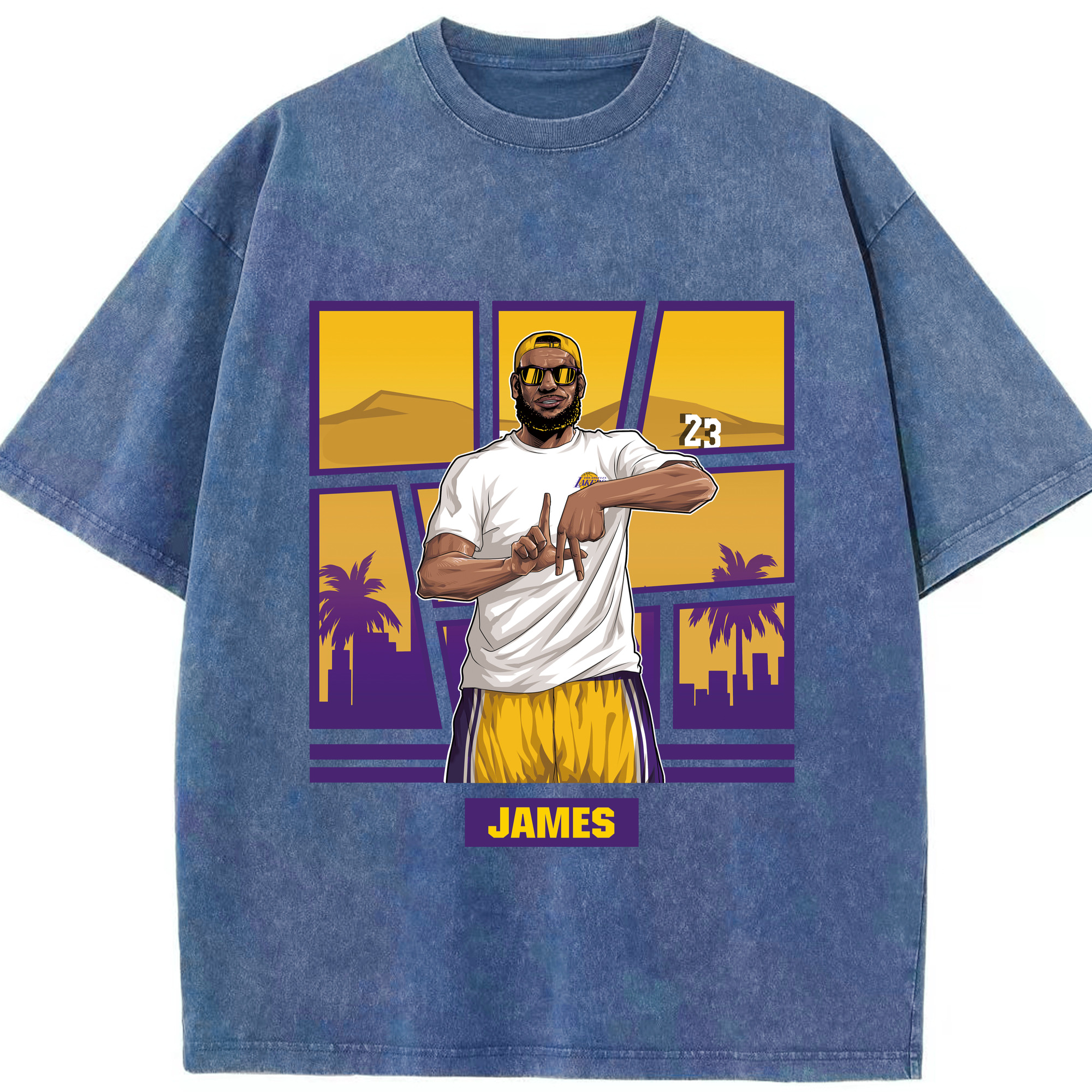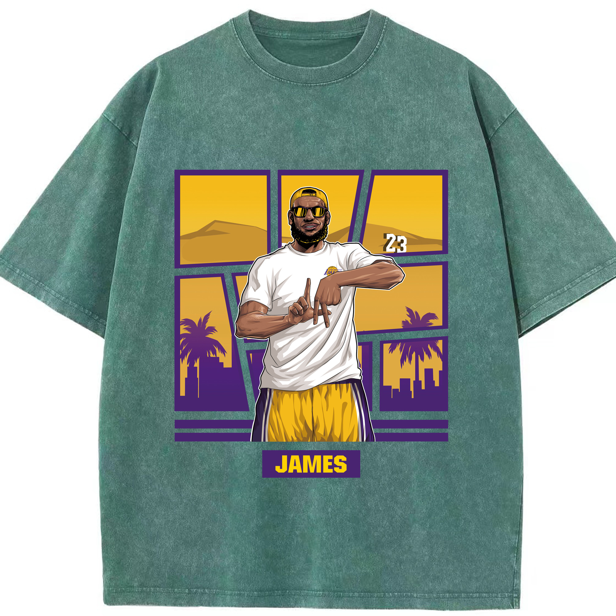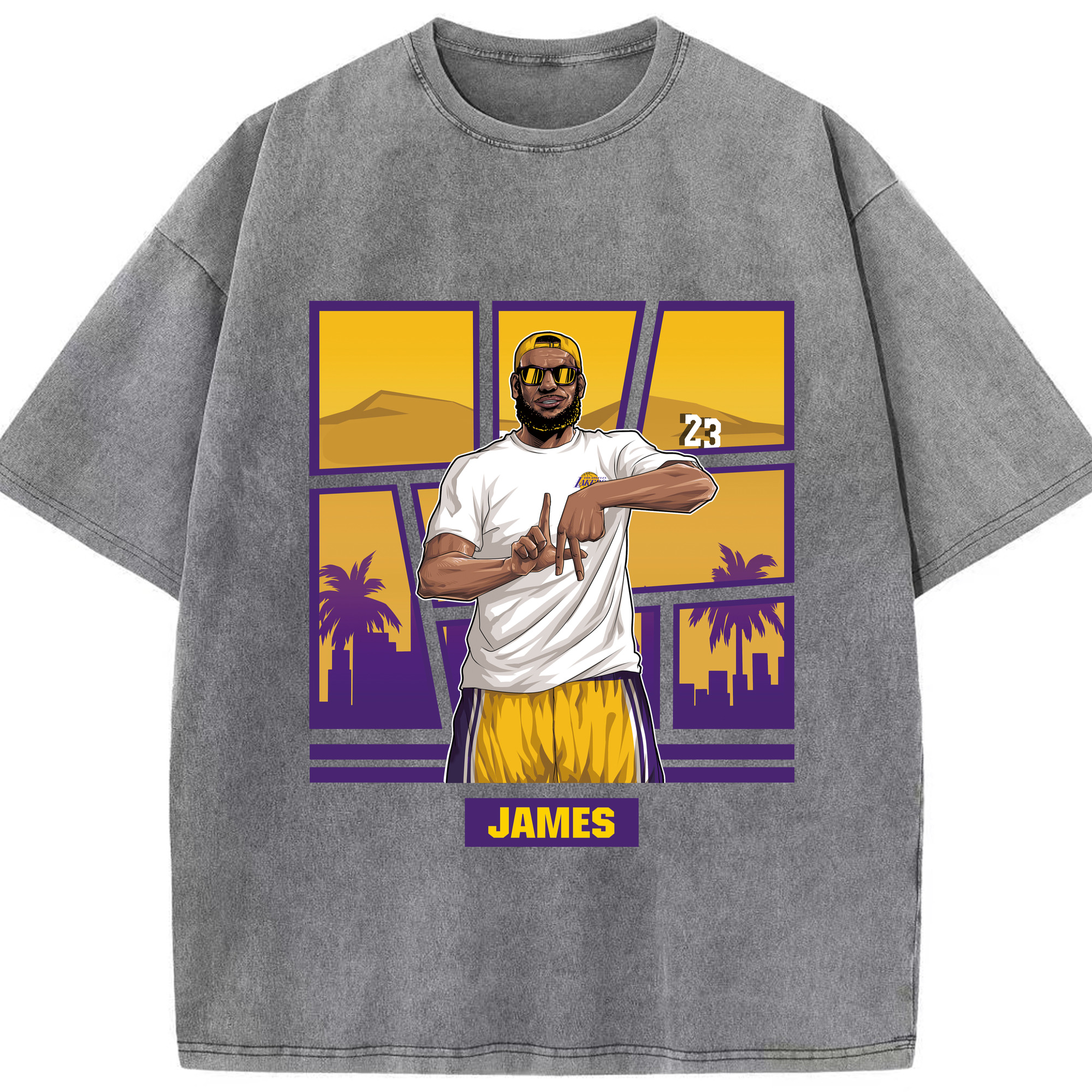 LeBron James 'LA' gesture c - Washed Vintage Look 230g Cotton Oversized T-Shirt With Front Heat Transfer Print – Soft, Lightweight, Stylish Fit – Comfortable Casual Wear For Sports & Everyday Use