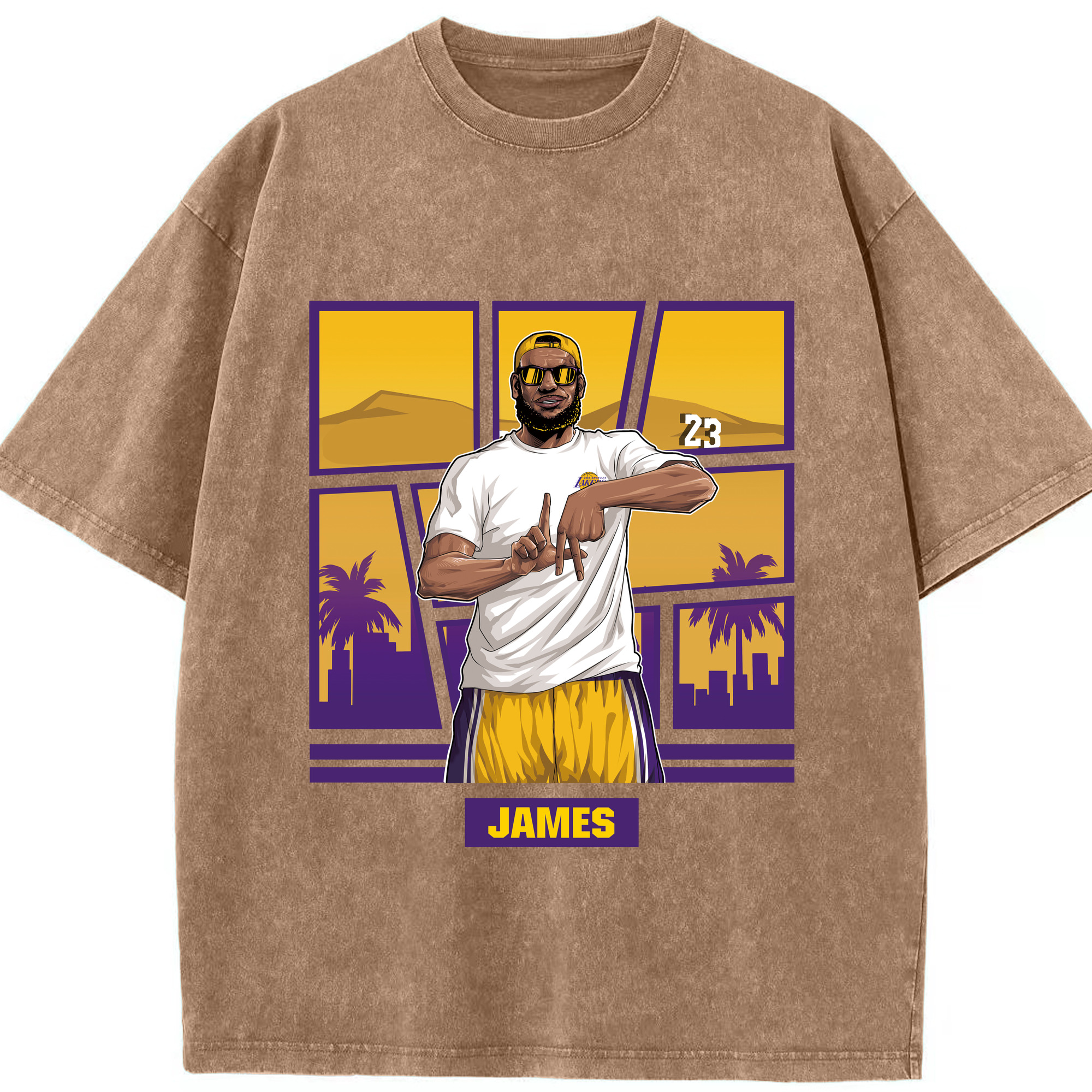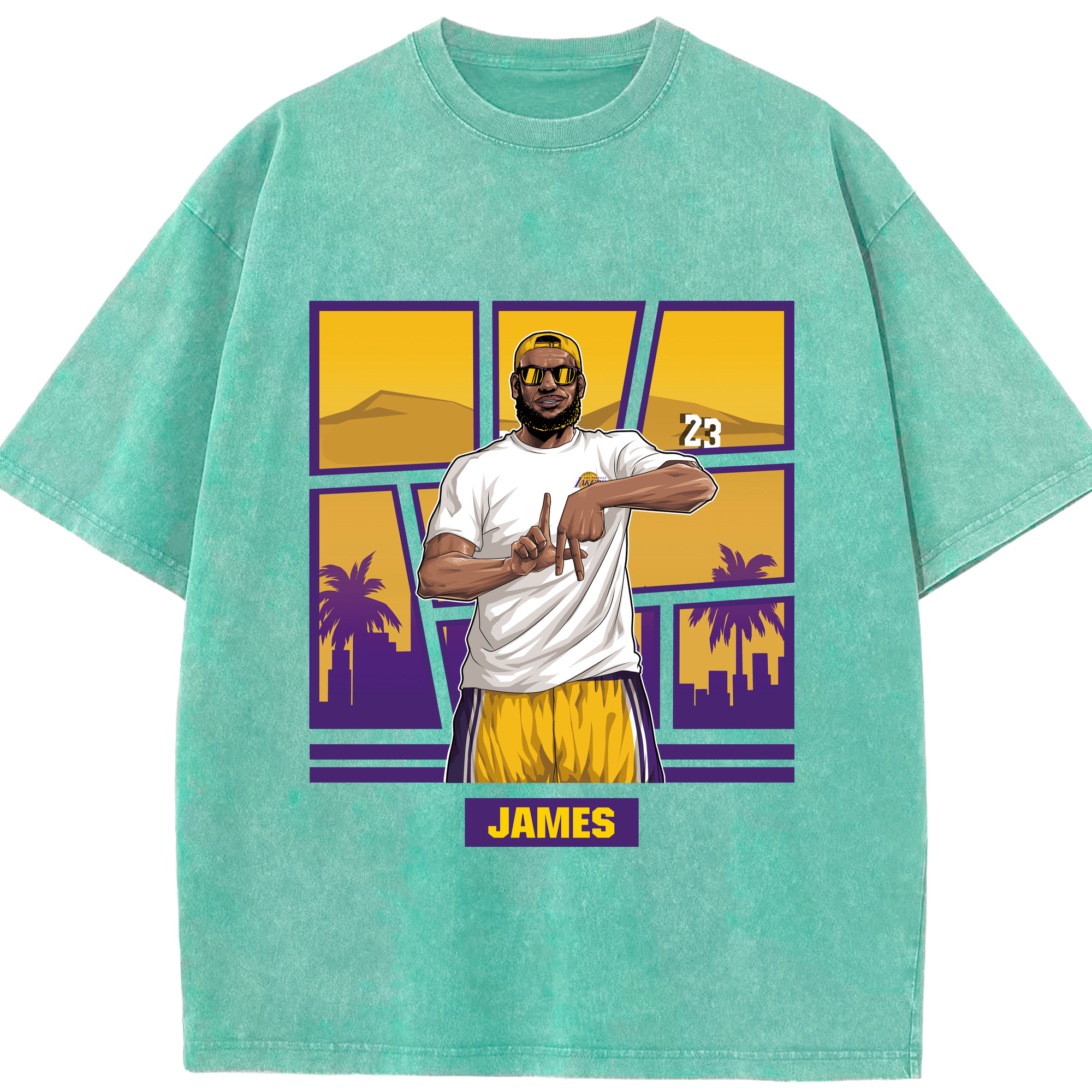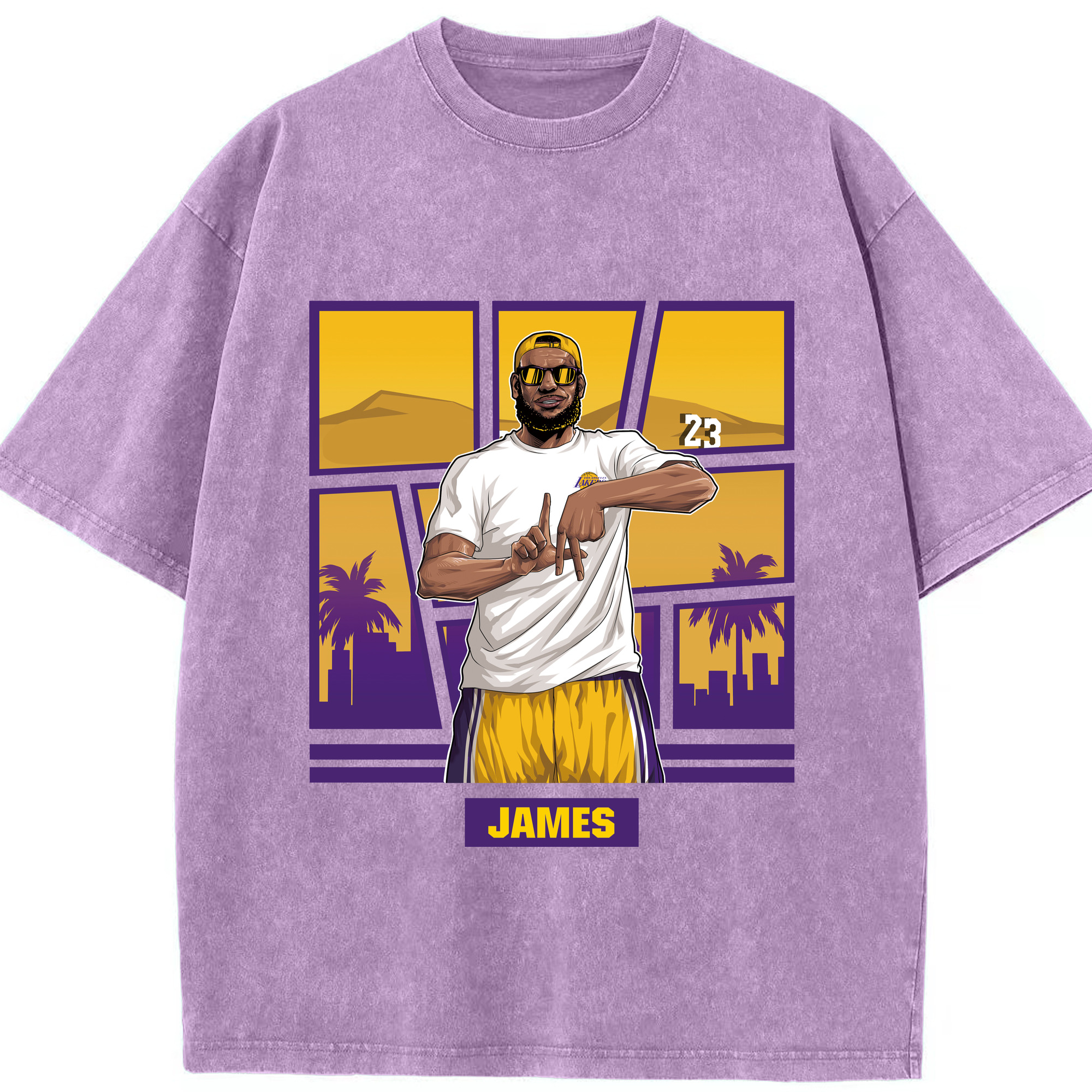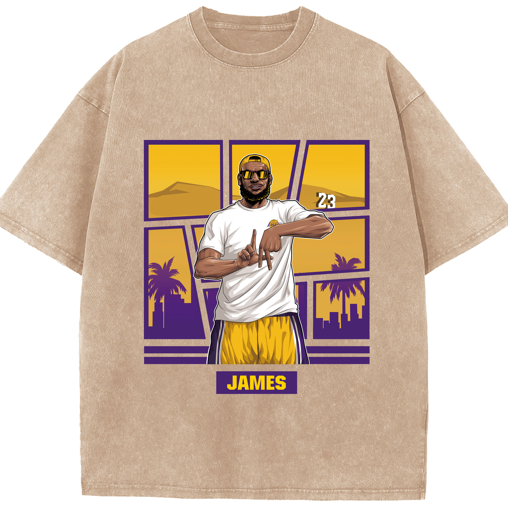 LeBron James 'LA' gesture c - Washed Vintage Look 230g Cotton Oversized T-Shirt With Front Heat Transfer Print – Soft, Lightweight, Stylish Fit – Comfortable Casual Wear For Sports & Everyday Use
