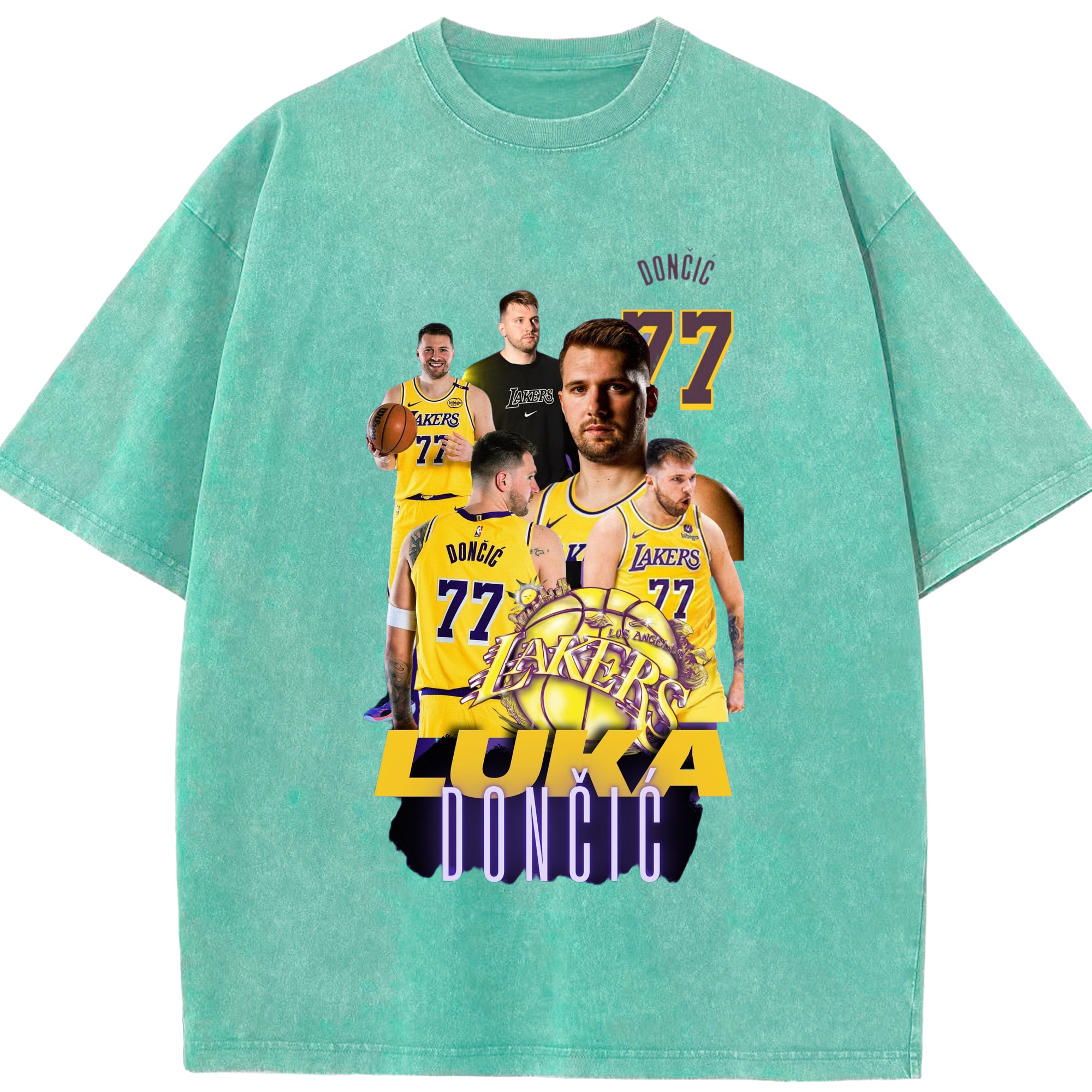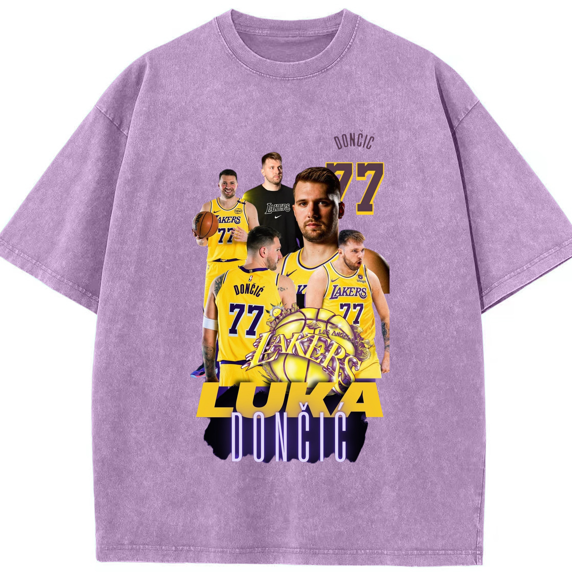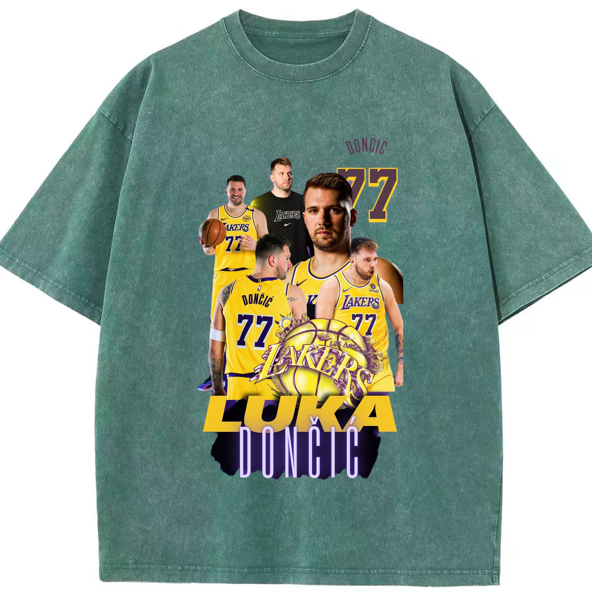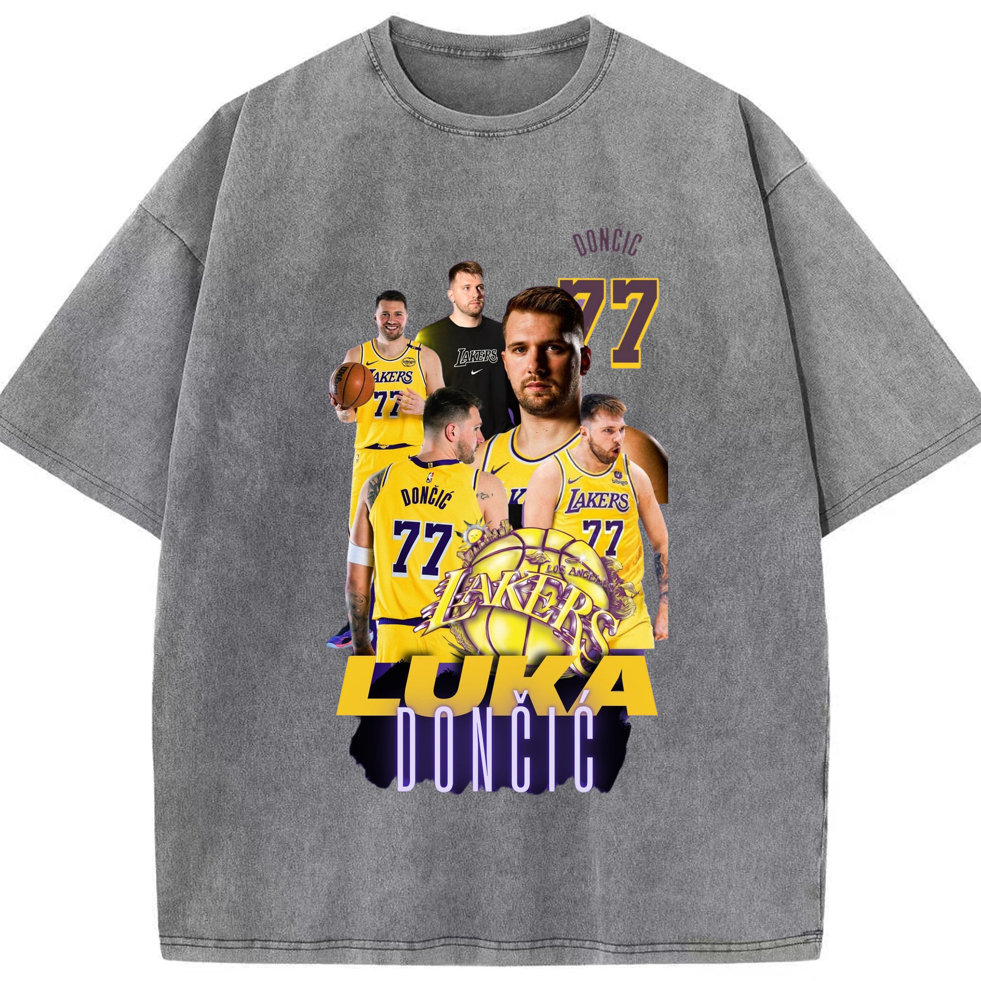 Luka Dončić Lakers #77 Collage graphic T‑Shirt - Washed Vintage Look 230g Cotton Oversized T-Shirt With Front Heat Transfer Print – Soft, Lightweight, Stylish Fit – Comfortable Casual Wear For Sports & Everyday Use