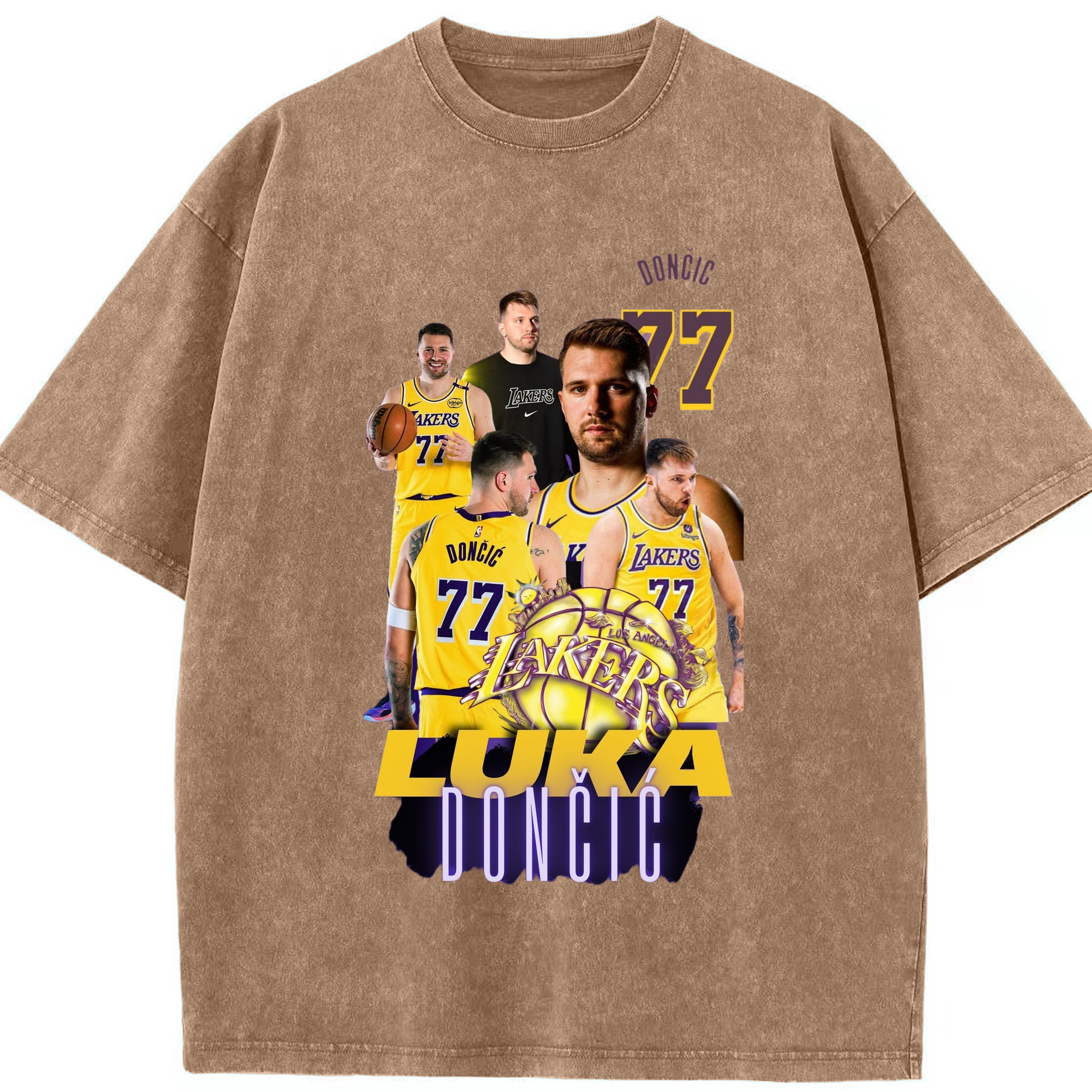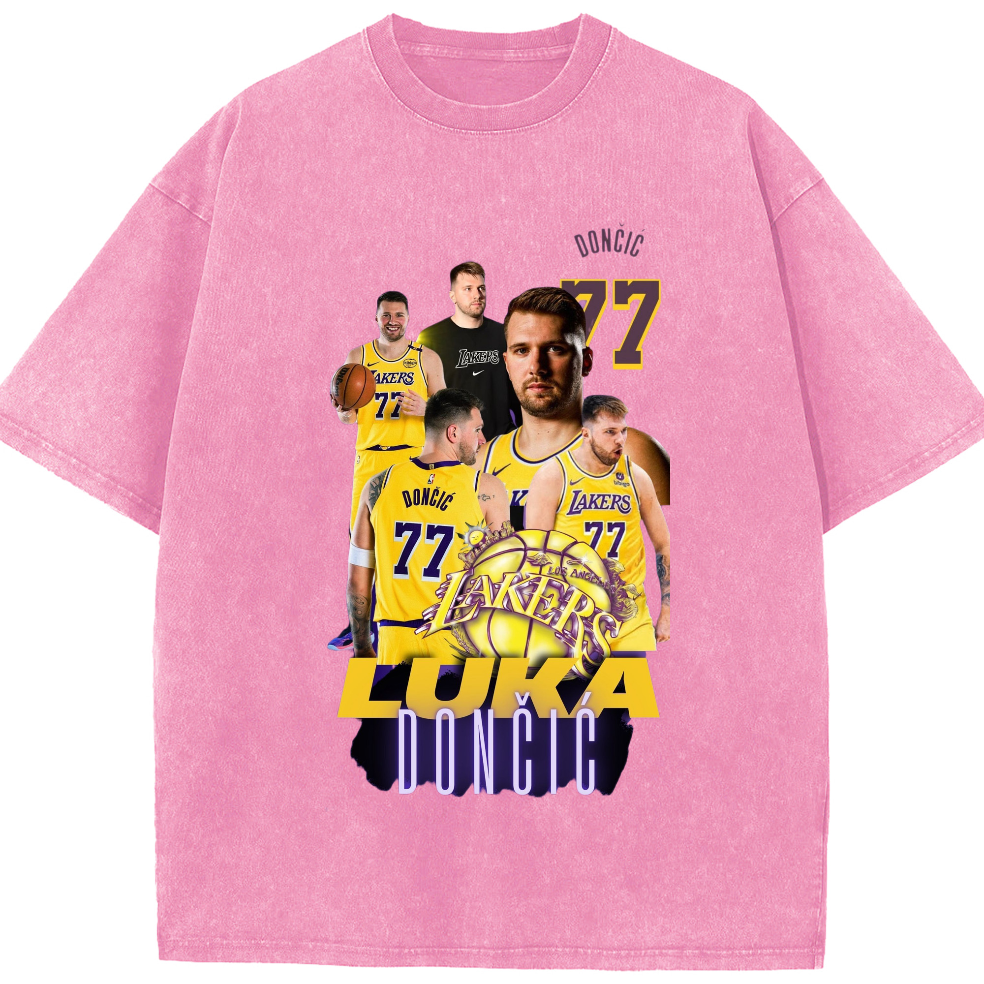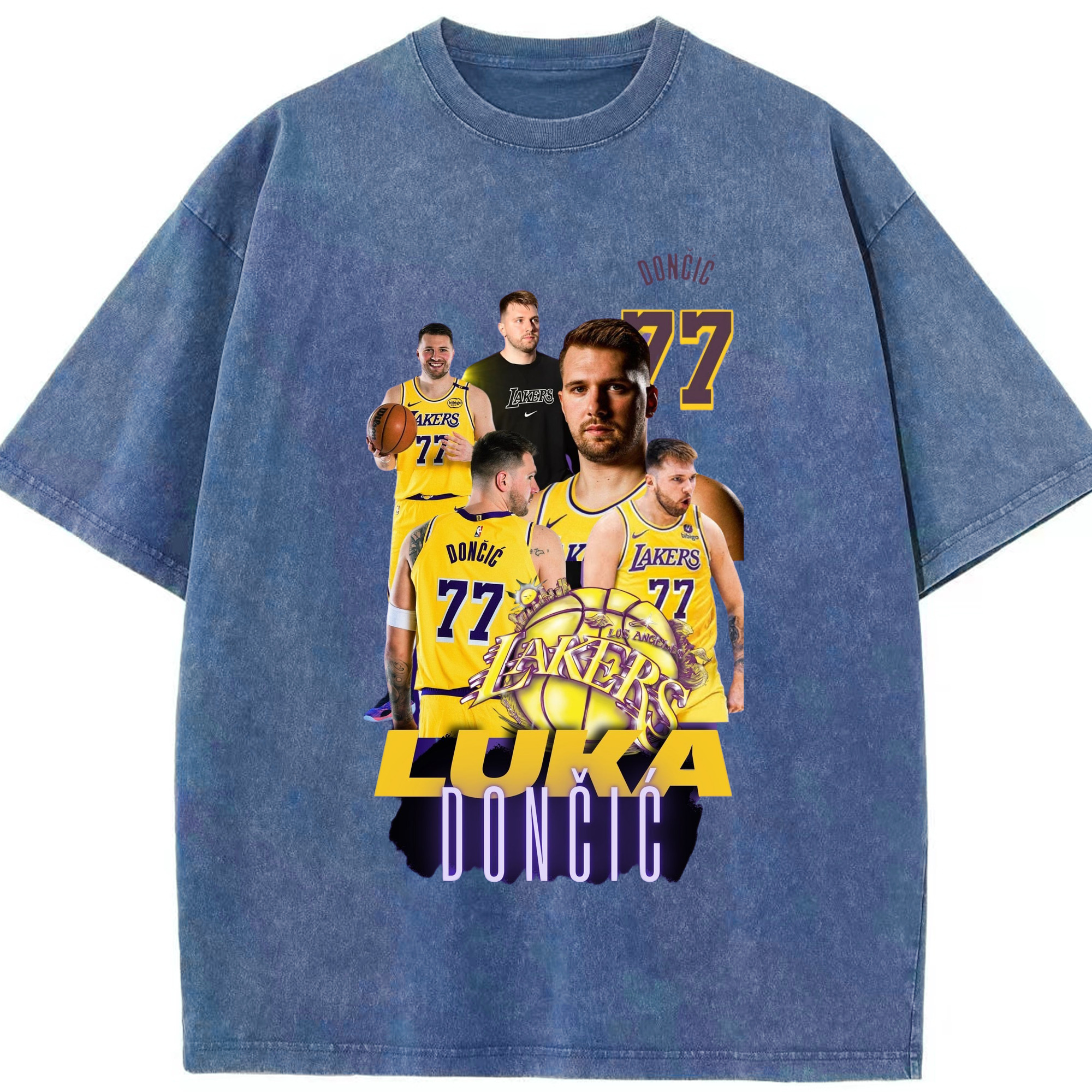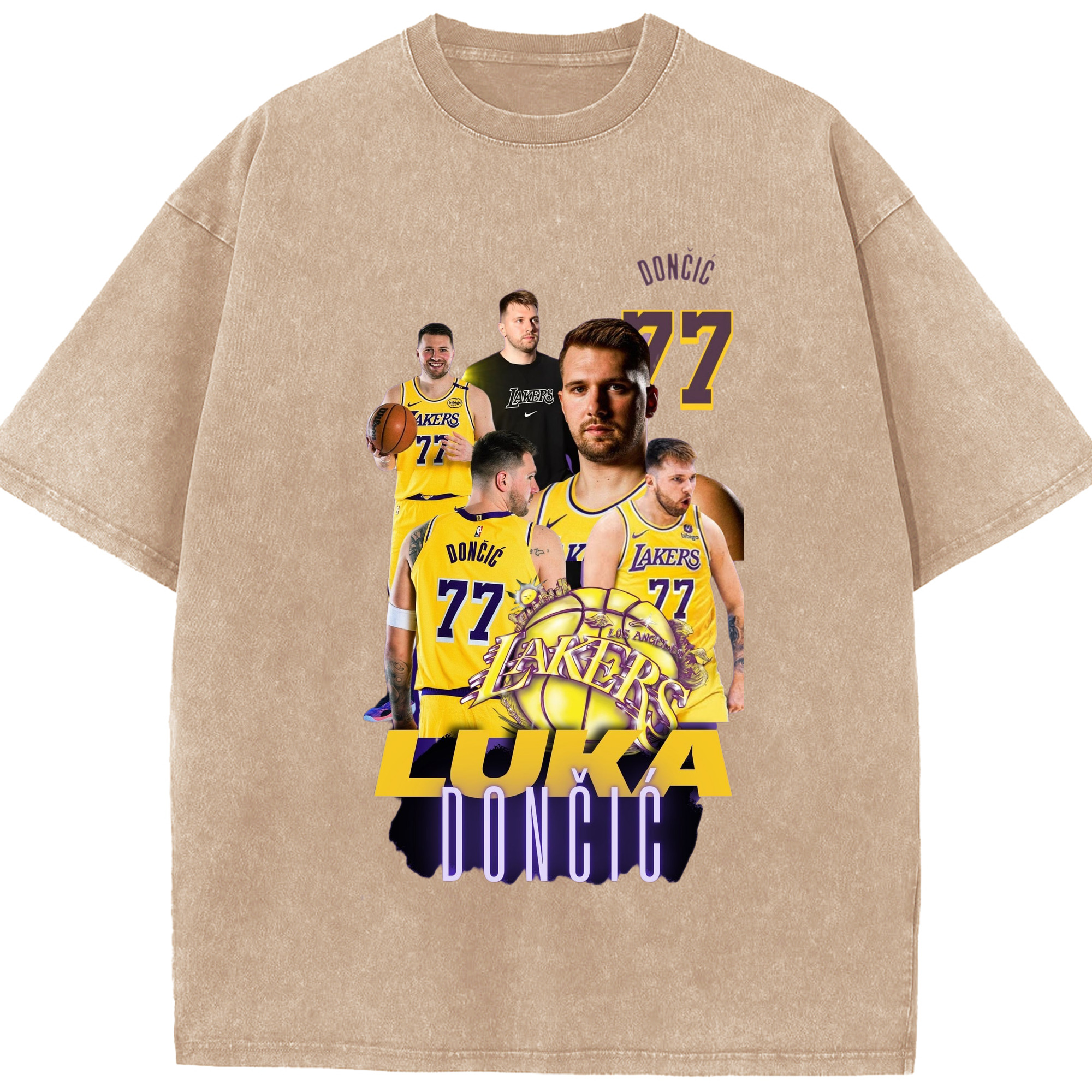 Luka Dončić Lakers #77 Collage graphic T‑Shirt - Washed Vintage Look 230g Cotton Oversized T-Shirt With Front Heat Transfer Print – Soft, Lightweight, Stylish Fit – Comfortable Casual Wear For Sports & Everyday Use