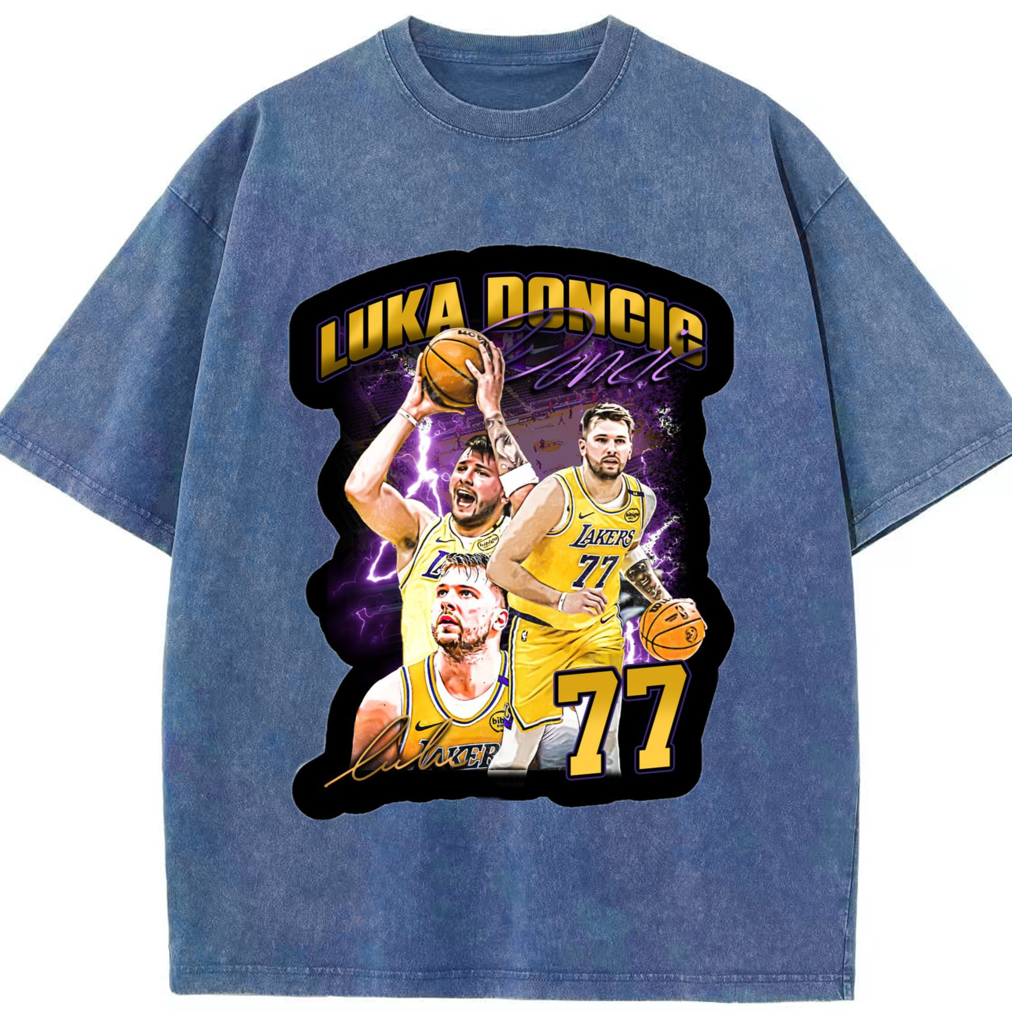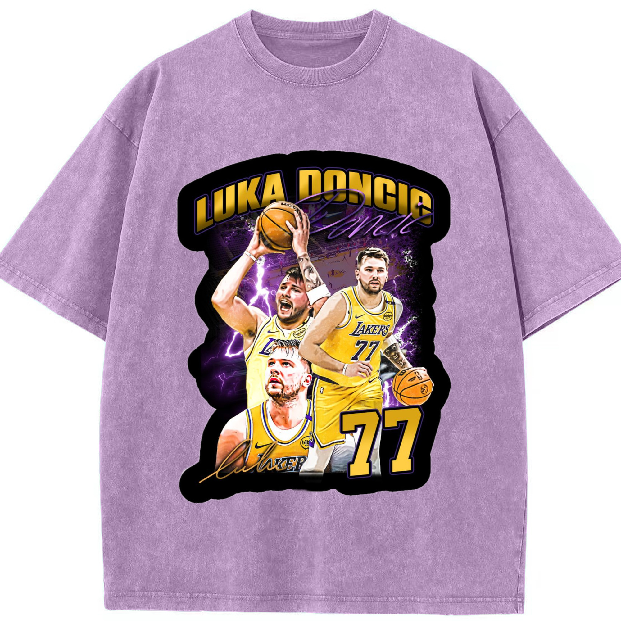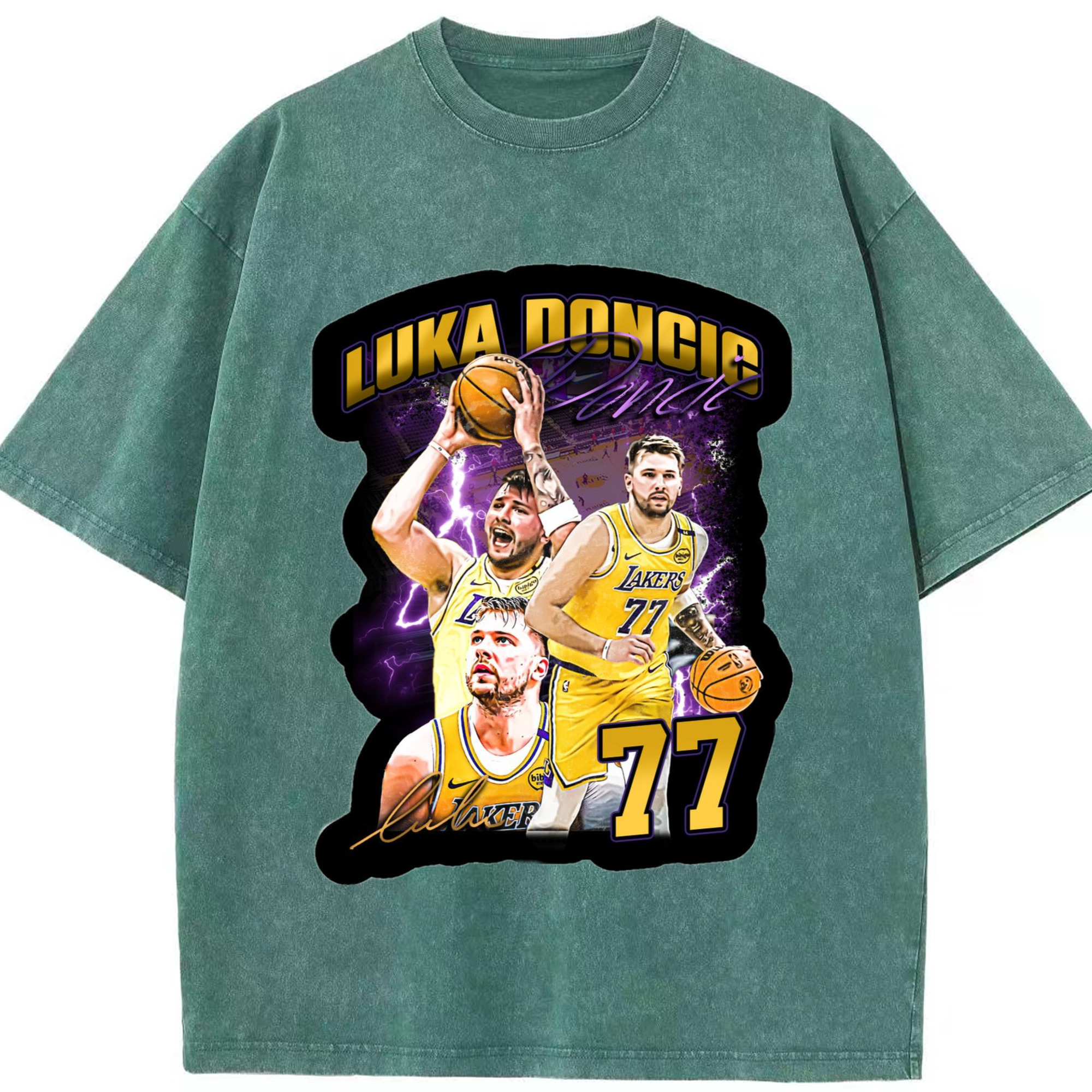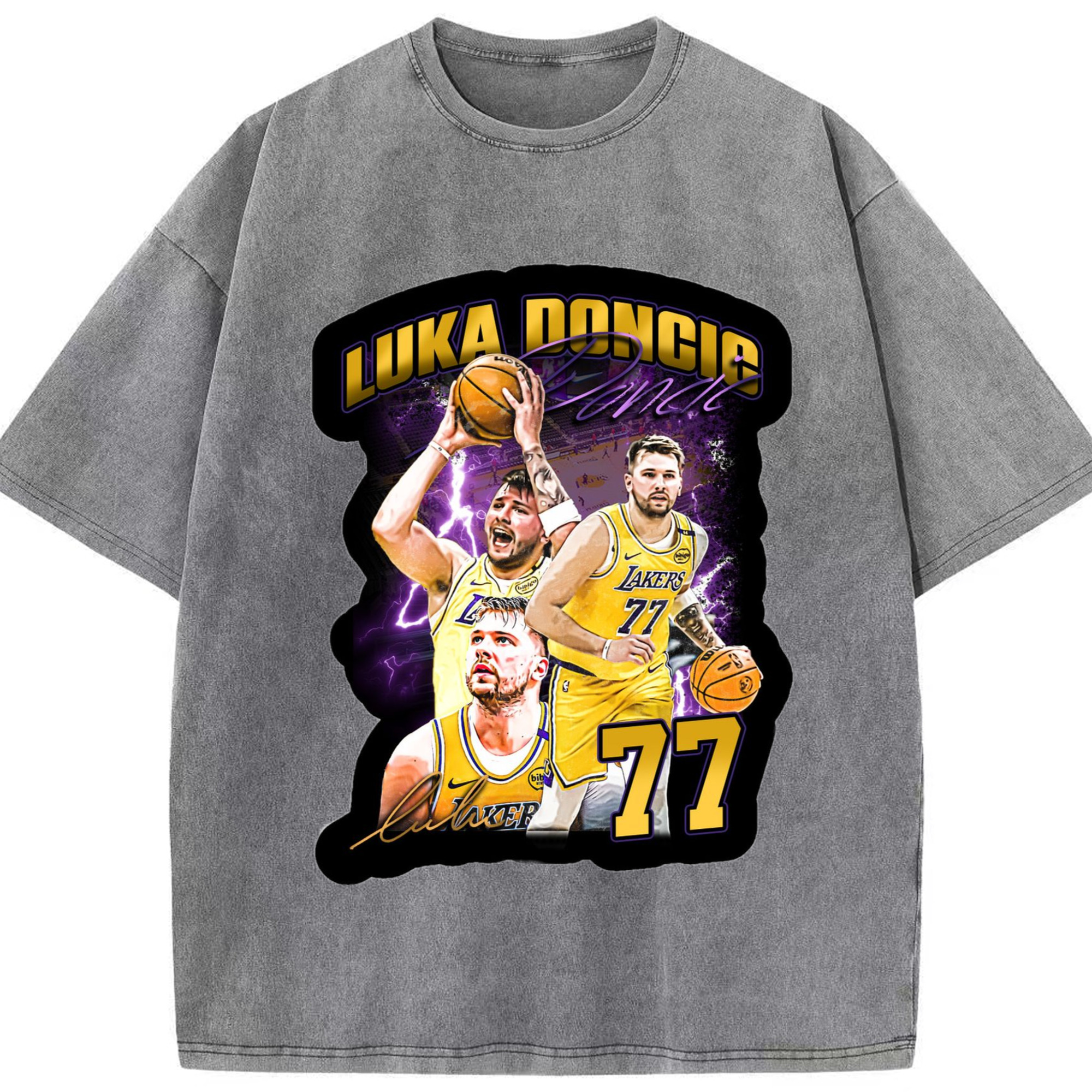 Luka Dončić Lakers #77 Collage icon T‑Shirt - Washed Vintage Look 230g Cotton Oversized T-Shirt With Front Heat Transfer Print – Soft, Lightweight, Stylish Fit – Comfortable Casual Wear For Sports & Everyday Use