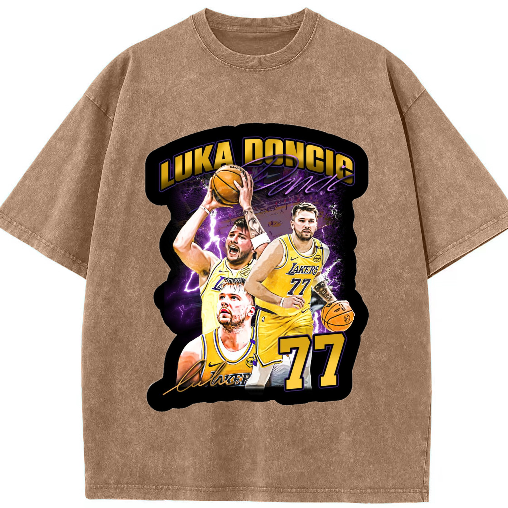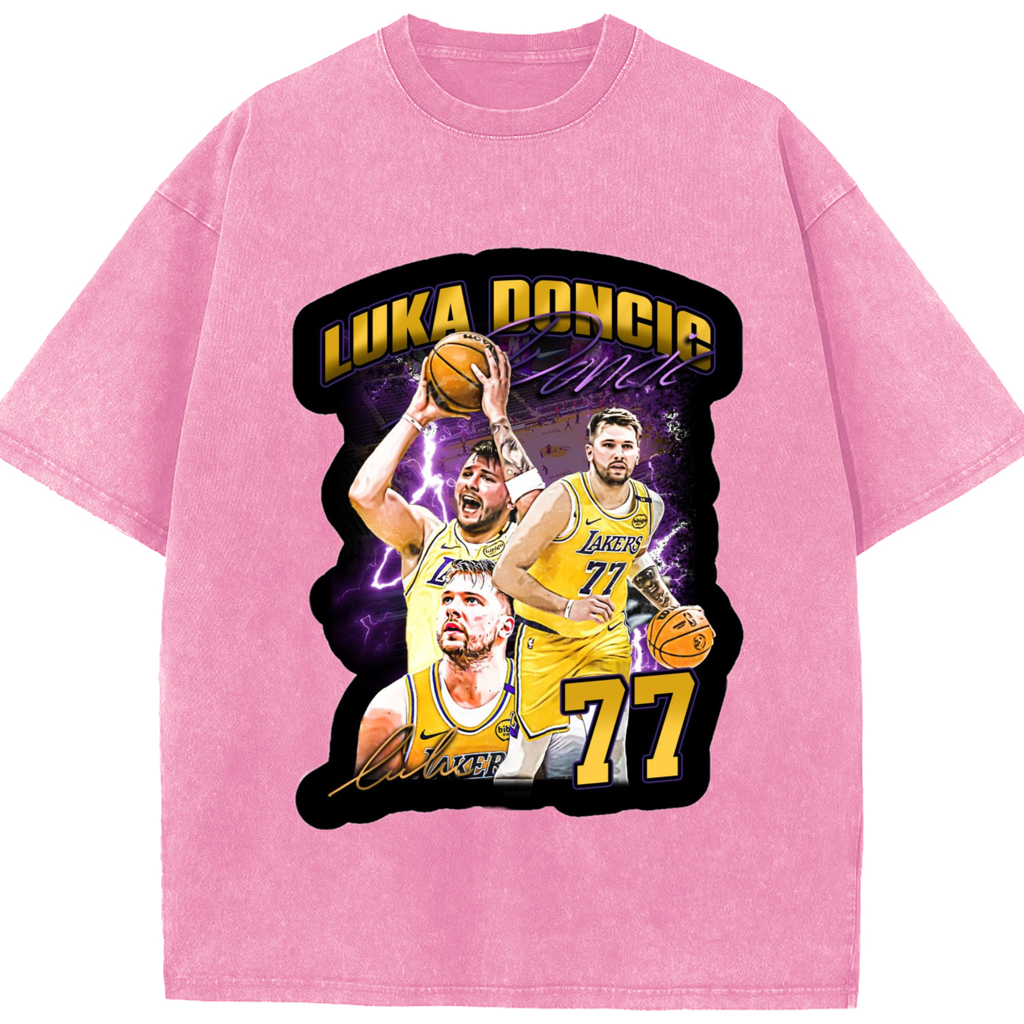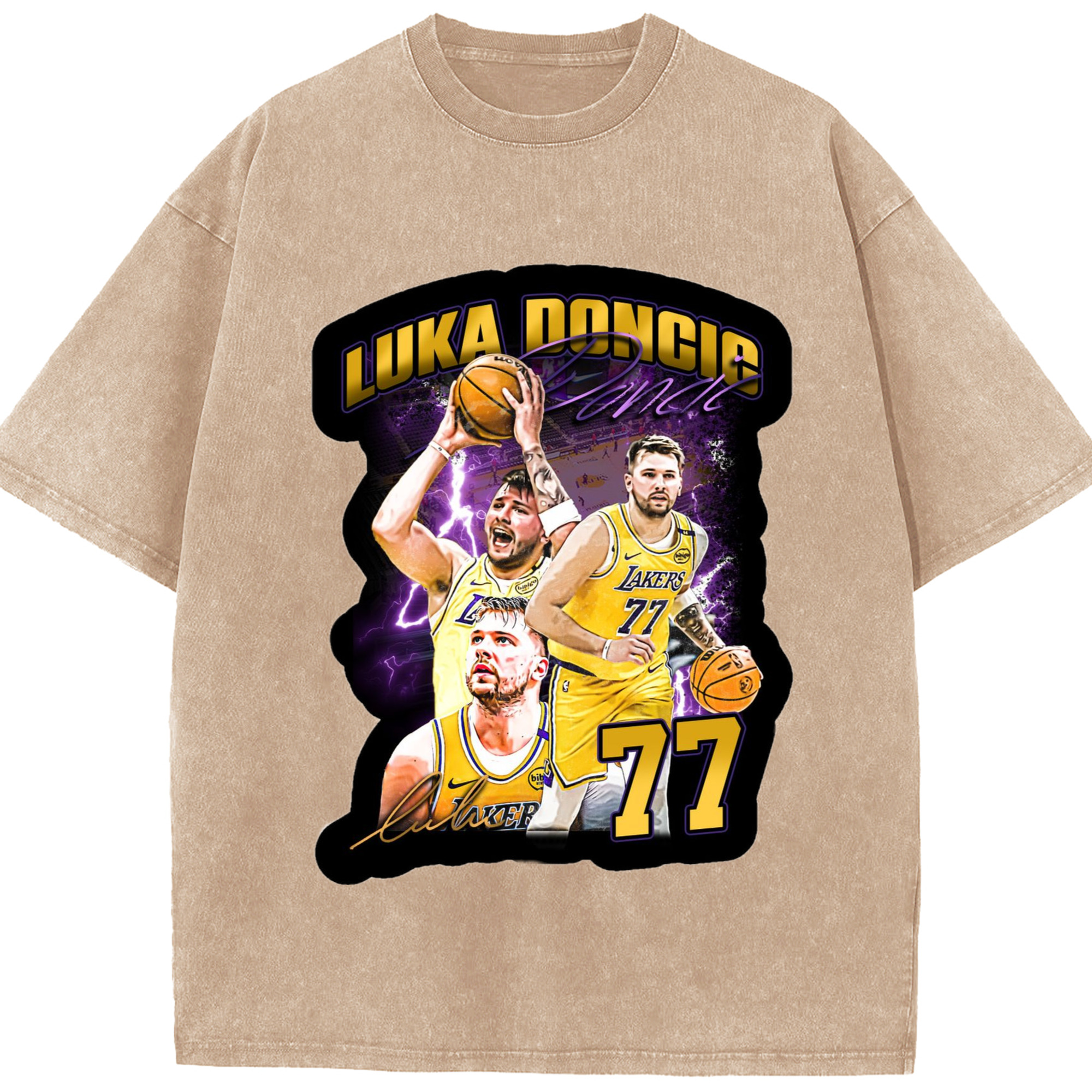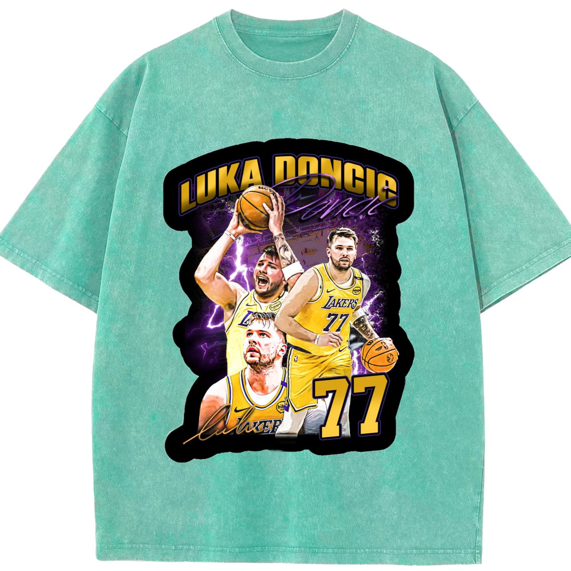 Luka Dončić Lakers #77 Collage icon T‑Shirt - Washed Vintage Look 230g Cotton Oversized T-Shirt With Front Heat Transfer Print – Soft, Lightweight, Stylish Fit – Comfortable Casual Wear For Sports & Everyday Use