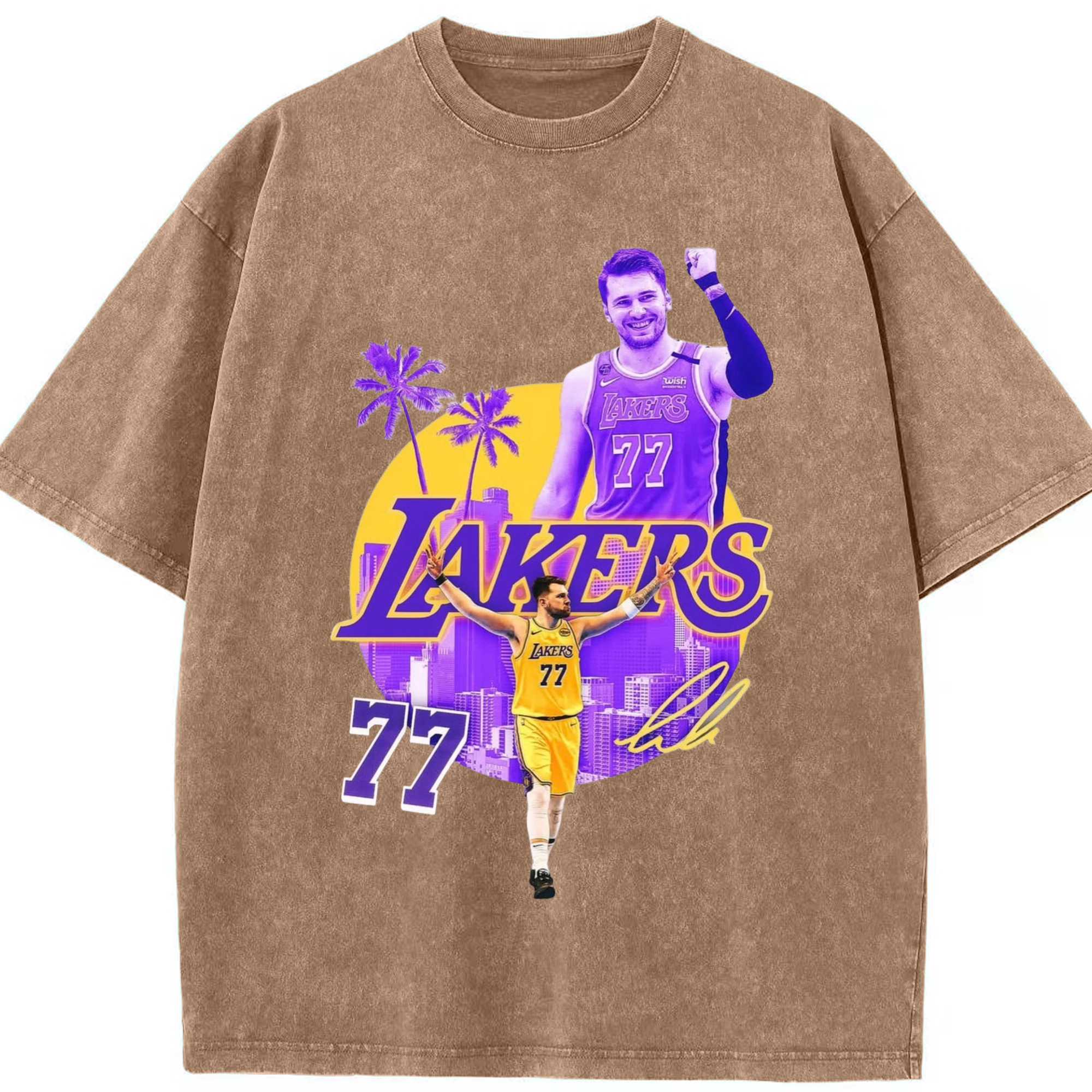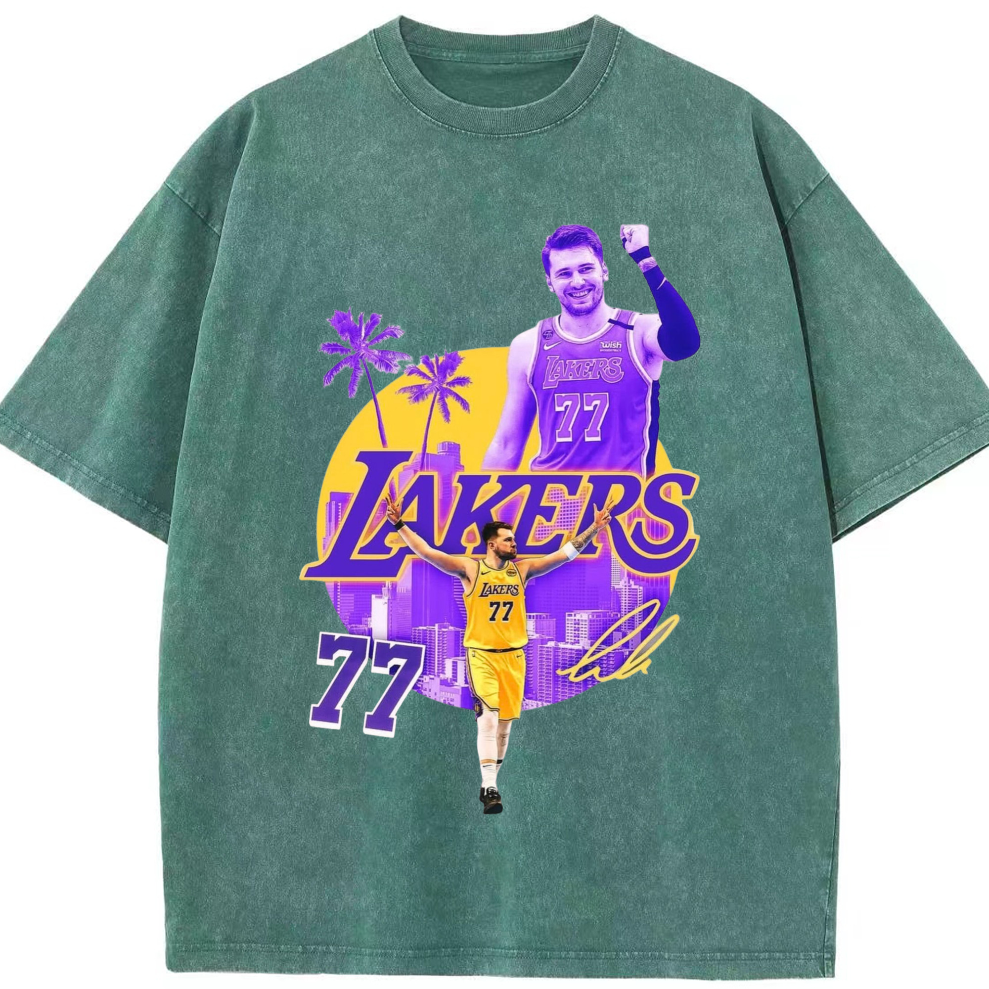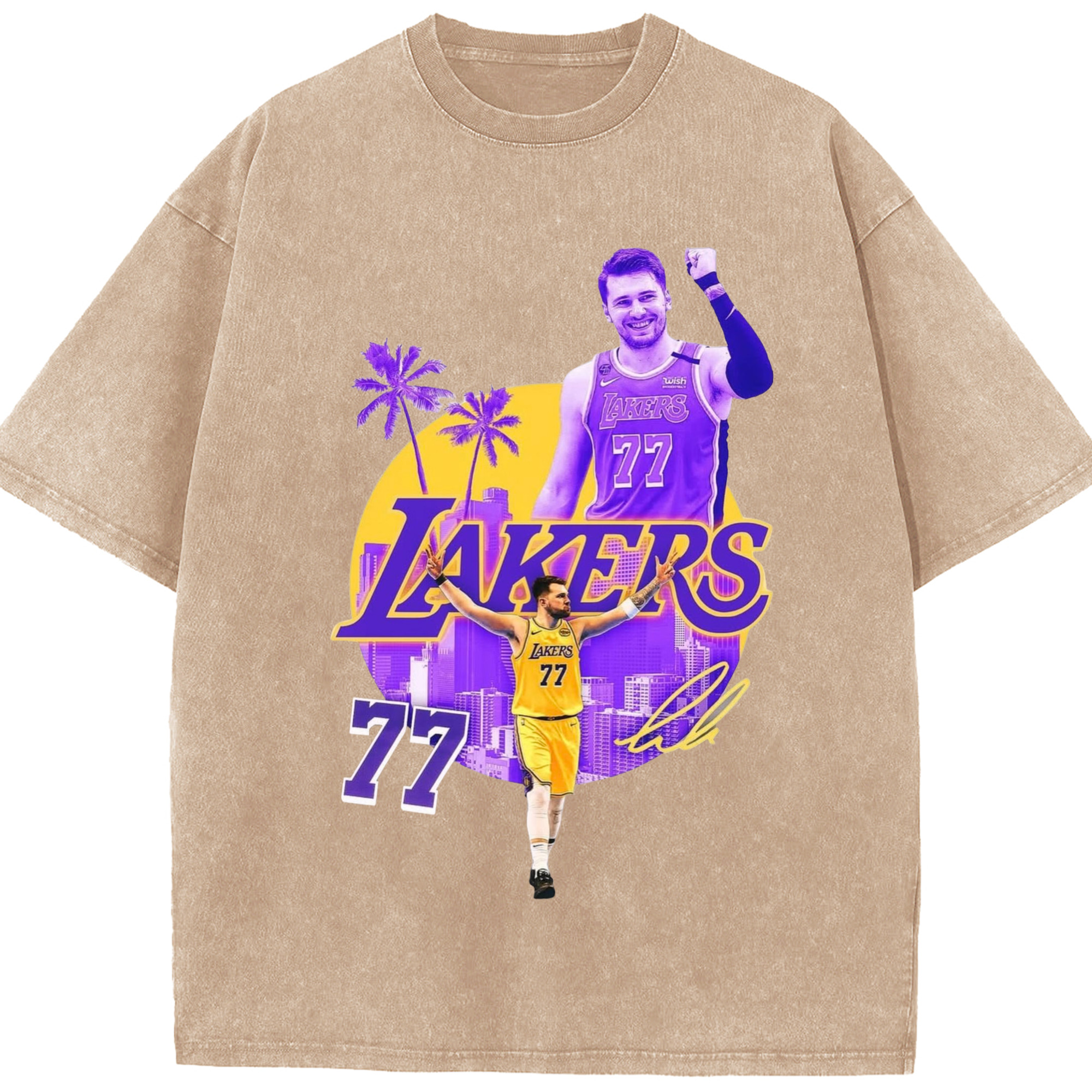 Luka Dončić Lakers #77 icon Tee - Washed Vintage Look 230g Cotton Oversized T-Shirt With Front Heat Transfer Print – Soft, Lightweight, Stylish Fit – Comfortable Casual Wear For Sports & Everyday Use