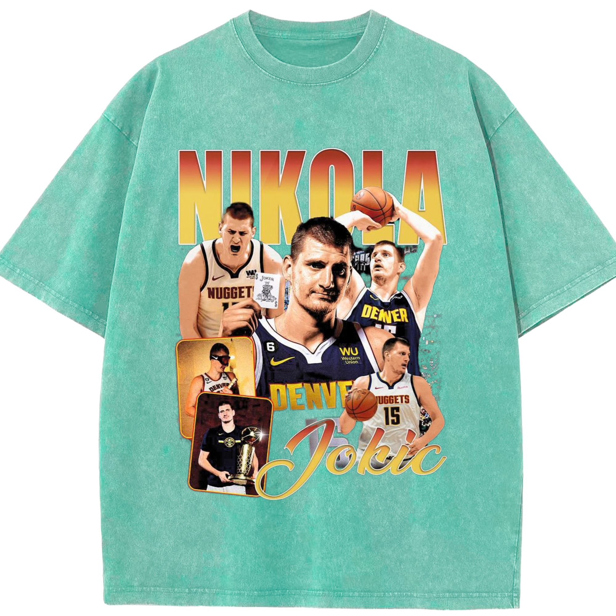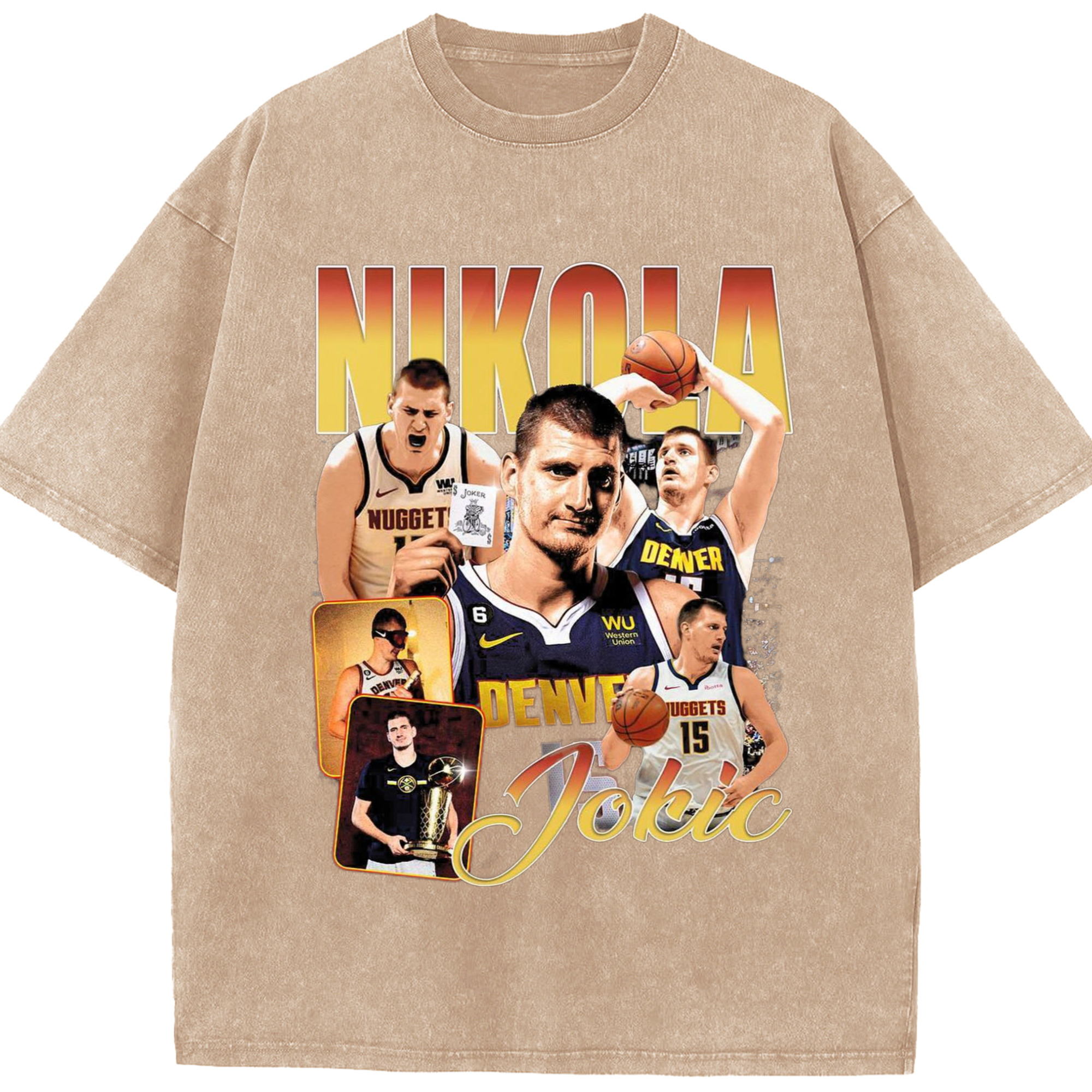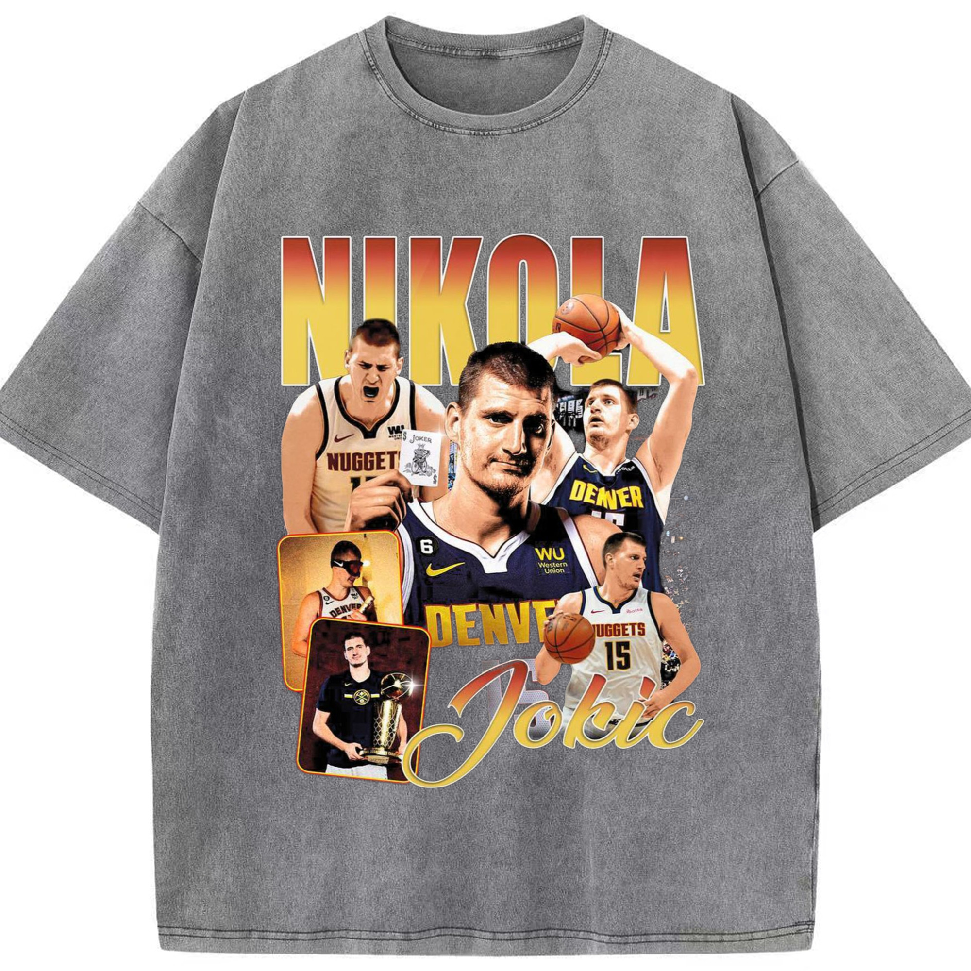 Nuggets Nikola Jokic #15 collage T-shirt - Washed Vintage Look 230g Cotton Oversized T-Shirt With Front Heat Transfer Print – Soft, Lightweight, Stylish Fit – Comfortable Casual Wear For Sports & Everyday Use