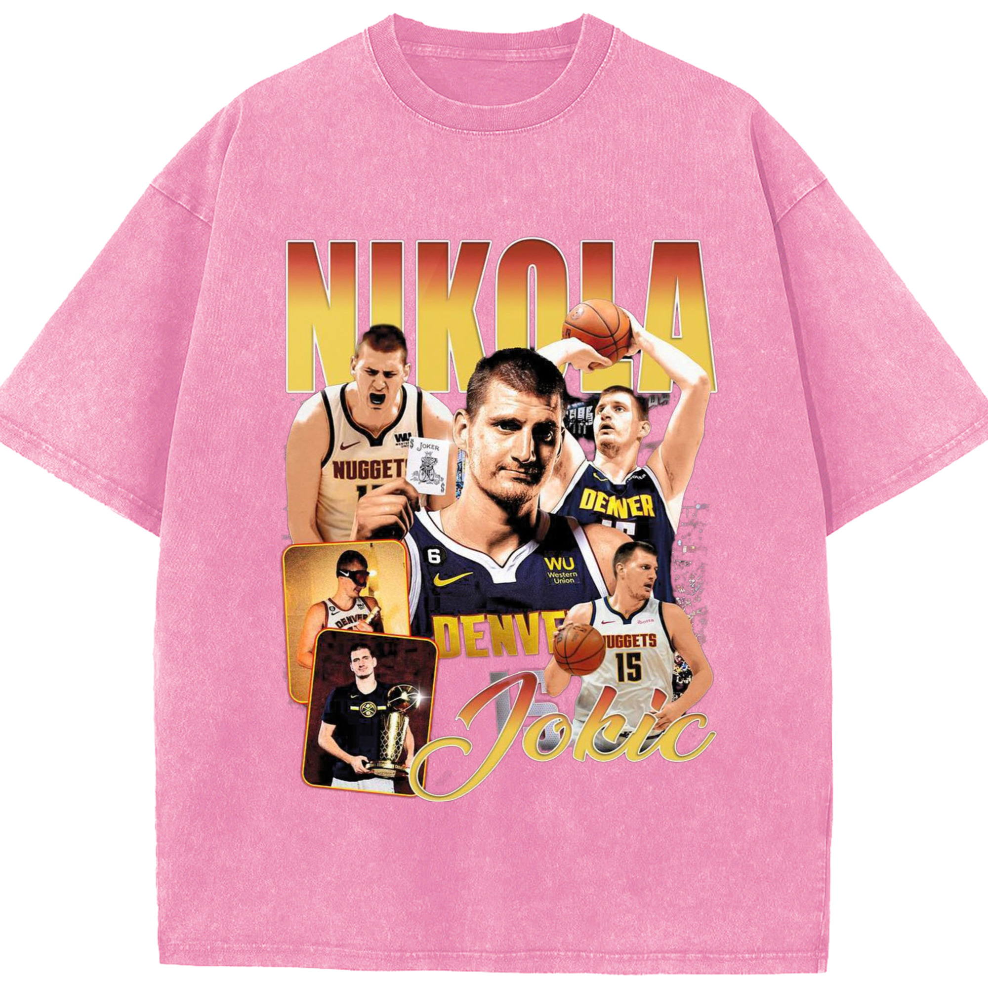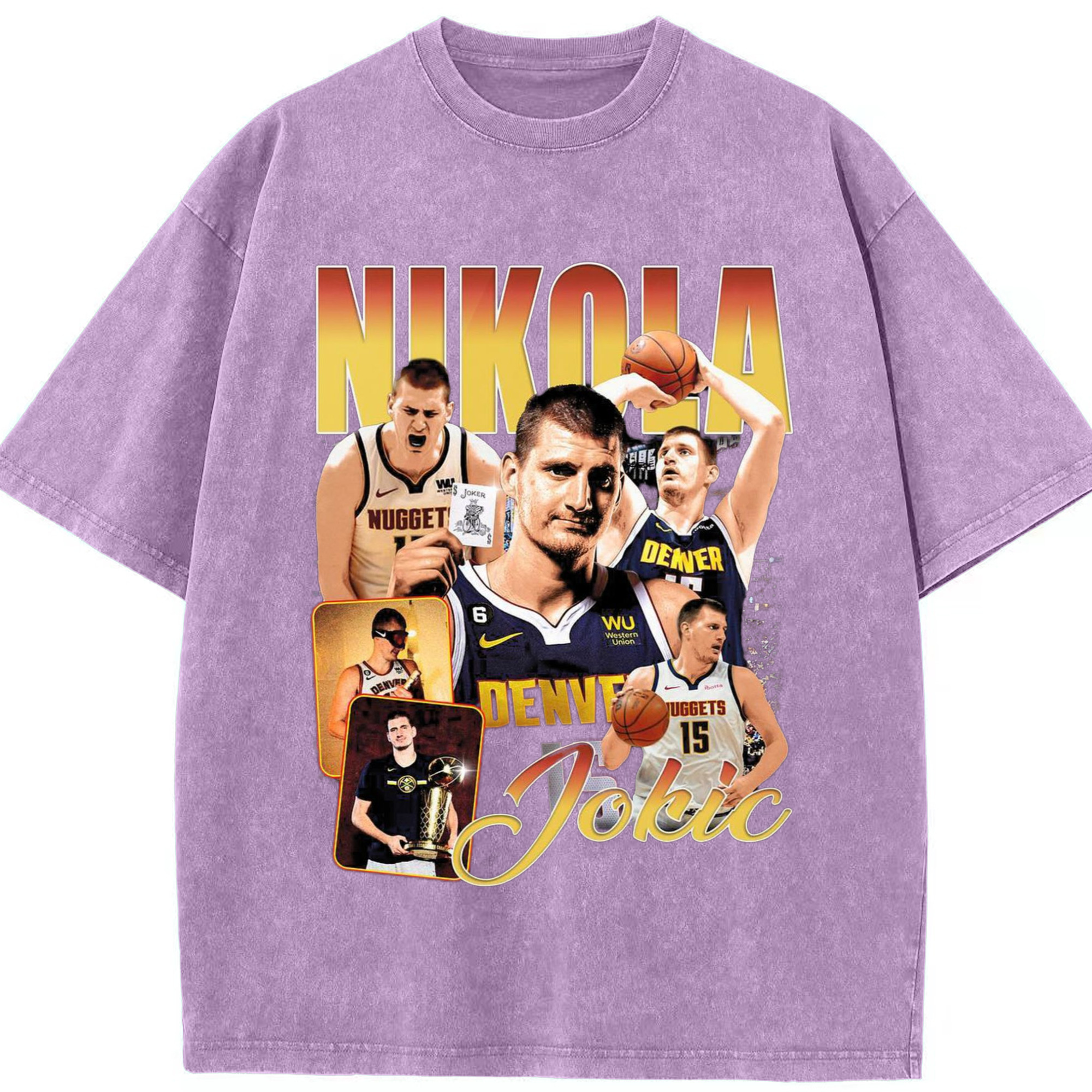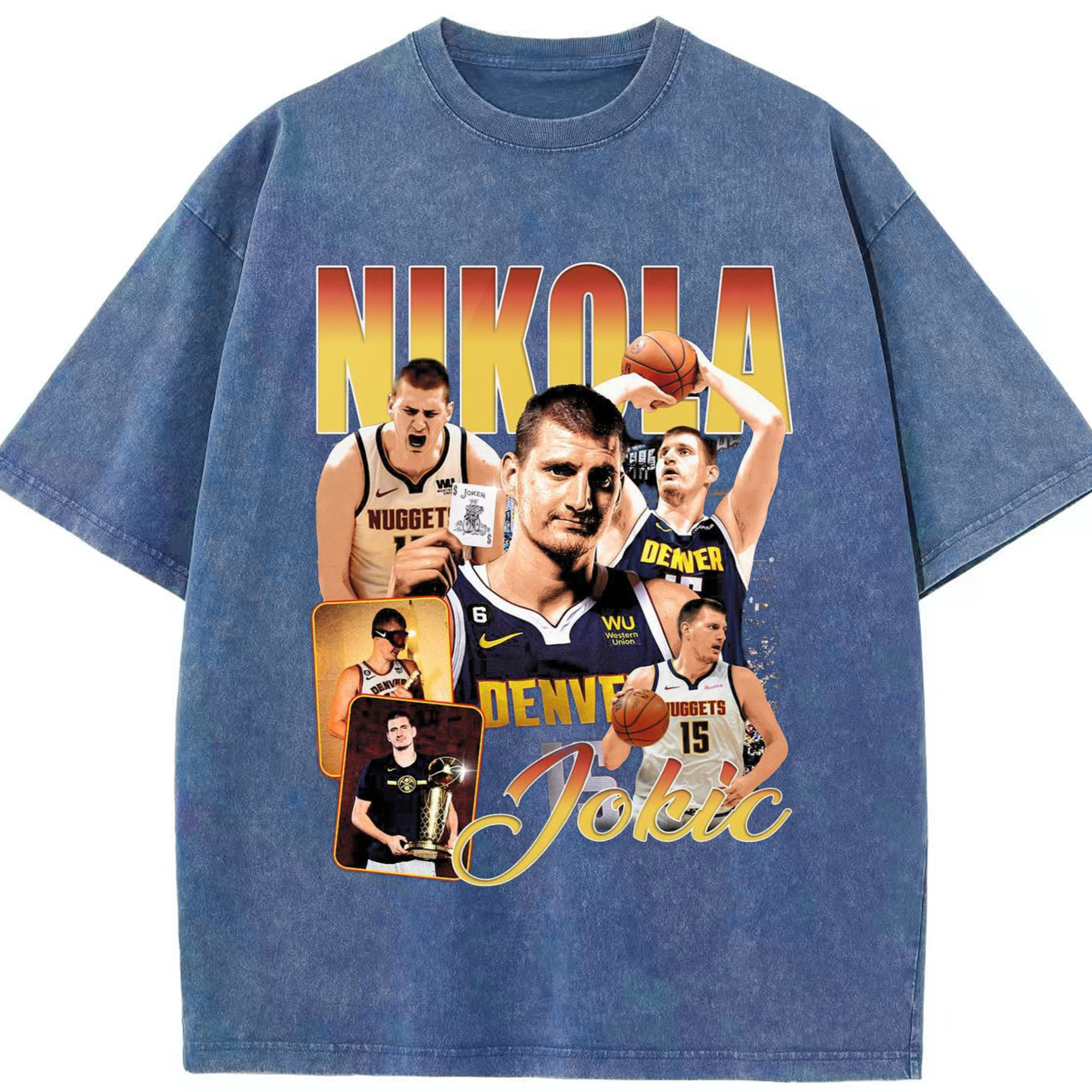 Nuggets Nikola Jokic #15 collage T-shirt - Washed Vintage Look 230g Cotton Oversized T-Shirt With Front Heat Transfer Print – Soft, Lightweight, Stylish Fit – Comfortable Casual Wear For Sports & Everyday Use