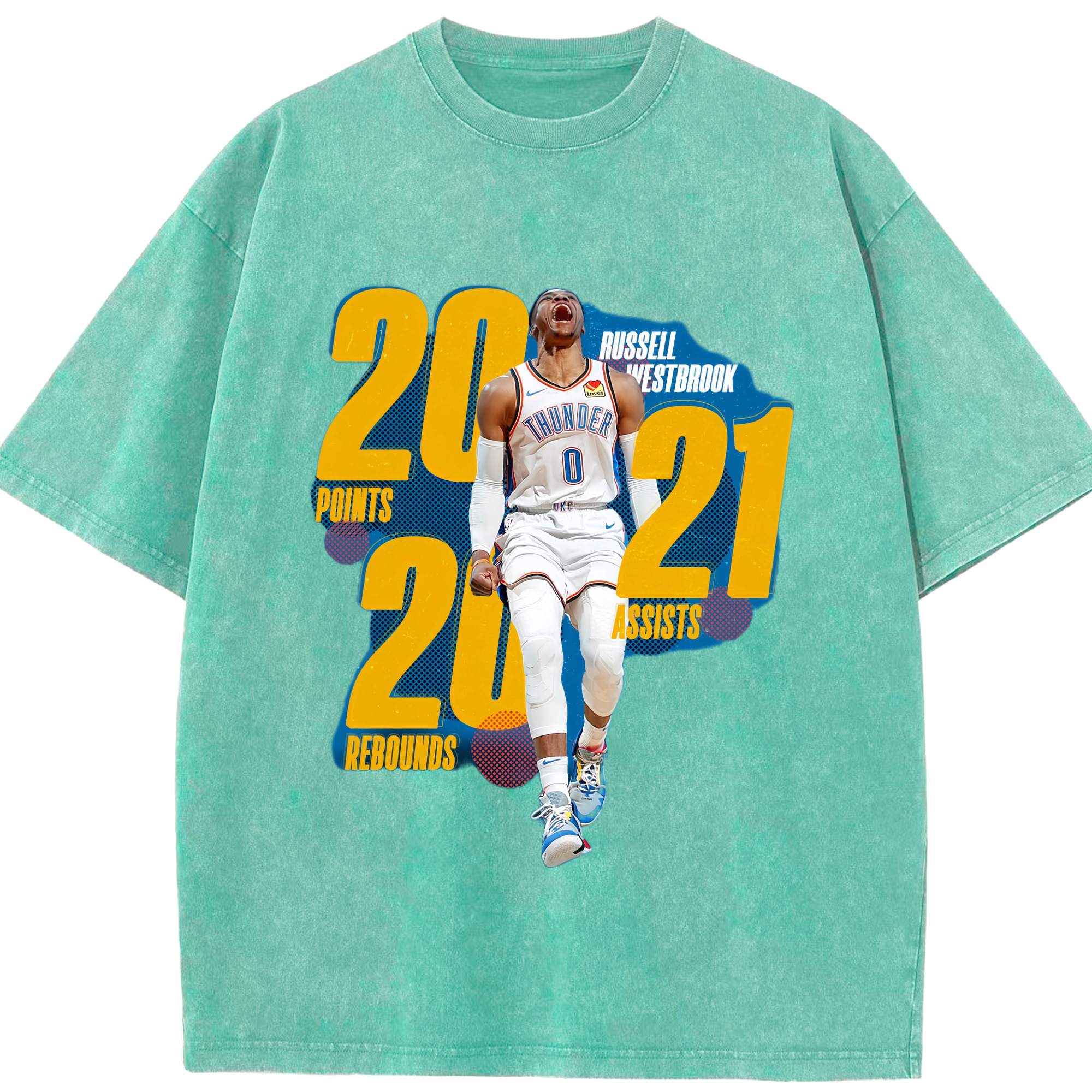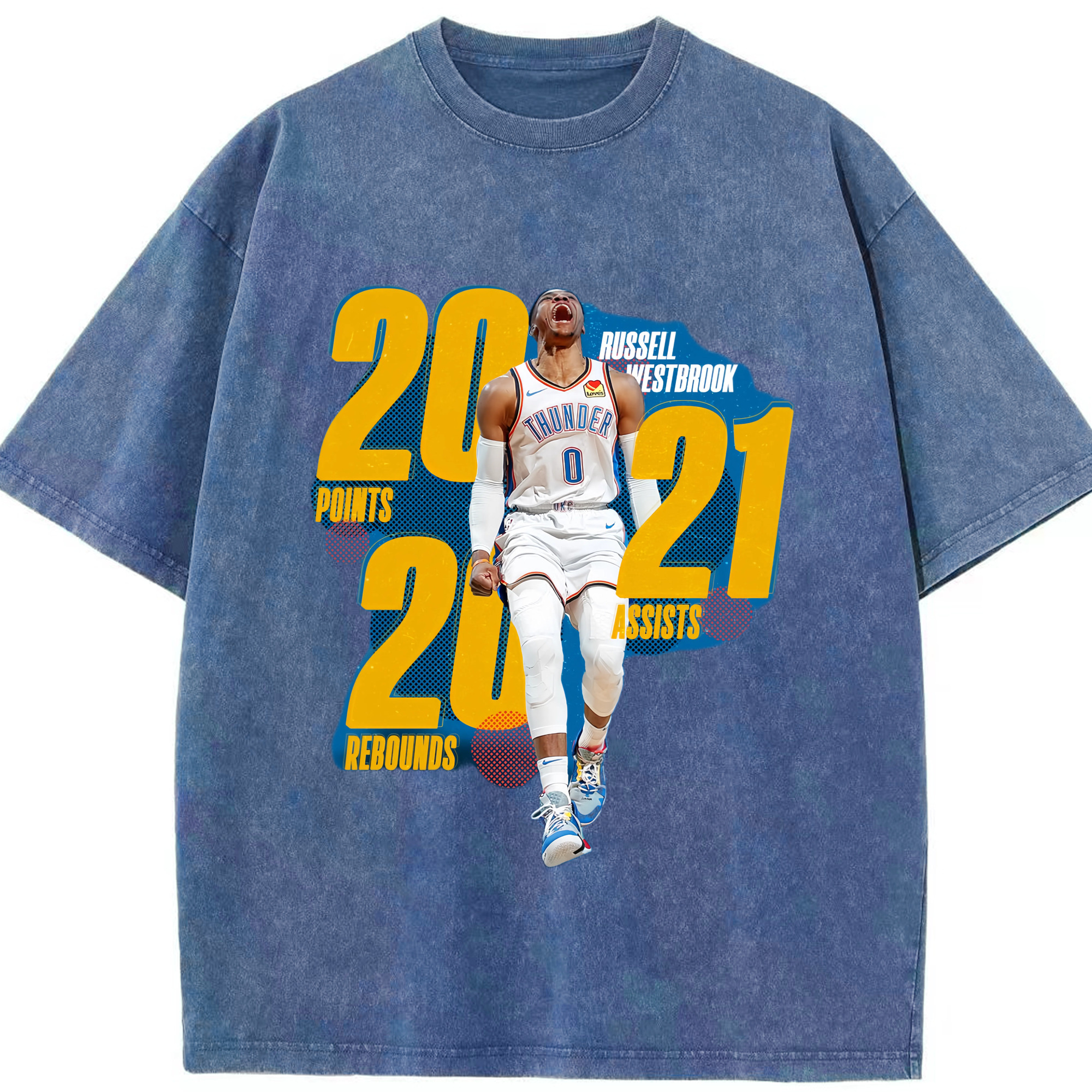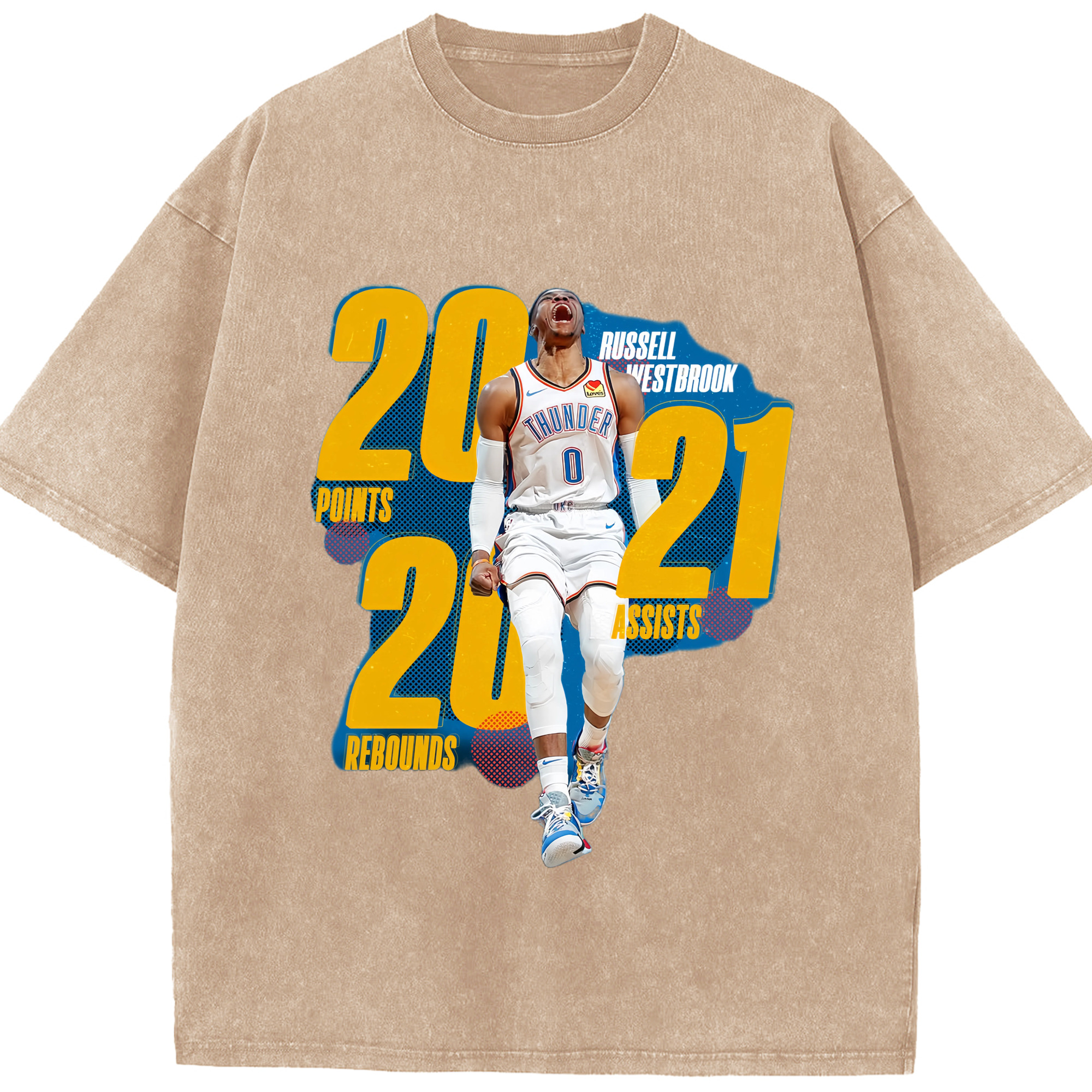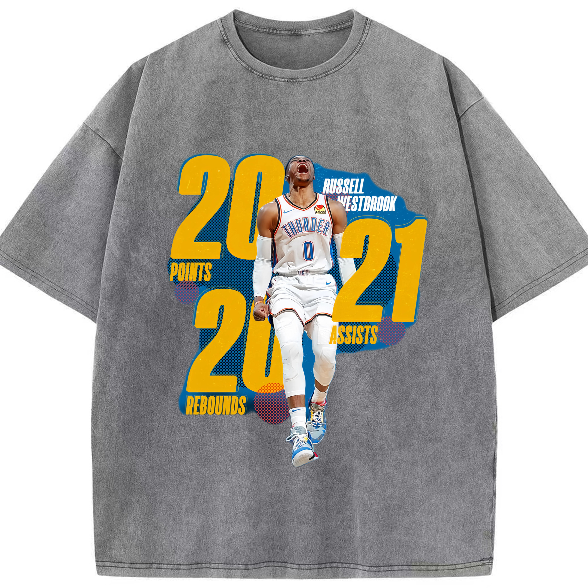 Russell westbrook okc Triple-double t- shirt - Washed Vintage Look 230g Cotton Oversized T-Shirt With Front Heat Transfer Print – Soft, Lightweight, Stylish Fit – Comfortable Casual Wear For Sports & Everyday Use
