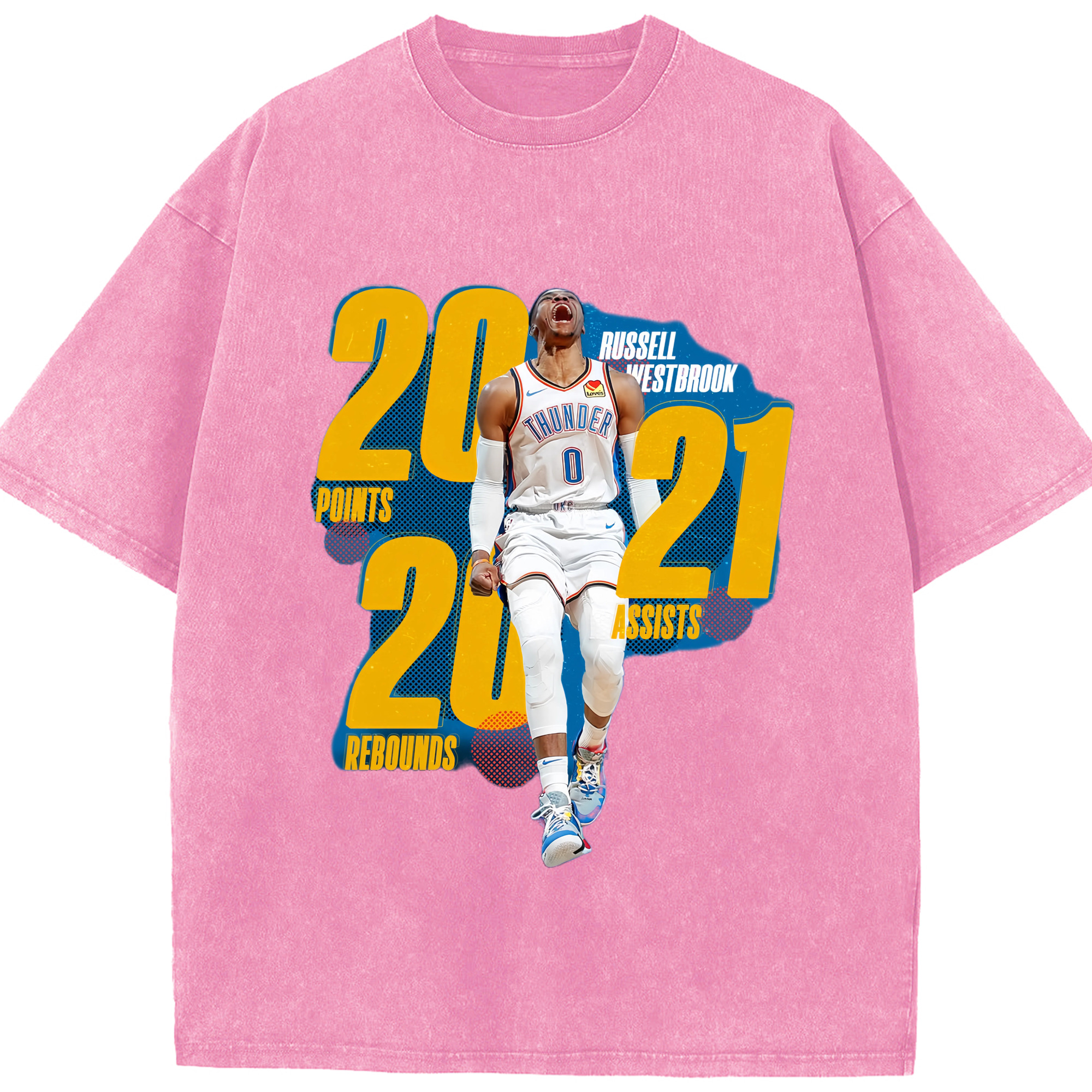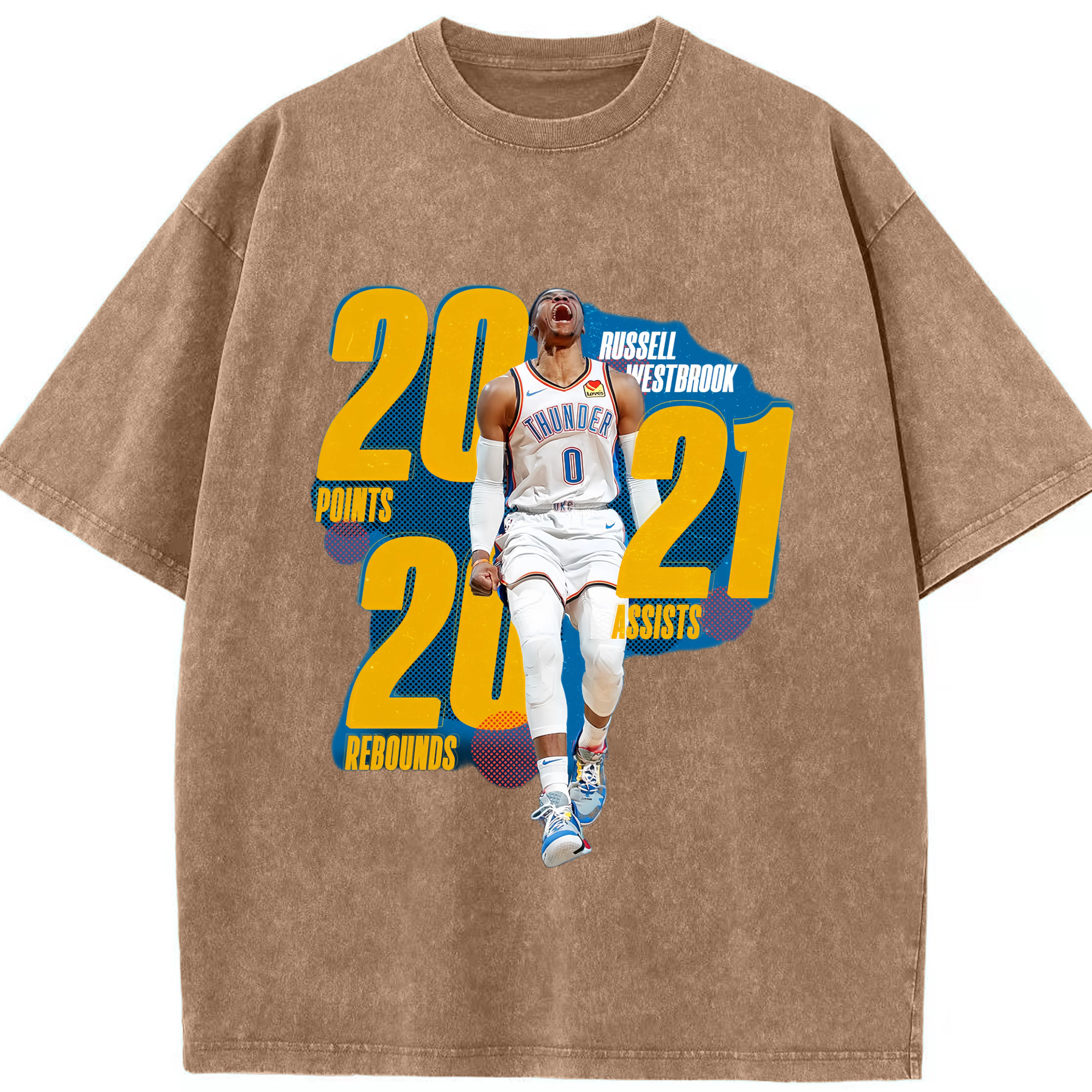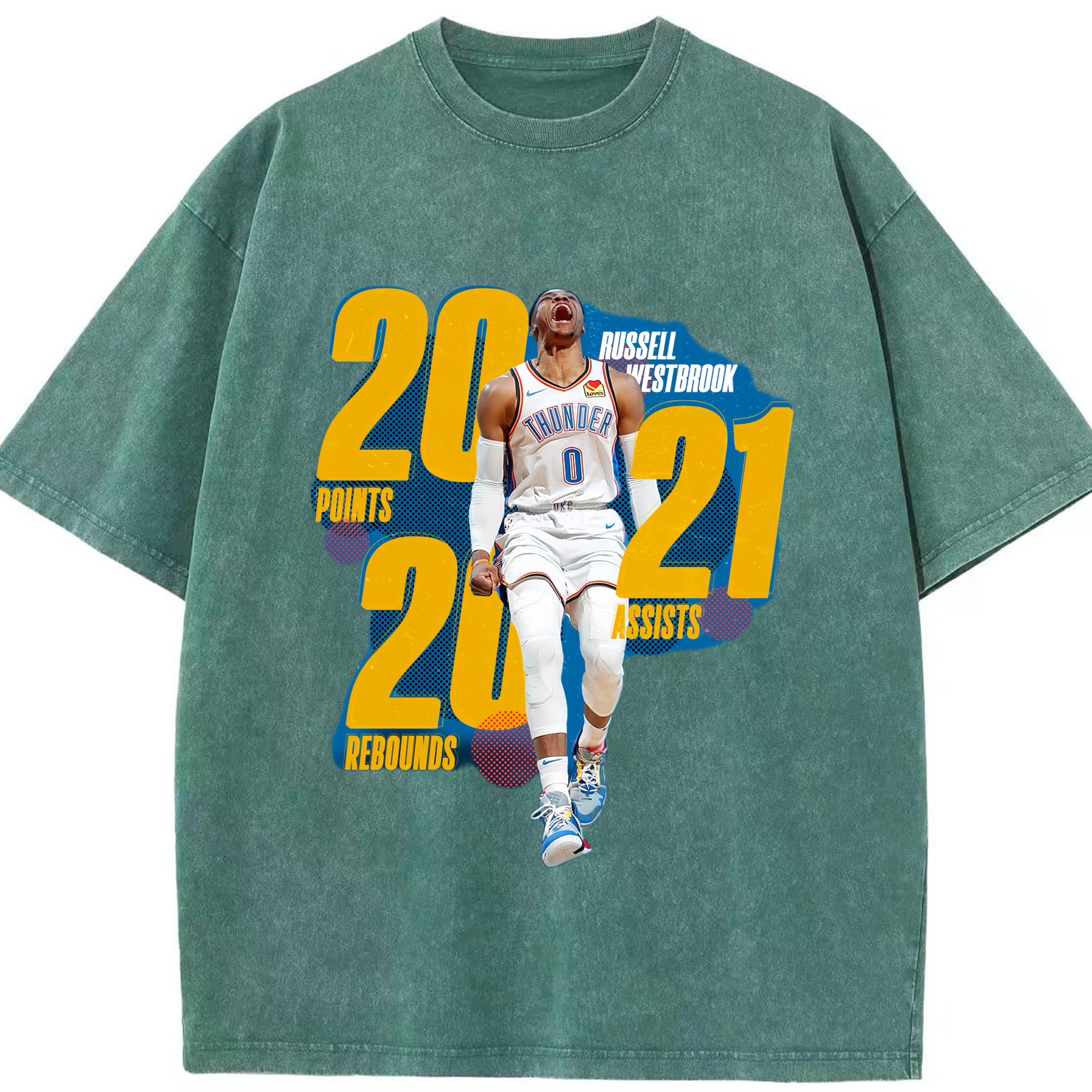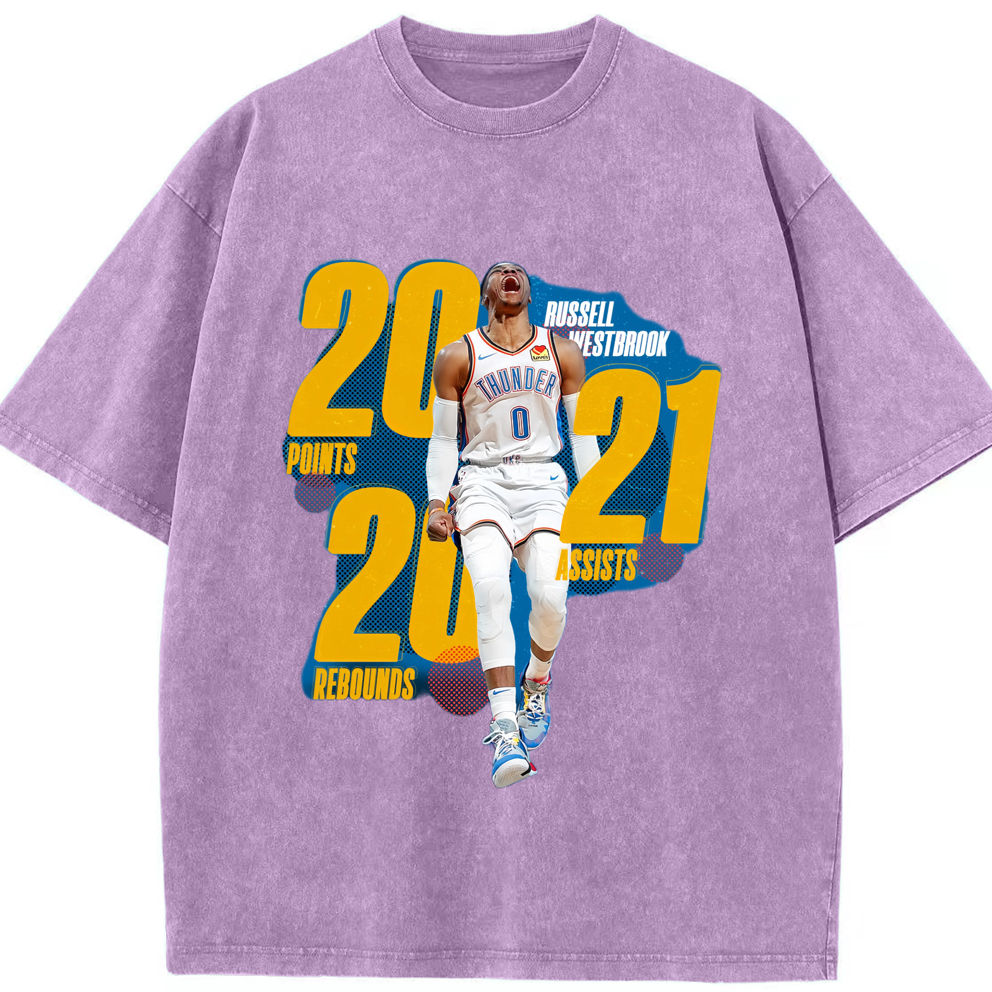 Russell westbrook okc Triple-double t- shirt - Washed Vintage Look 230g Cotton Oversized T-Shirt With Front Heat Transfer Print – Soft, Lightweight, Stylish Fit – Comfortable Casual Wear For Sports & Everyday Use