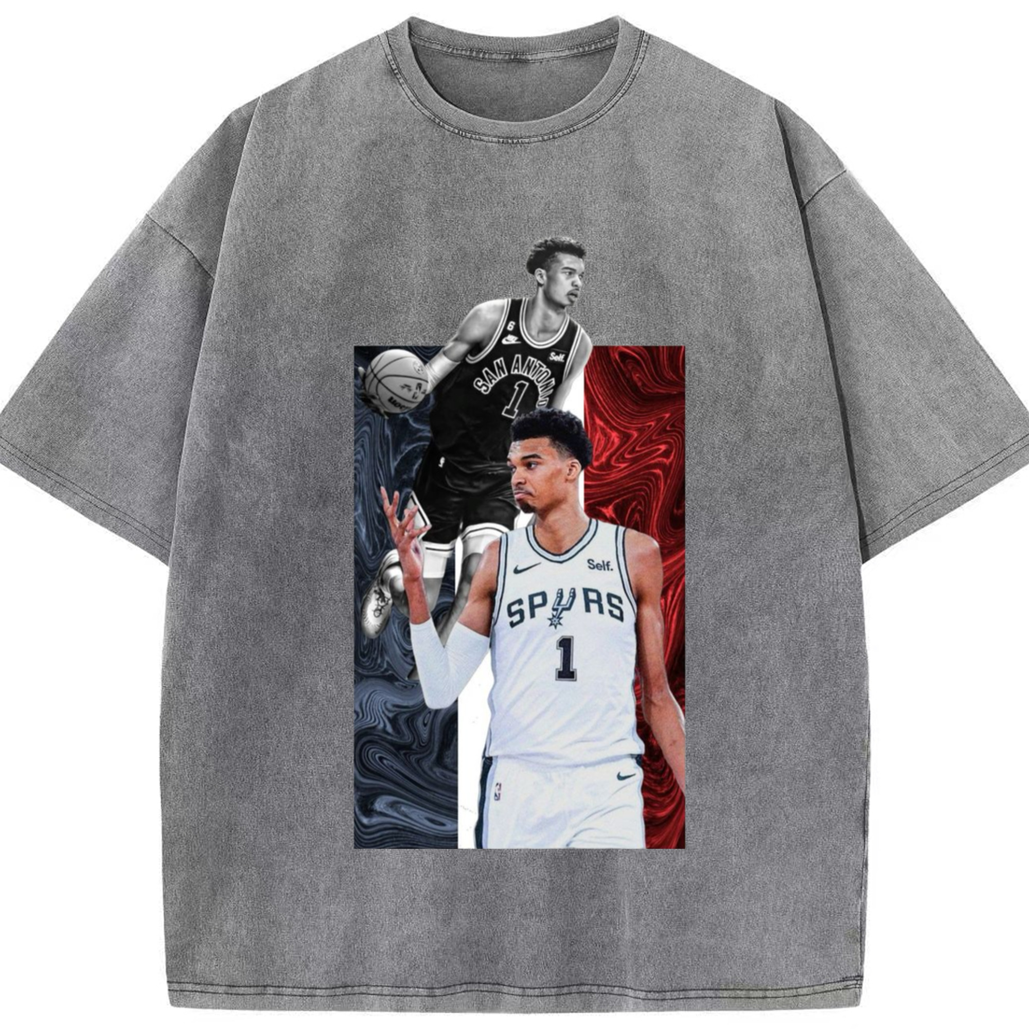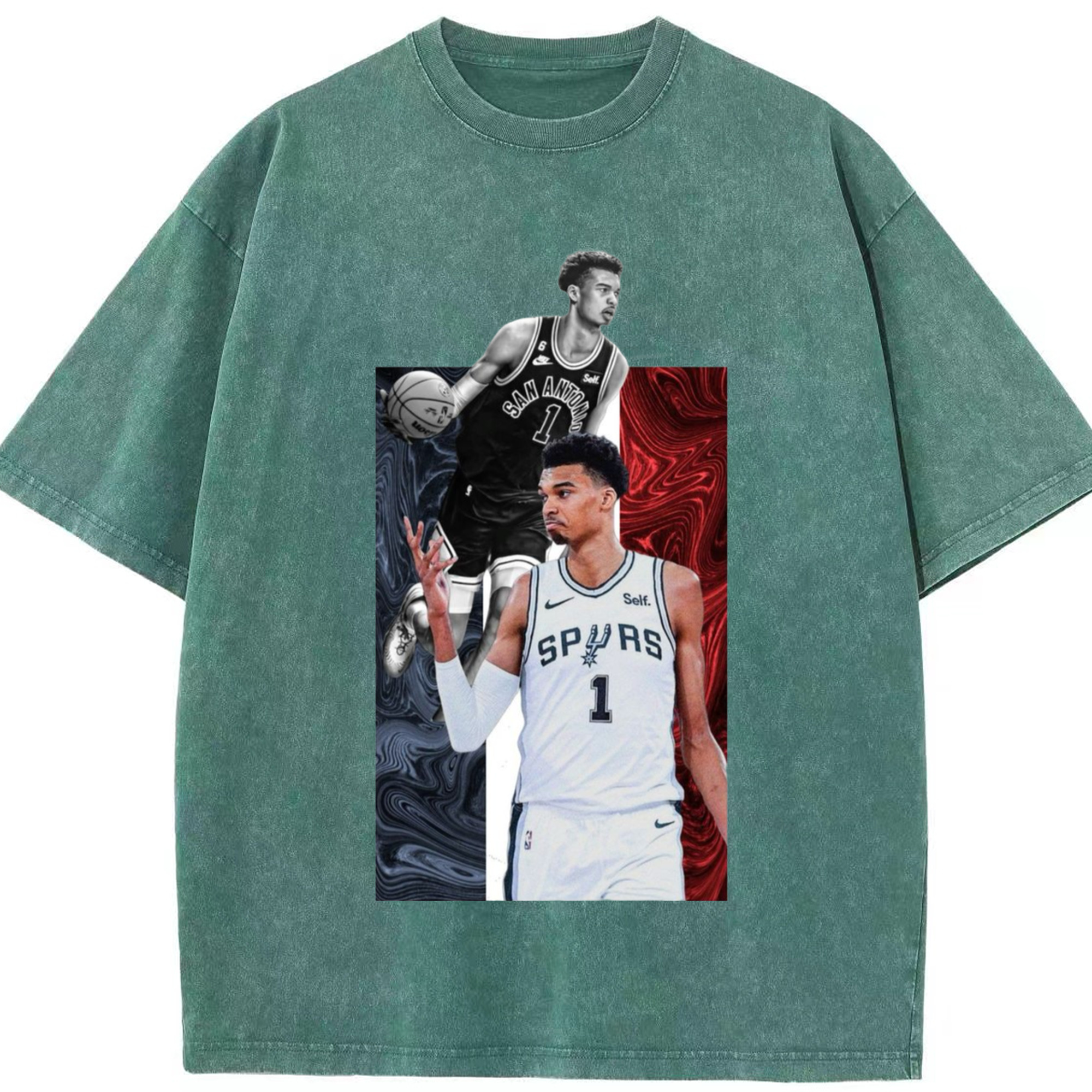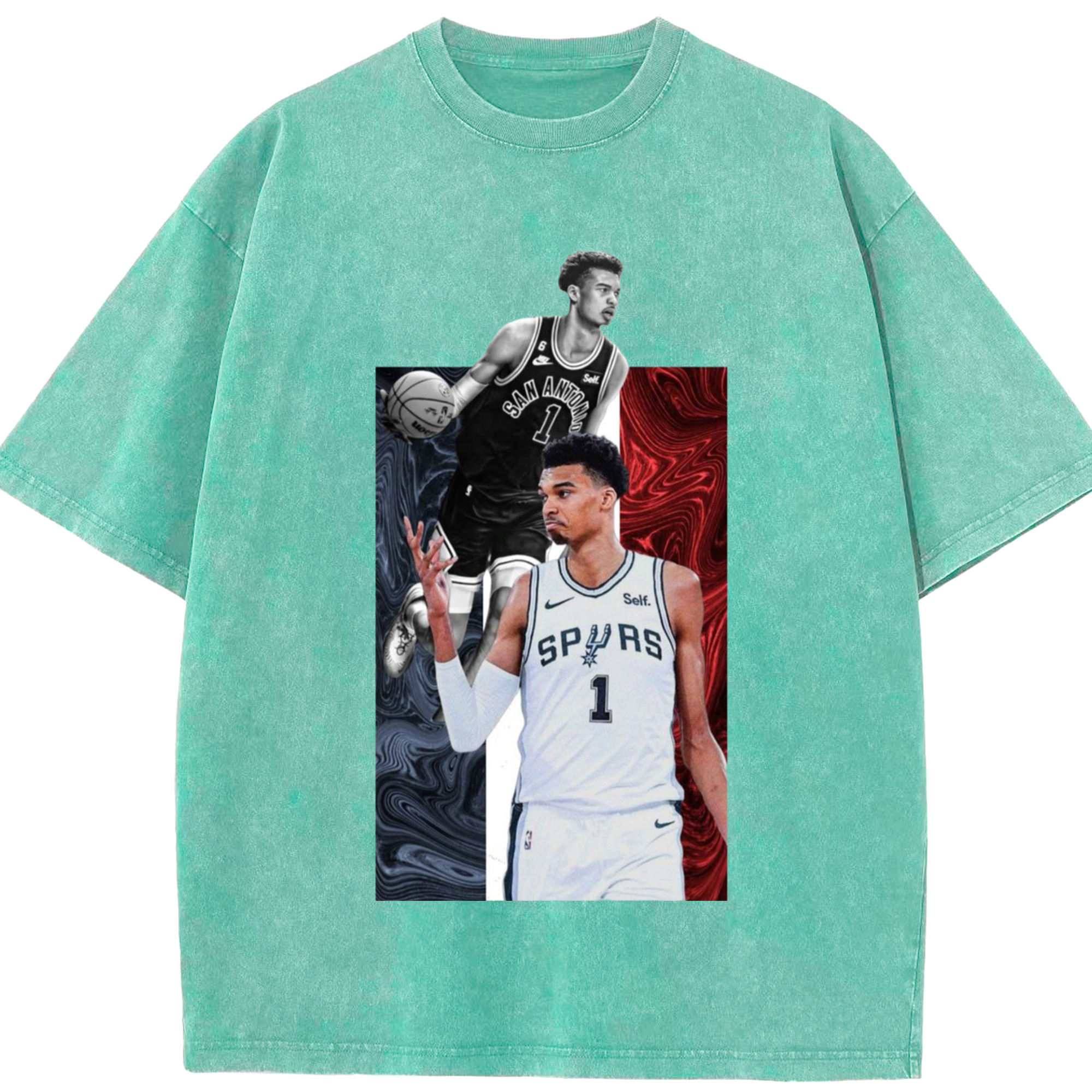 San Antonio Spurs Victor Wembanyama Tee - Washed Vintage Look 230g Cotton Oversized T-Shirt With Front Heat Transfer Print – Soft, Lightweight, Stylish Fit – Comfortable Casual Wear For Sports & Everyday Use