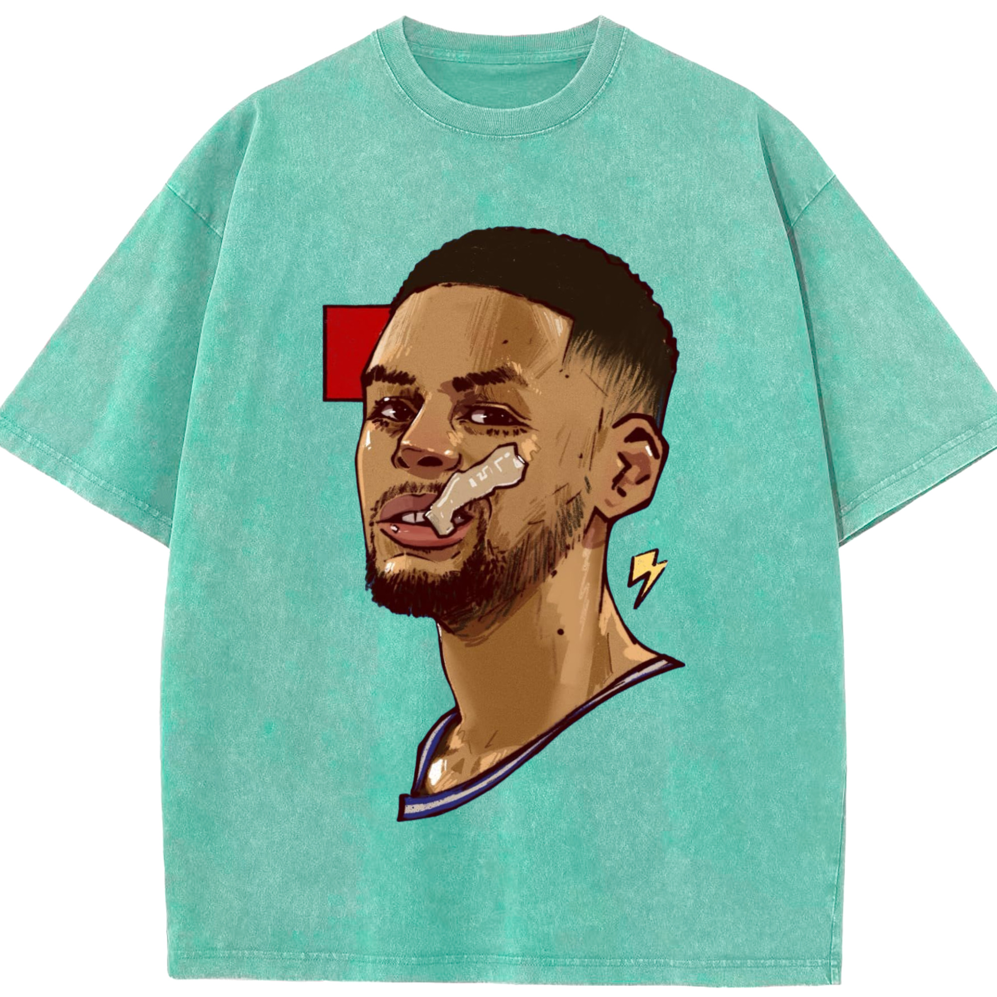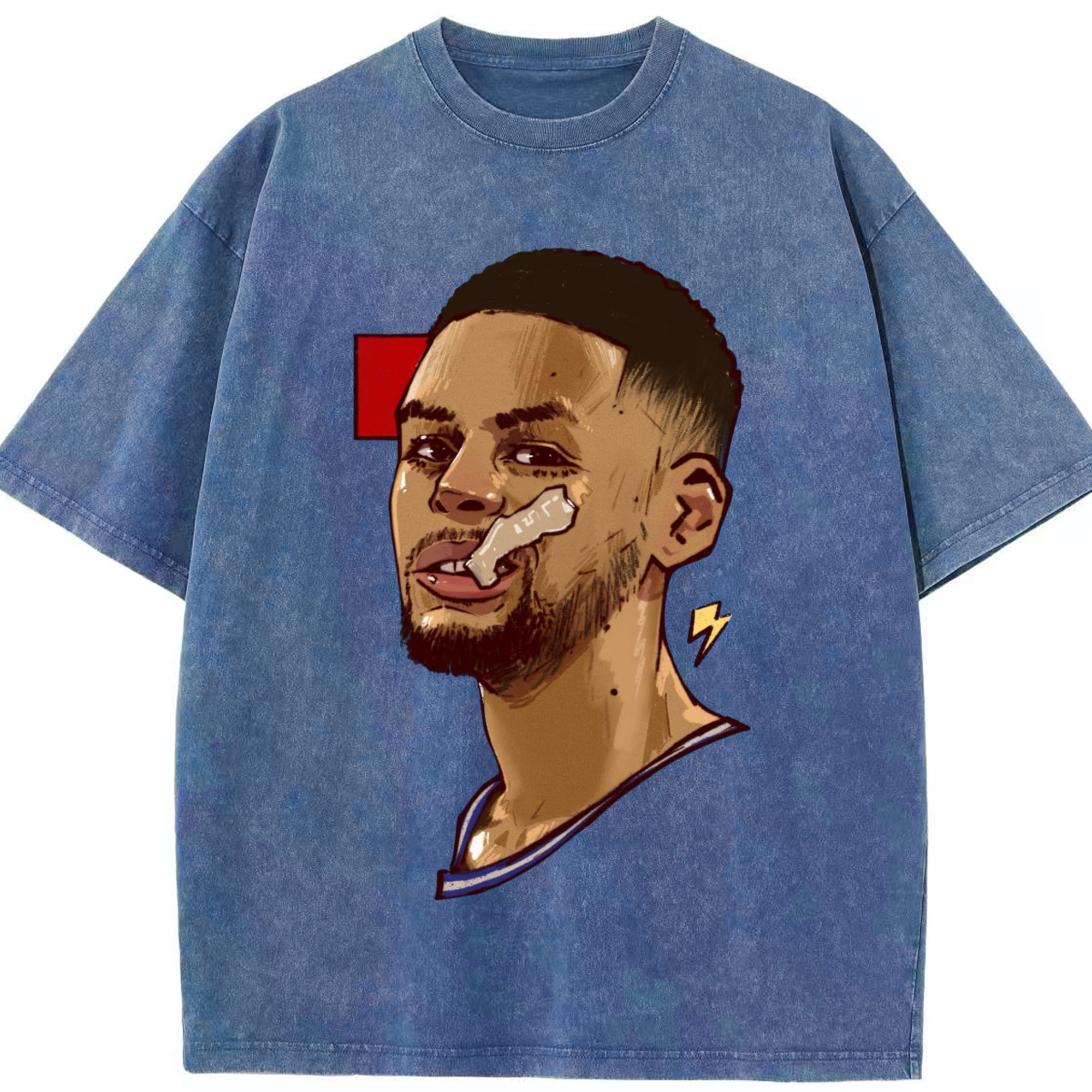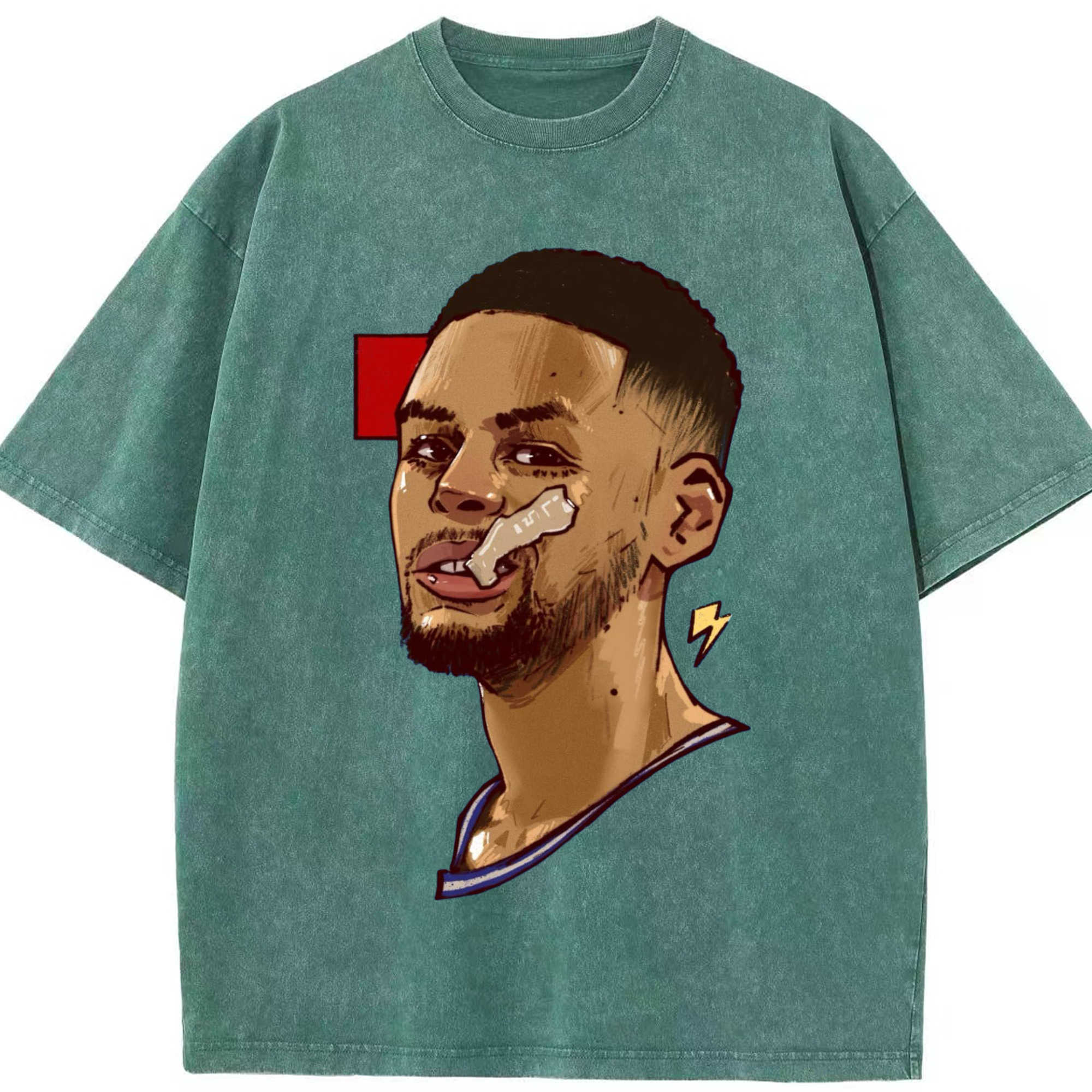 Steph Curry Golden State Warriors Cartoon profile picture t-shirt - Washed Vintage Look 230g Cotton Oversized T-Shirt With Front Heat Transfer Print – Soft, Lightweight, Stylish Fit – Comfortable Casual Wear For Sports & Everyday Use