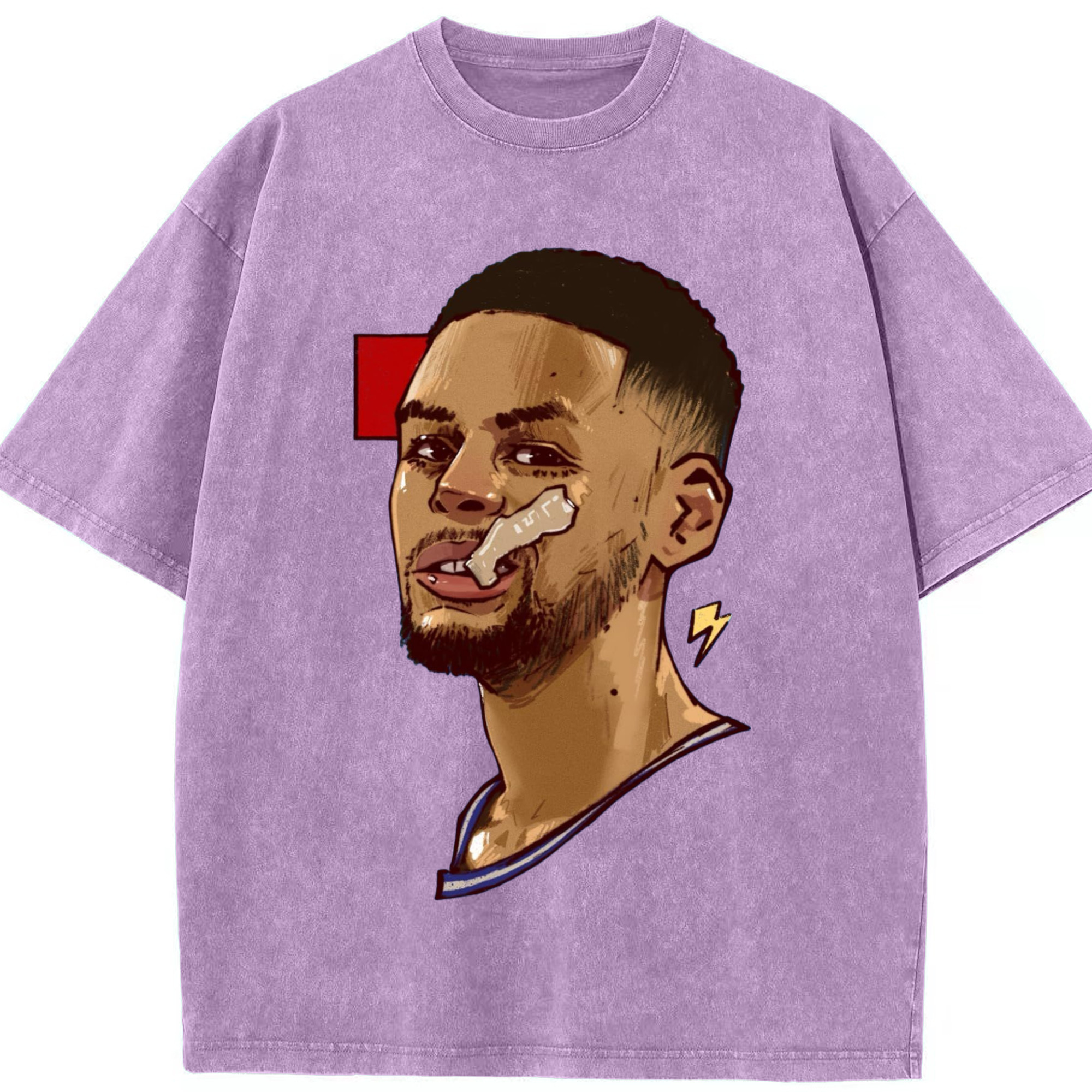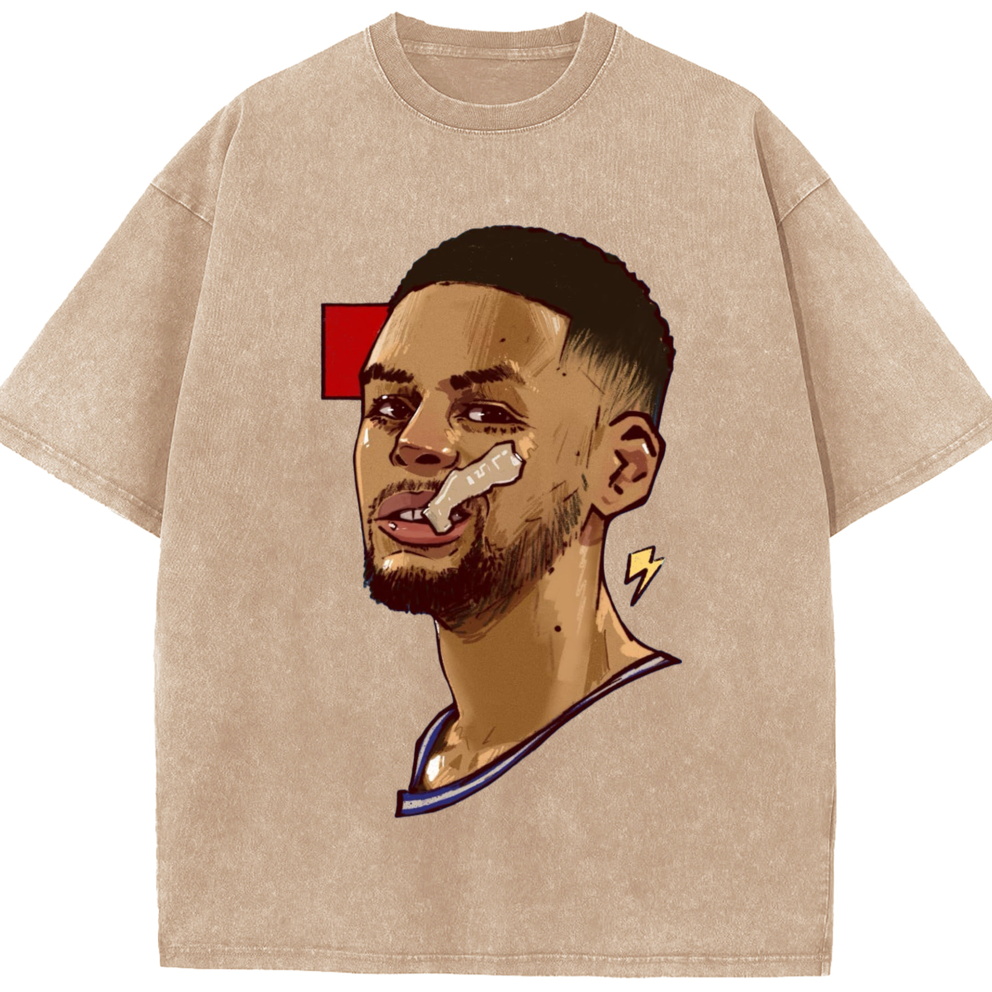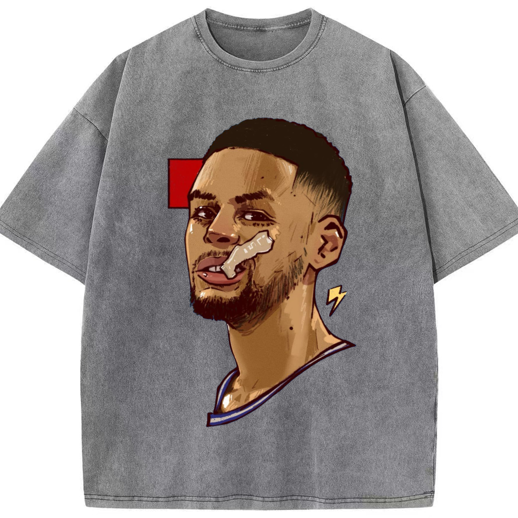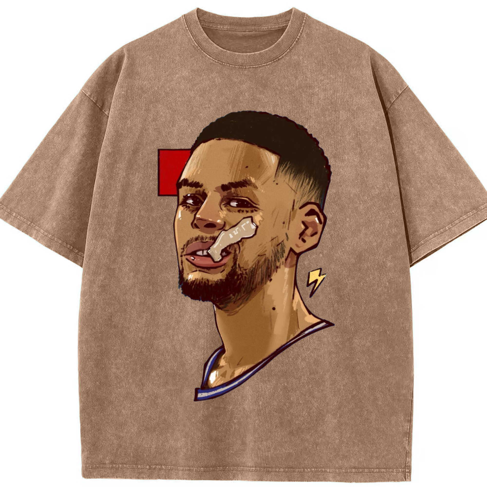 Steph Curry Golden State Warriors Cartoon profile picture t-shirt - Washed Vintage Look 230g Cotton Oversized T-Shirt With Front Heat Transfer Print – Soft, Lightweight, Stylish Fit – Comfortable Casual Wear For Sports & Everyday Use