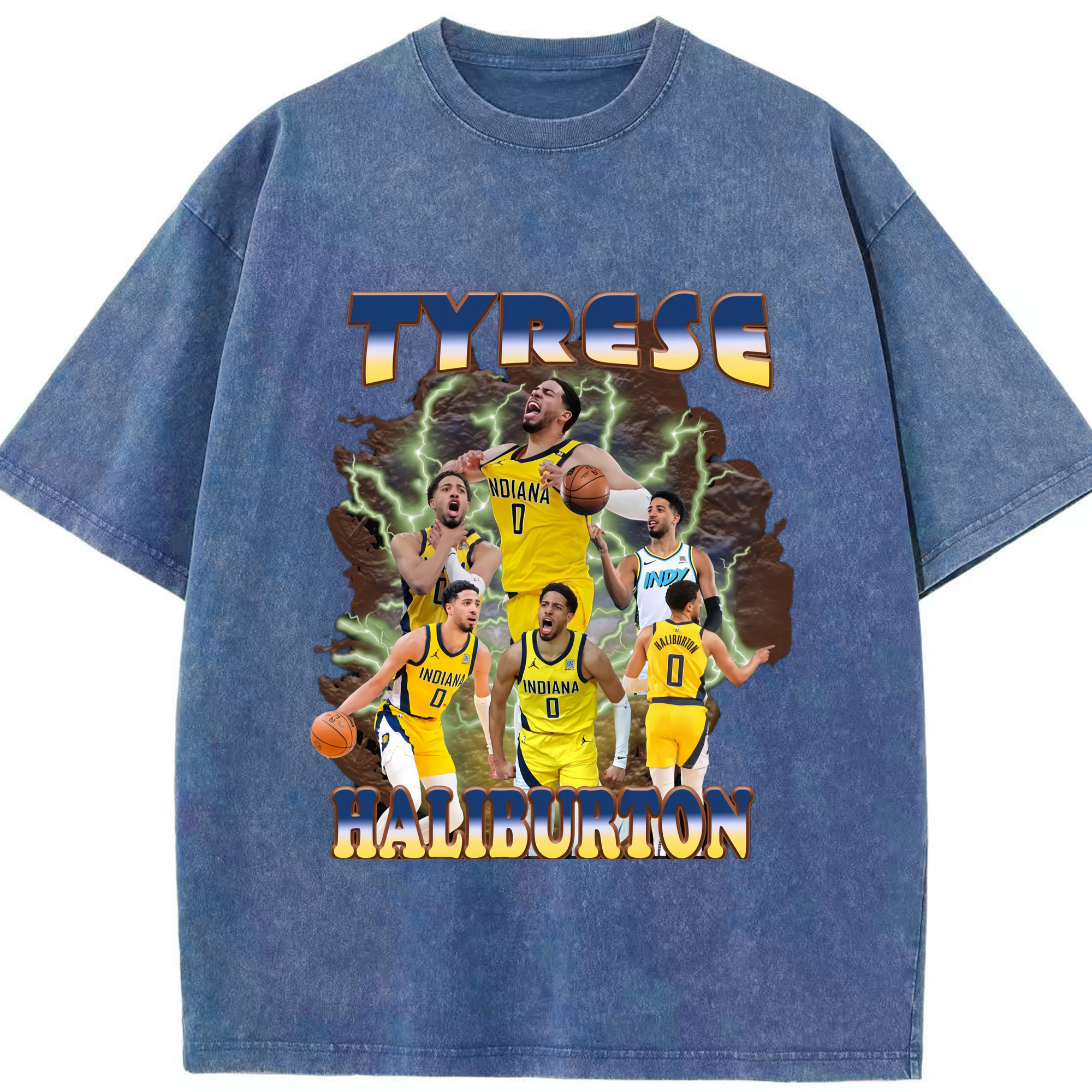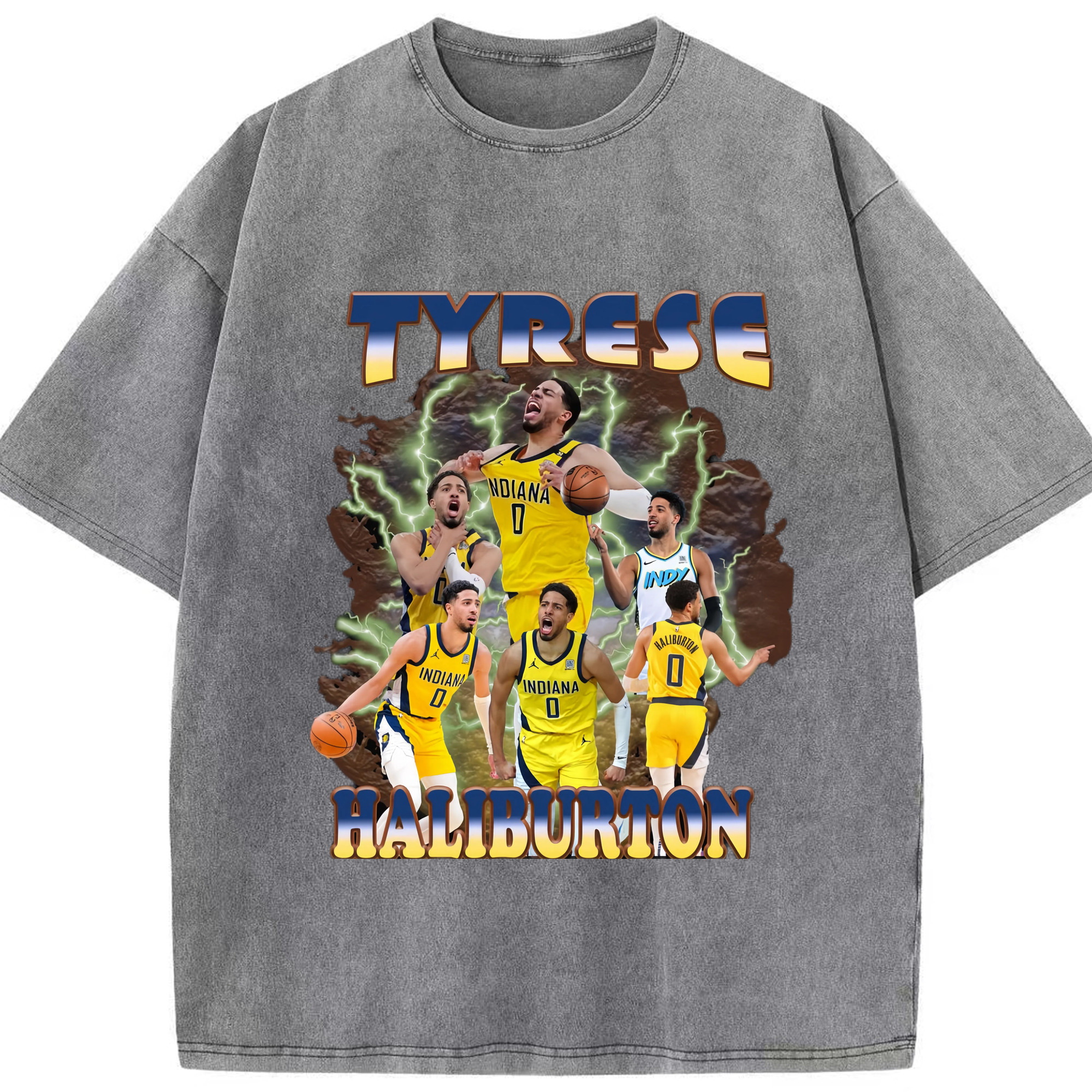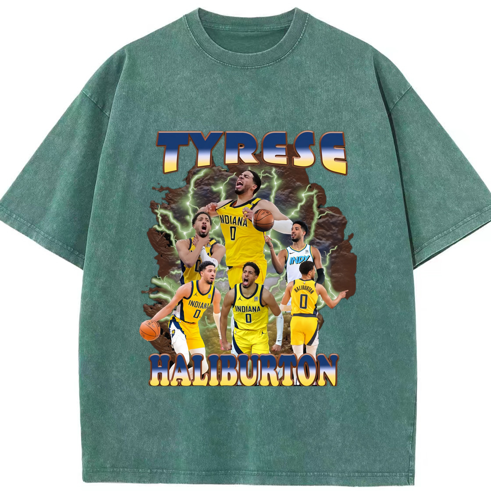 Tyrese Haliburton Indiana Pacers collage style T‑shirt - Washed Vintage Look 230g Cotton Oversized T-Shirt With Front Heat Transfer Print – Soft, Lightweight, Stylish Fit – Comfortable Casual Wear For Sports & Everyday Use