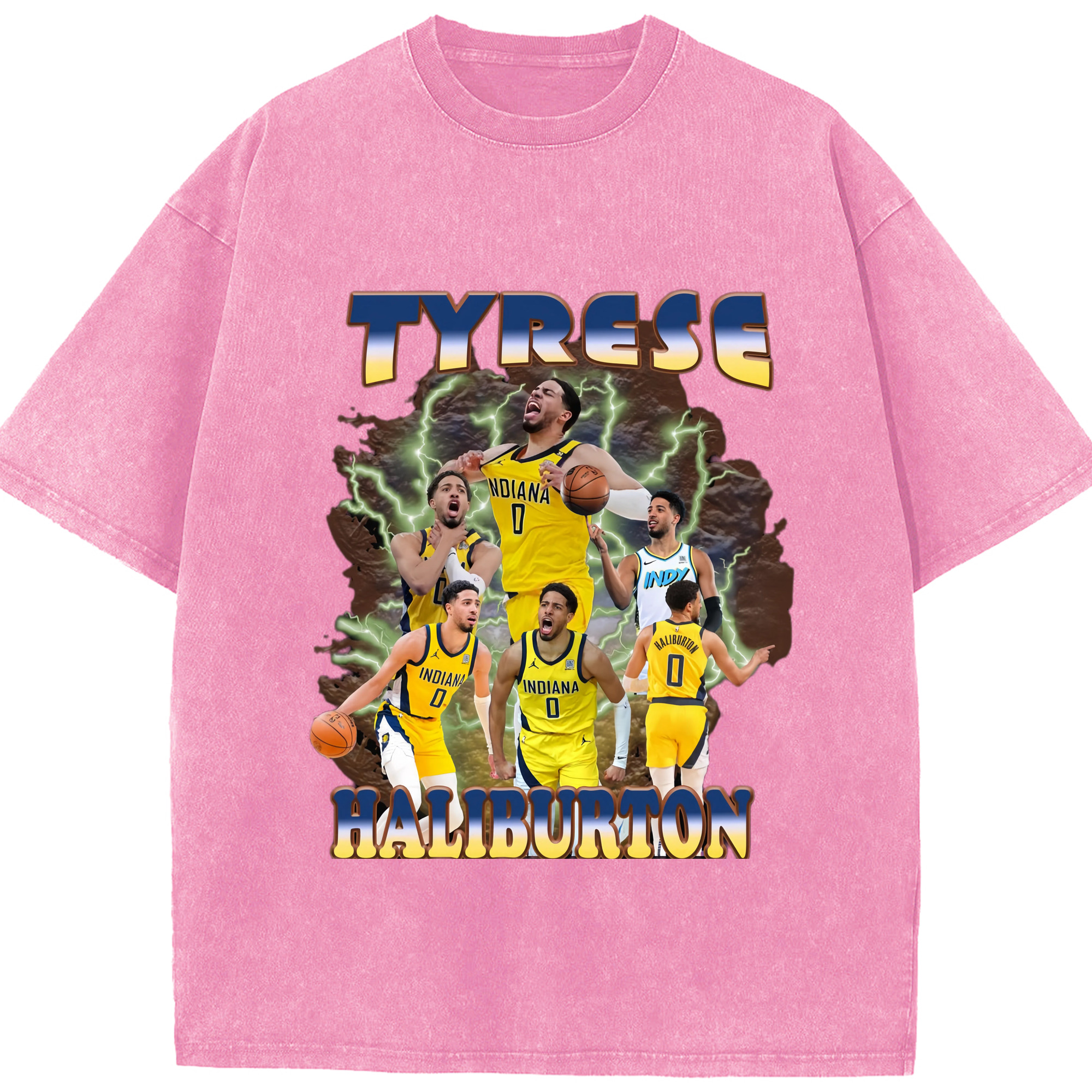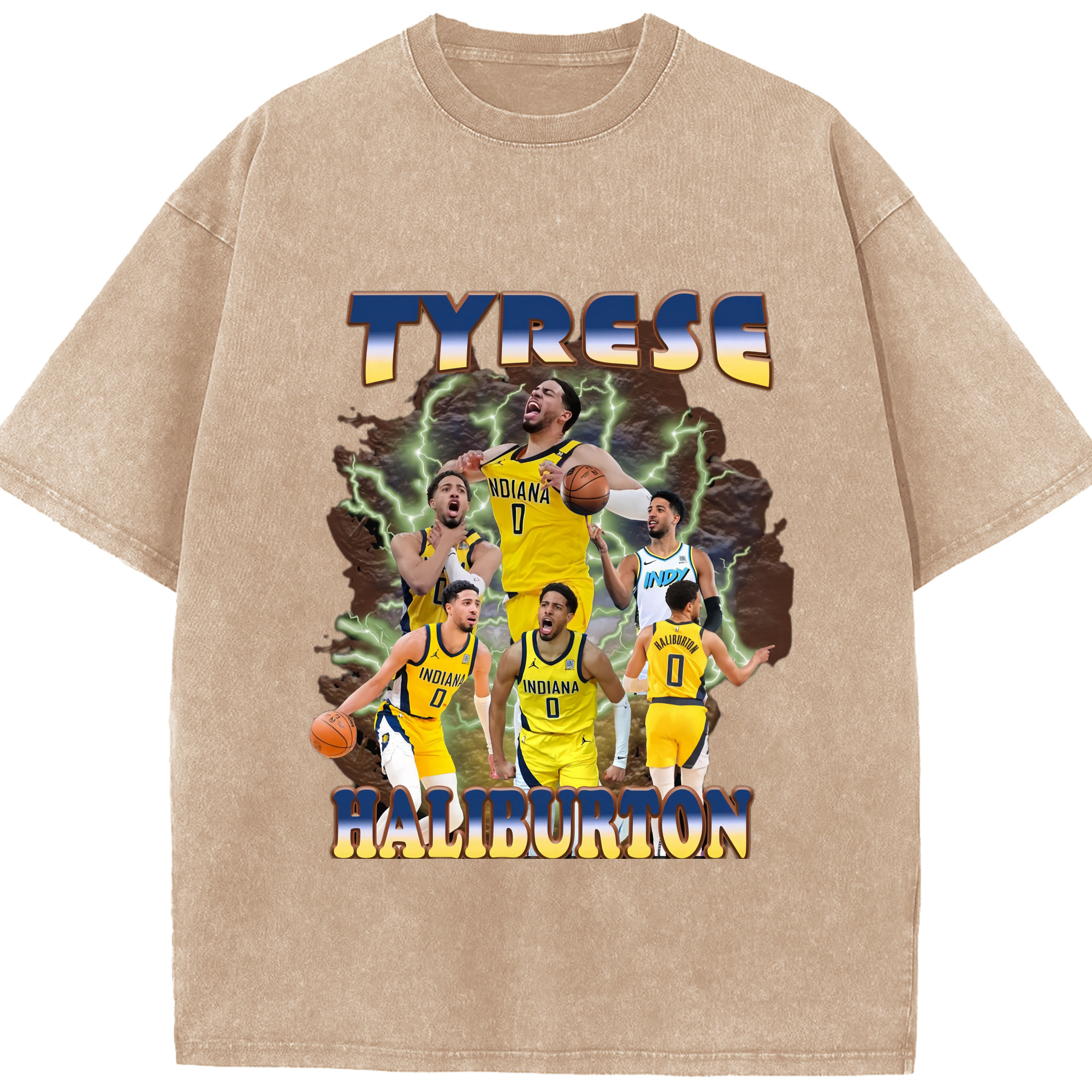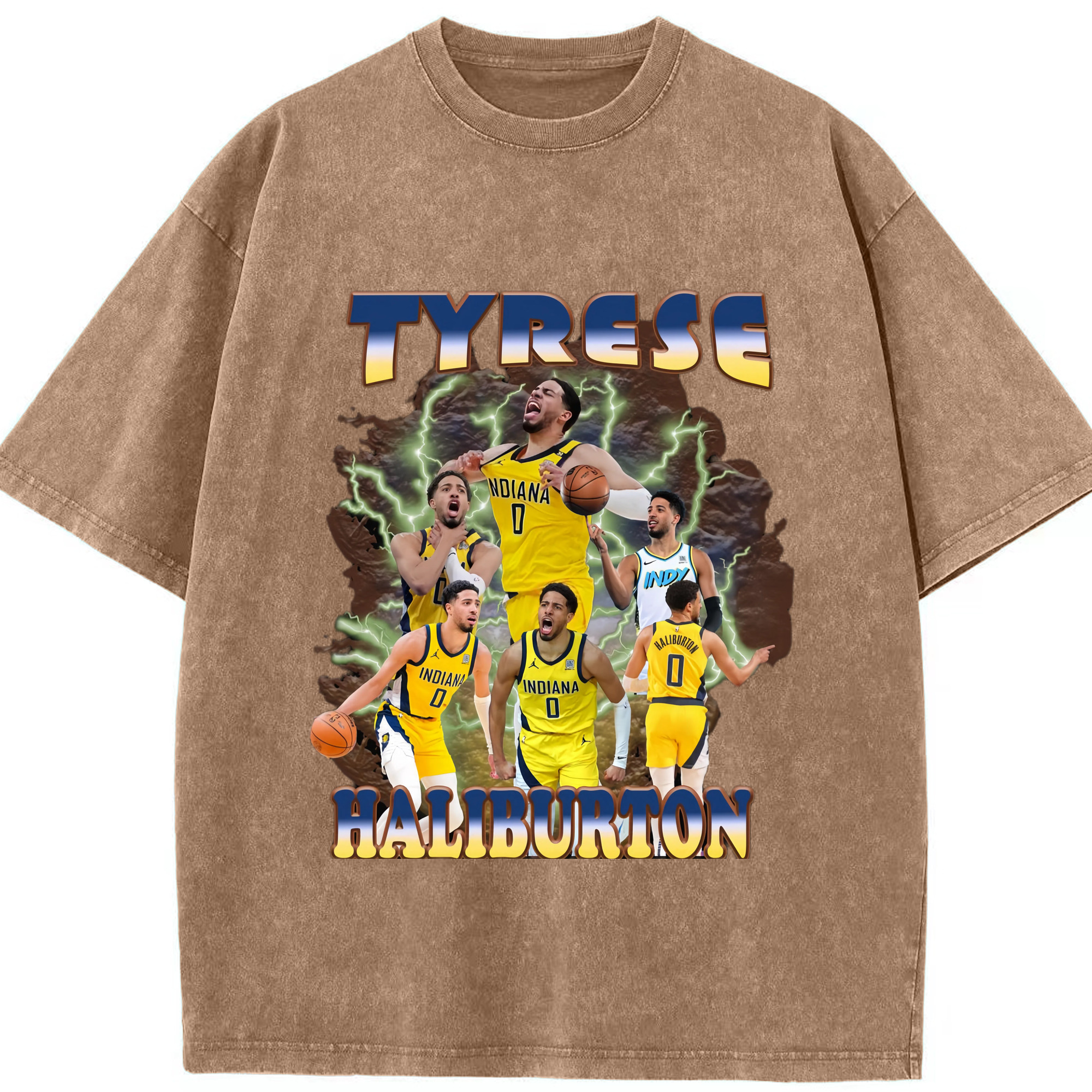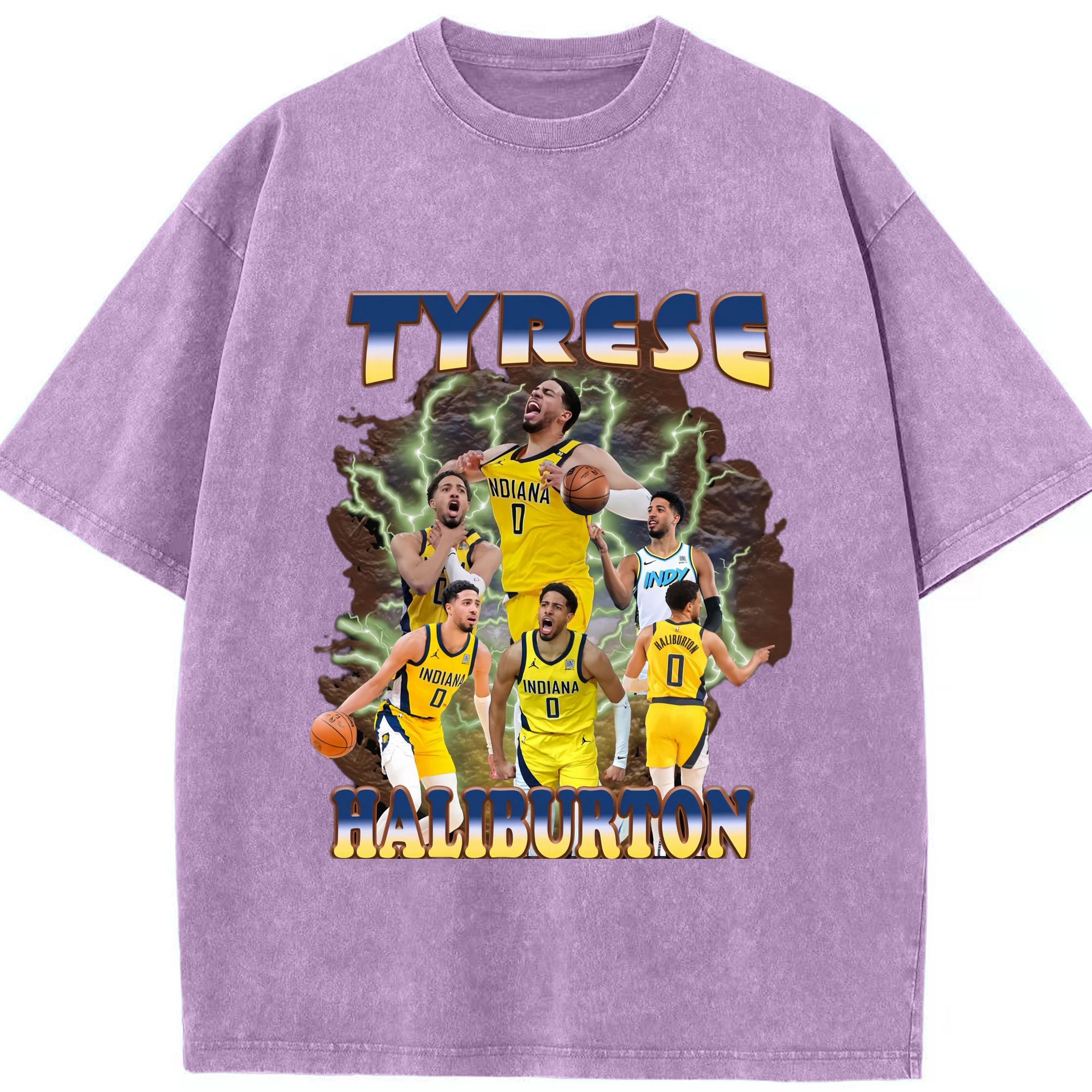 Tyrese Haliburton Indiana Pacers collage style T‑shirt - Washed Vintage Look 230g Cotton Oversized T-Shirt With Front Heat Transfer Print – Soft, Lightweight, Stylish Fit – Comfortable Casual Wear For Sports & Everyday Use